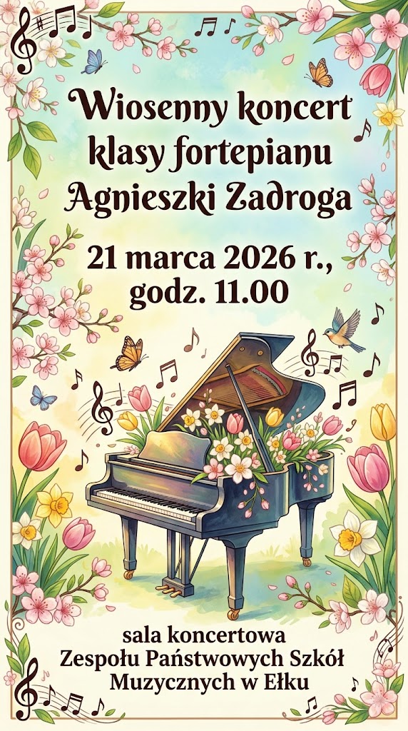 Zapraszamy serdecznie na wiosenny koncert uczniów klasy fortepianu Agnieszki Zadroga.
