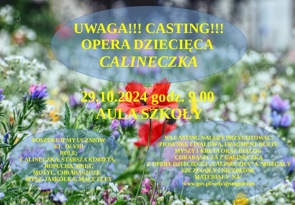 Serdecznie zapraszamy uczniów klas IV - VIII POSM w Gnieźnie do udziału w castingu do przedstawienia operowego "Calineczka" A. Mozgały. Premiera odbędzie się na przełomie kwietnia i maja 2025 roku.
