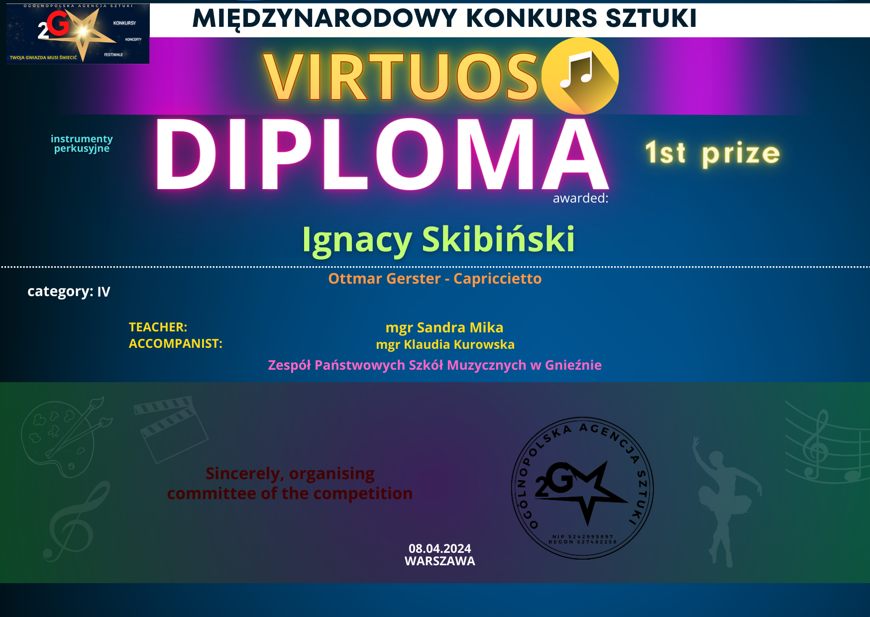 Miło nam poinformować, że uczniowie z klasy perkusji p. Sandry Miki: Iga Tarnogrodzka z I klasy POSM I stopnia oraz Ignacy Skibiński z IV klasy PSM II stopnia zdobyli pierwsze miejsca w swoich kategoriach wiekowych (II i IV) w Międzynarodowym Konkursie Sztuki Virtuoso w Warszawie. Perkusistom przy fortepianie towarzyszyła p. Klaudia Kurowska.