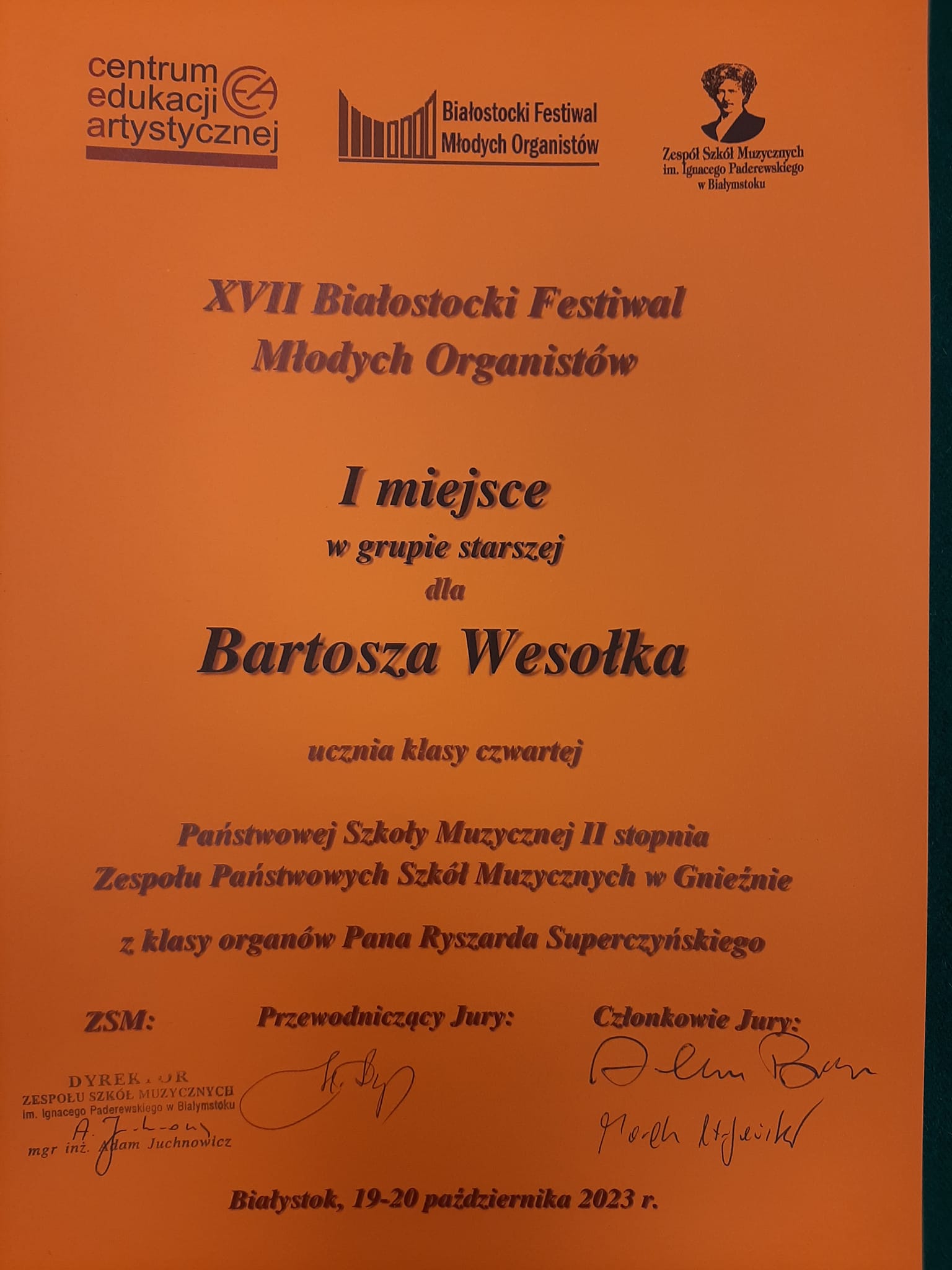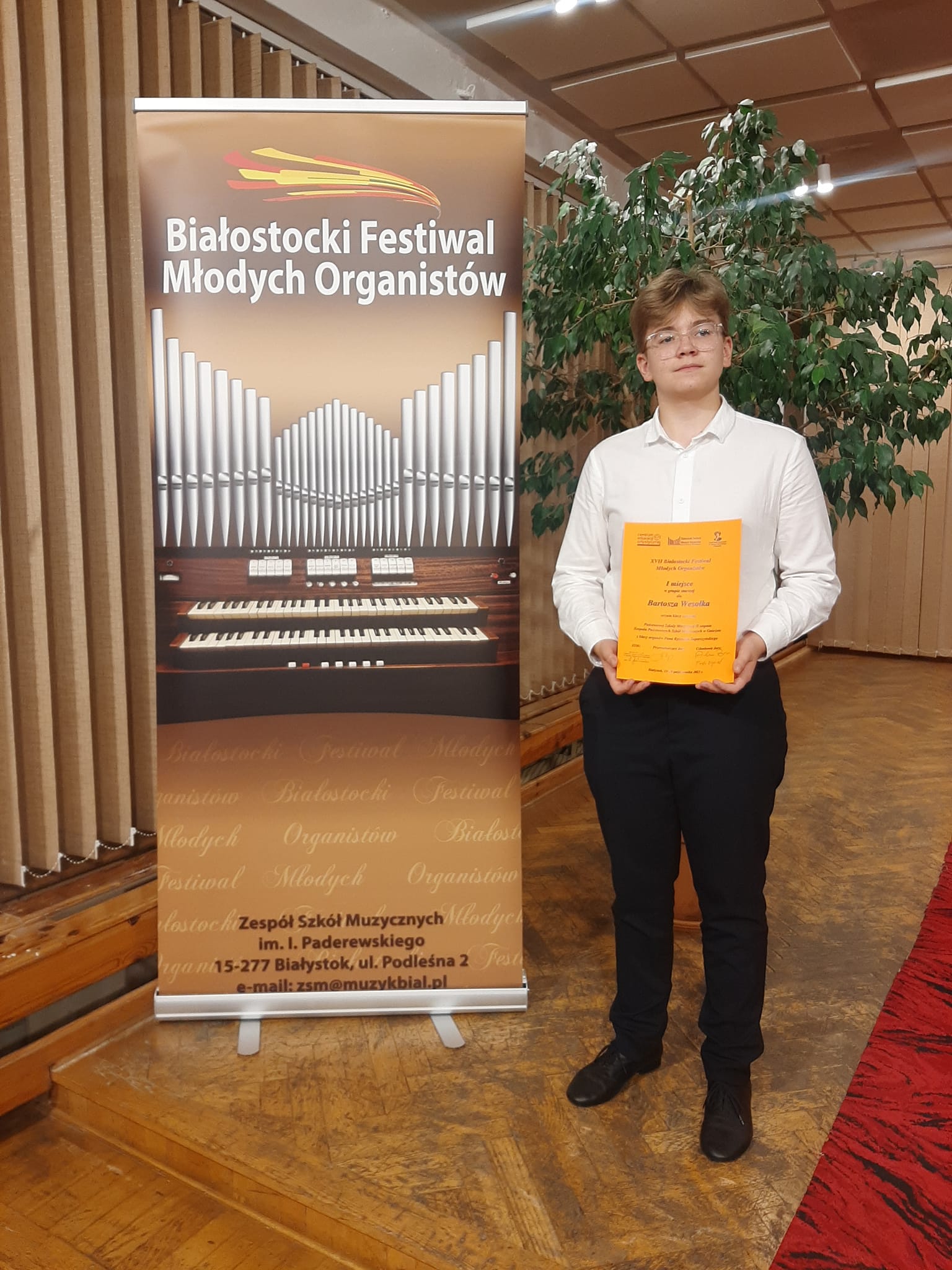 Kolejny wielki sukces w sekcji instrumentów klawiszowych! Bartosz Wesołek, uczeń klasy organów mgr Ryszarda Superczyńskiego, zajął I miejsce w grupie starszej podczas XVII Białostockiego Festiwalu Młodych Organistów. Serdecznie gratulujemy!