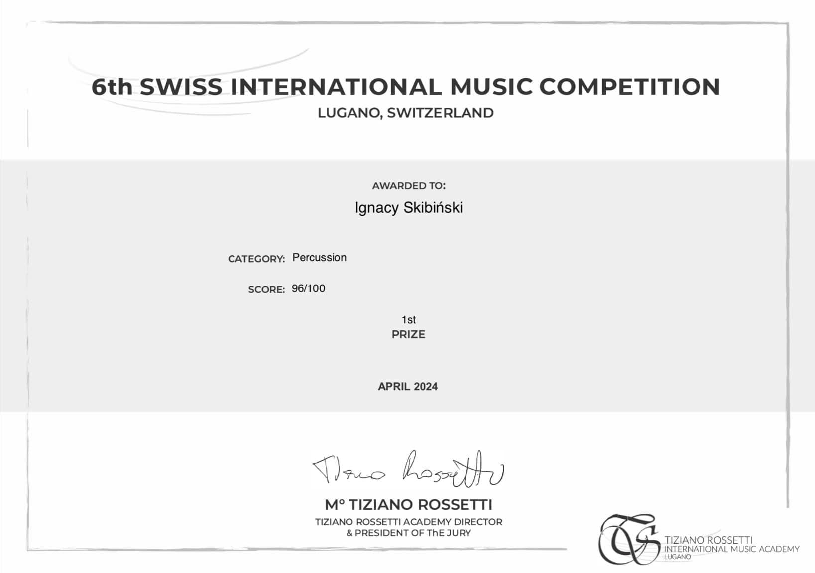 I miejsce Ignacego Skibińskiego na 6 Szwajcarskim Międzynarodowym Konkursie Muzycznym w Lugano