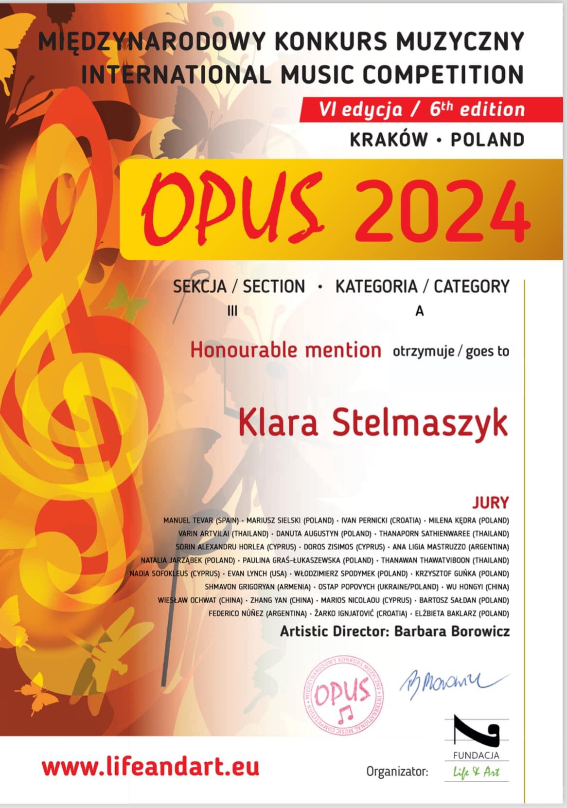 Uczennica Pana Jakuba Majdy Klara Stelmaszyk zdobyła wyróżnienie na Międzynarodowym Konkursie Opus 2024. Brawo!