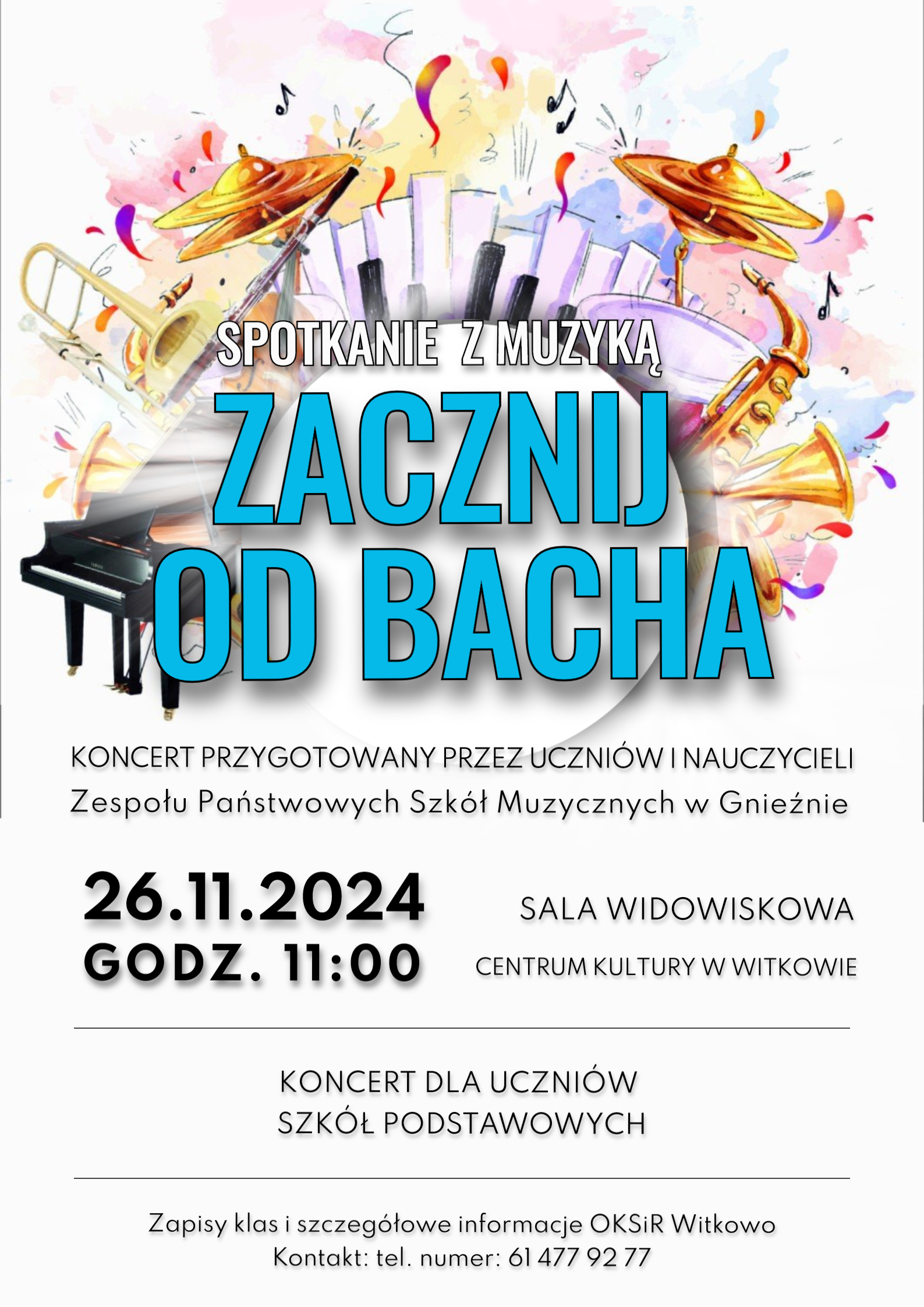 Serdecznie zapraszamy na spotkanie z muzyką pt."Zacznij od Bacha", które odbędzie się 26.11.2024r. w sali widowiskowej Centrum Kultury w Witkowie. Szczegóły na plakacie.