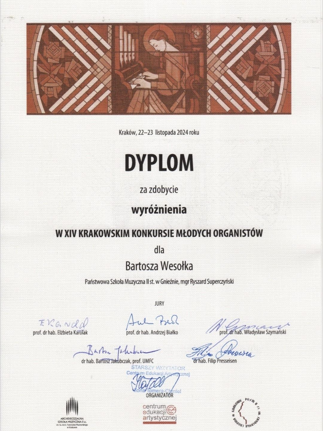 Bartosz Wesołek z klasy organów mgra Ryszarda Superczyńskiego otrzymał wyróżnienie w XIV Krakowskim Konkursie Młodych Organistów. Gratulacje!!!