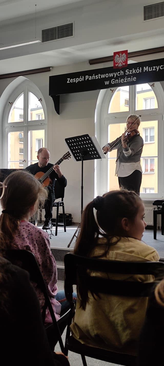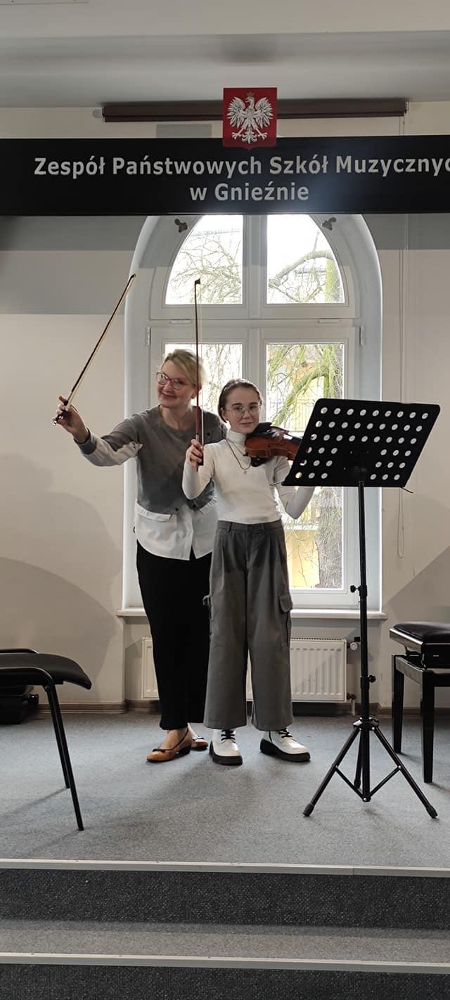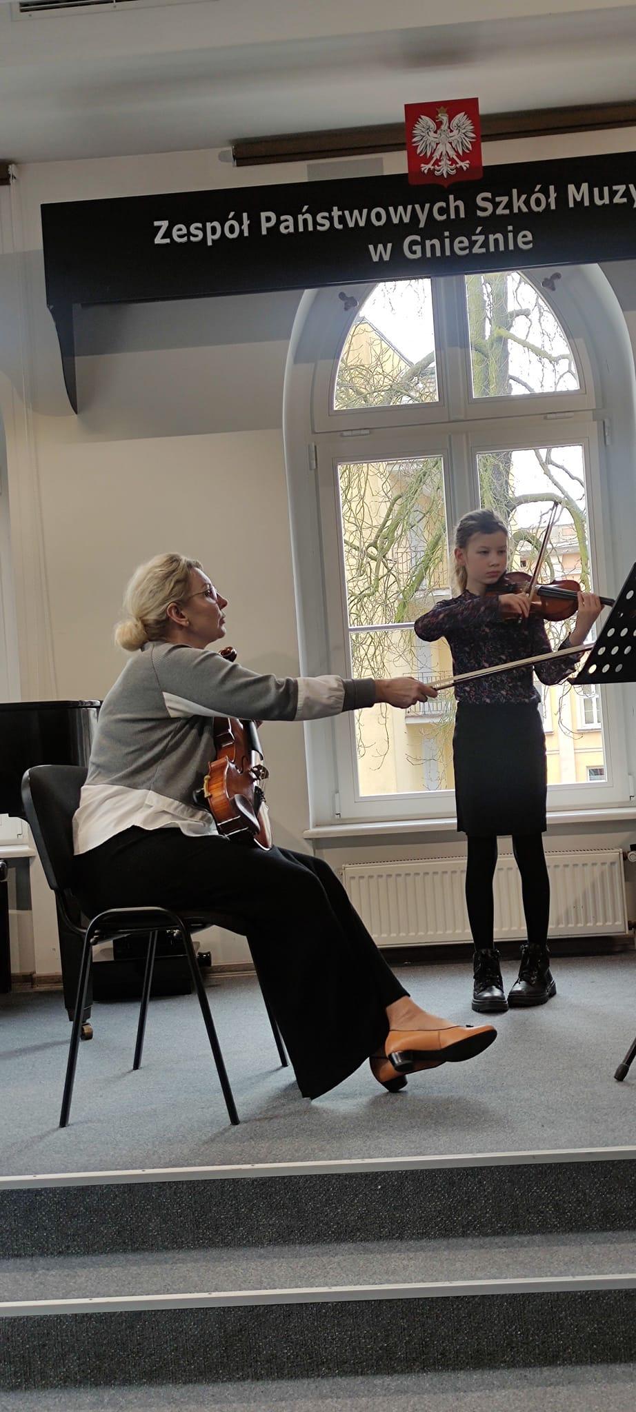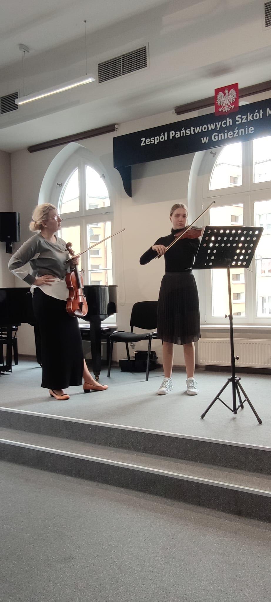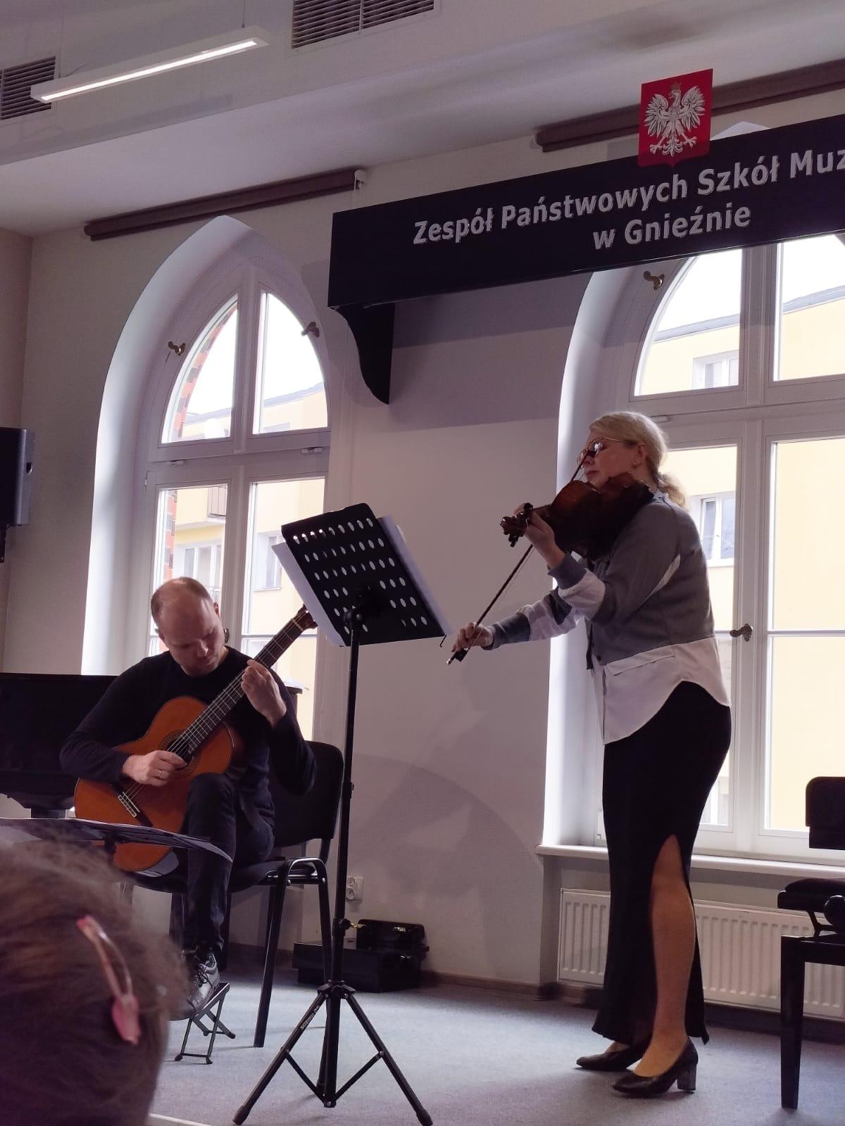 Dzisiejszy poniedziałek w Sekcji Instrumentów Smyczkowych i Szarpanych rozpoczął się niezwykłym wydarzeniem, które wprawiło nas w wyjątkowy nastrój. Koncert niezwykłego duetu dr hab. Ewy Guzowskiej (altówka) i dr. hab. Tomasza Kandulskiego (gitara) okazał się inspirującym przeżyciem, które towarzyszyło nam przez całe późniejsze Warsztaty Skrzypcowo - Altówkowe, prowadzone przez dr hab. Ewę Guzowską, profesor Akademii Muzycznej w Poznaniu. Pani Profesor nie tylko dzieliła się swoją wiedzą, lecz także z pasją ukazywała nam, jak doskonalić nasze umiejętności. To niezapomniane doświadczenie z pewnością zmotywuje nas do jeszcze większego zaangażowania w grę na instrumentach!