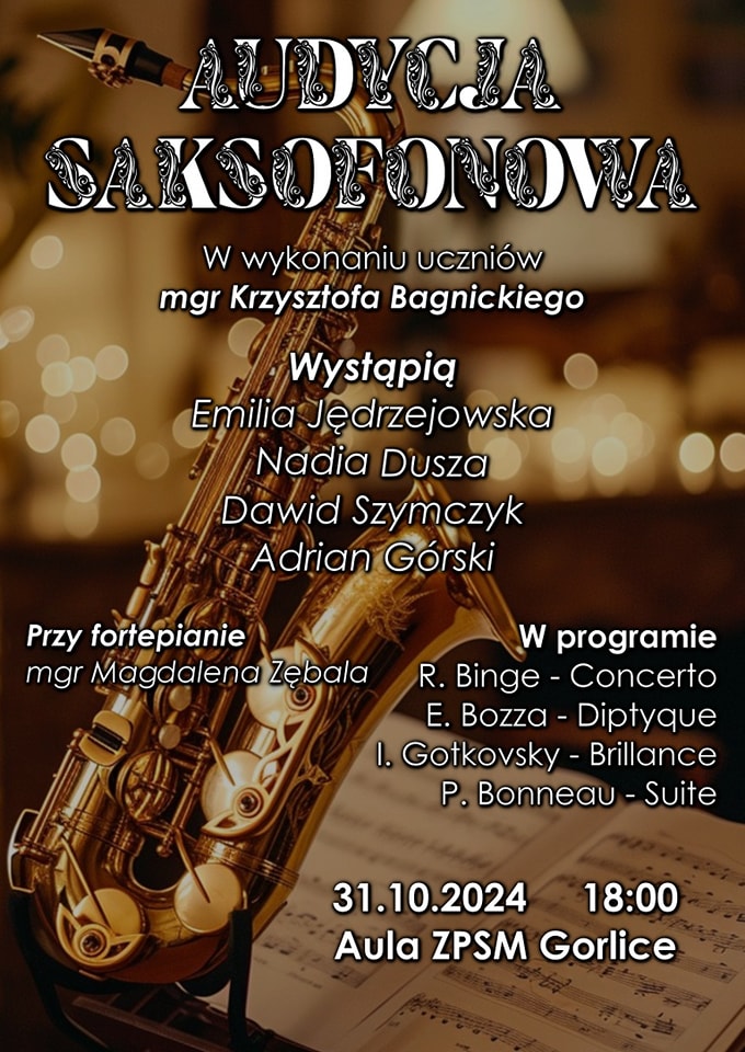 W piątek 31 października 2024 r. w Auli ZPSM odbyła się audycja saksofonowa, w której wystąpili uczniowie z klasy saksofonu Pana Krzysztofa Bagnickiego.