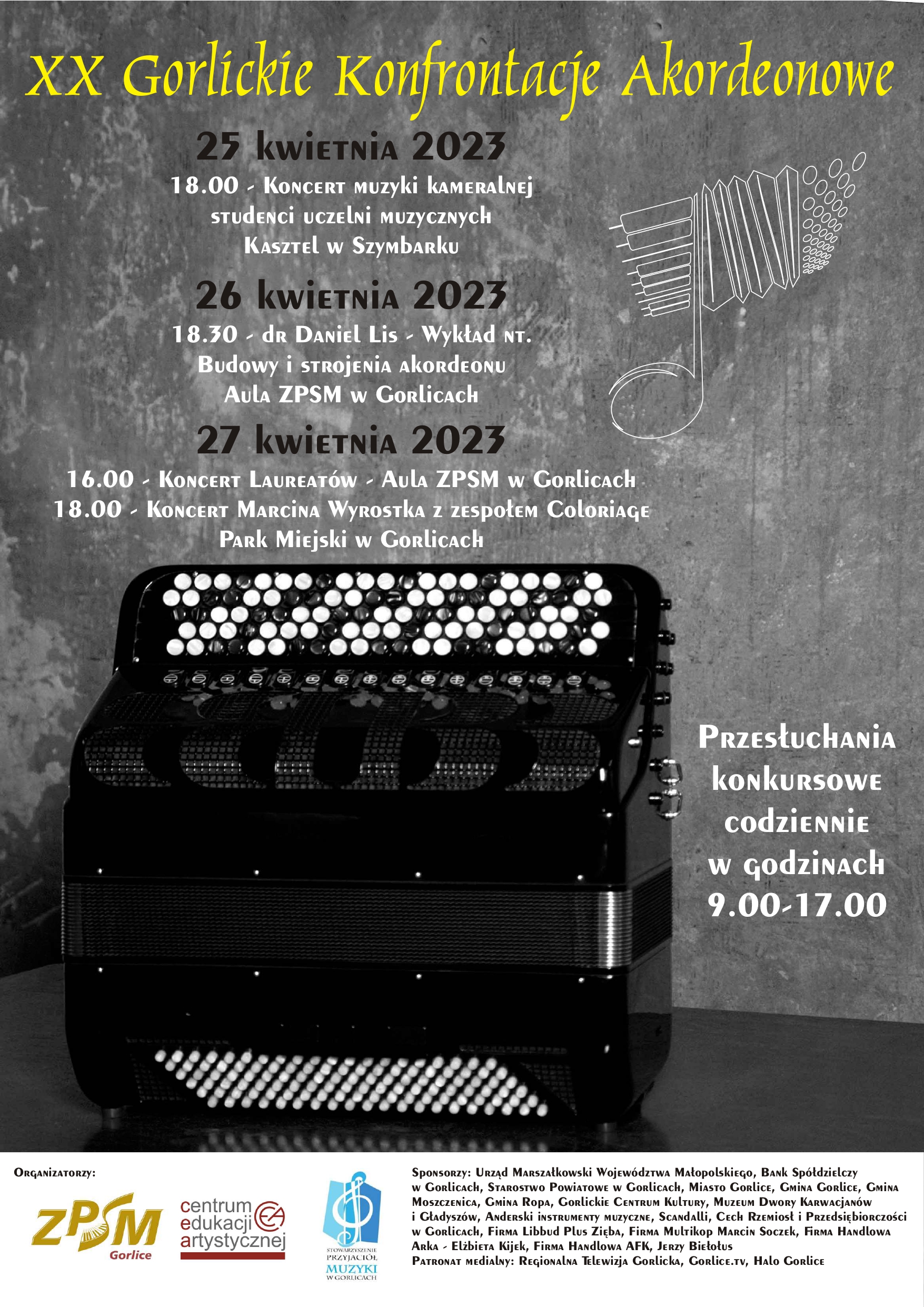 Zapraszamy do udziału w XX Gorlickich Konfrontacjach Akordeonowych, które odbędą się w dniach 25-27 kwietnia 2023 roku w ZPSM w Gorlicach. Regulamin oraz elektroniczny formularz zgłoszenia jest dostępny pod adresem: https://www.gov.pl/web/zpsmgorlice/gorlickie-konfrontacje-akordeonowe3 lub na profilu Gorlickich Konfrontacji Akordeonowych na Facebooku. Serdecznie zapraszamy!