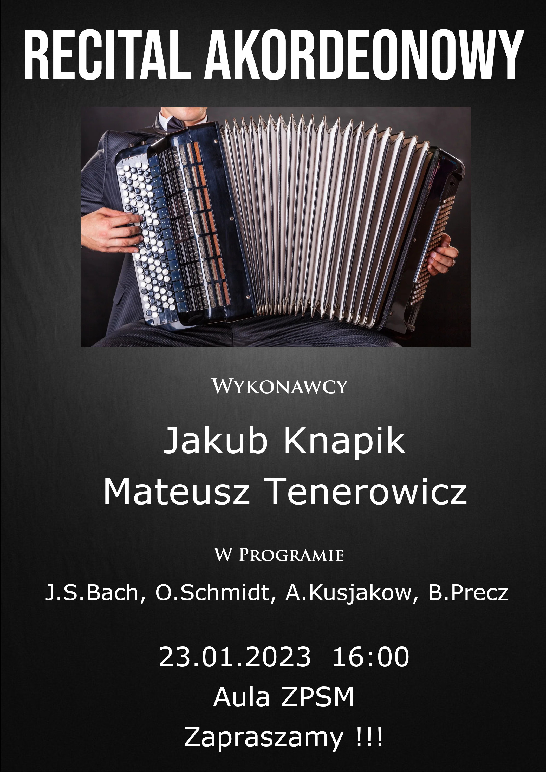 Serdecznie zapraszamy na koncert muzyki akordeonowej, który odbędzie sie 23 stycznia 2023 roku o godz. 16.00.