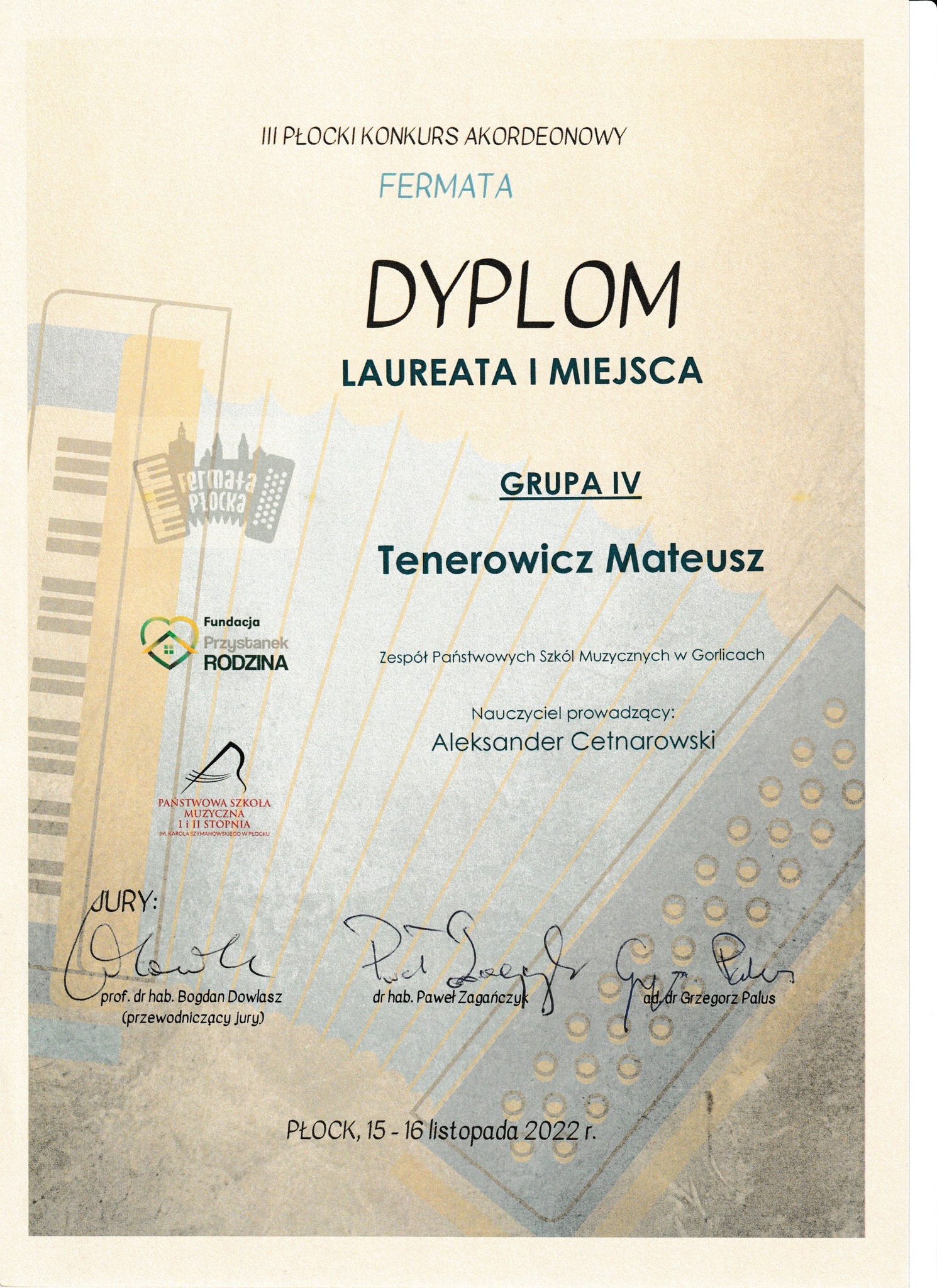 Mateusz Tenerowicz został laureatem I Miejsca na Konkursie Akordeonowym Fermata w Płocku. Serdecznie gratulujemy!