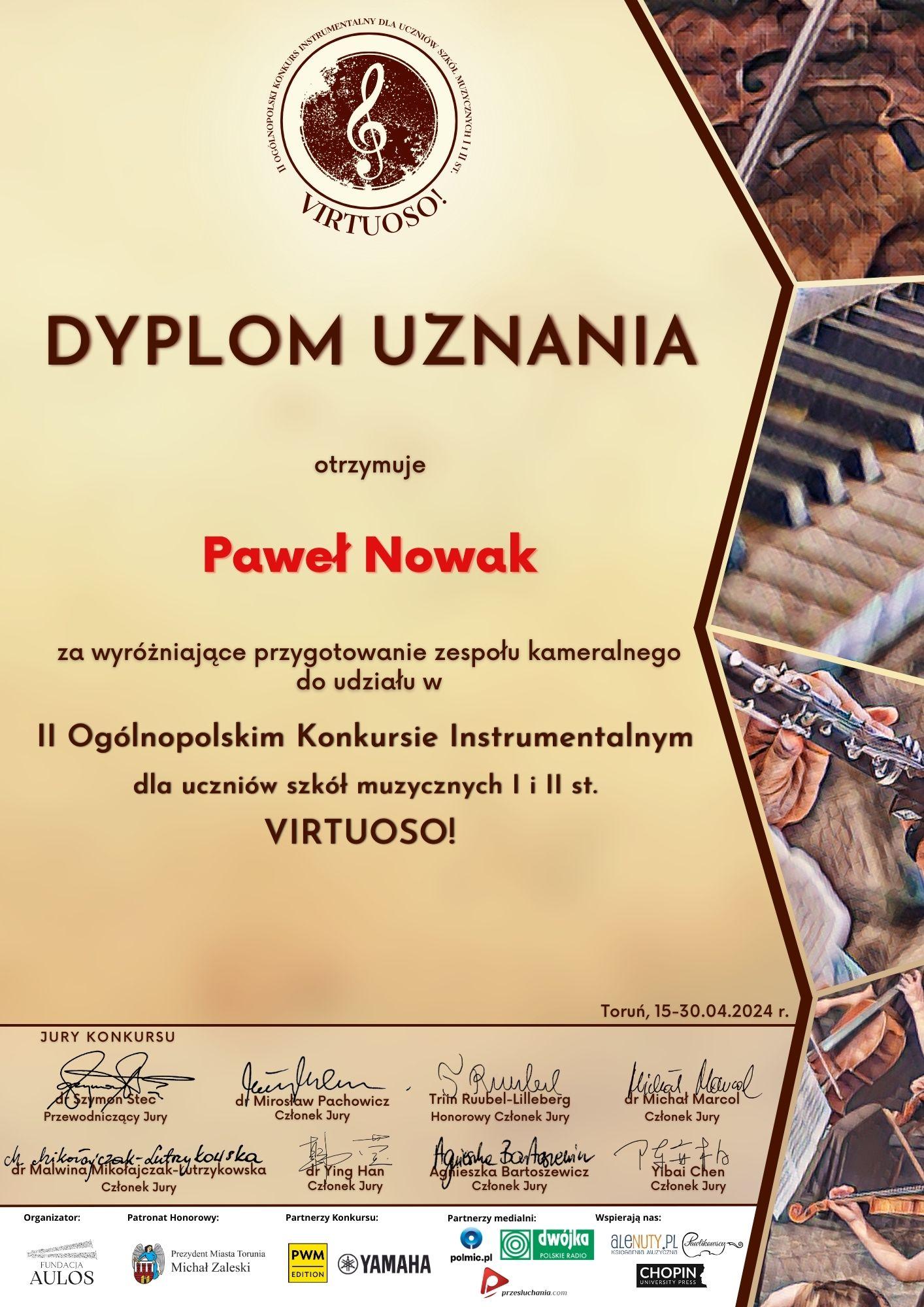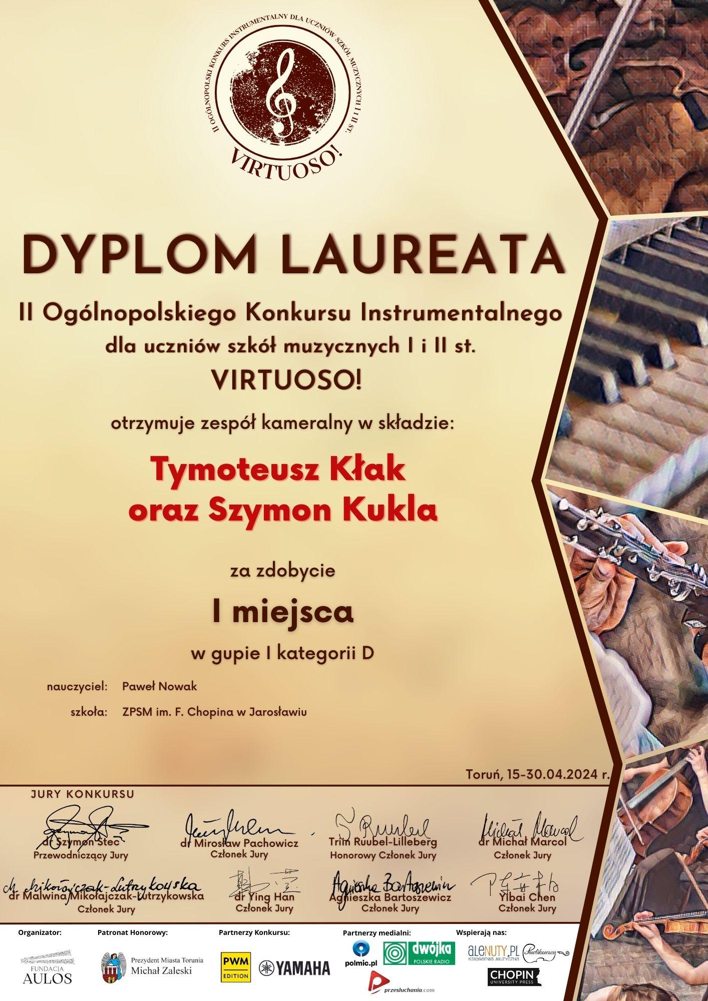 W dniach 15-30.04.2024 w Toruniu odbył się on-line II Ogólnopolski Konkurs Instrumentalny dla uczniów szkół muzycznych I i II st. VIRTUOSO. Z radością informujemy, że duet akordeonowy Tymoteusz Kłak, Szymon Kukla prowadzony przez Pana Pawła Nowaka zdobył I miejsce, otrzymując drugą punktację w kategorii zespołów kameralnych spośród 31 zespołów z całej Polski. Gratulujemy !!!