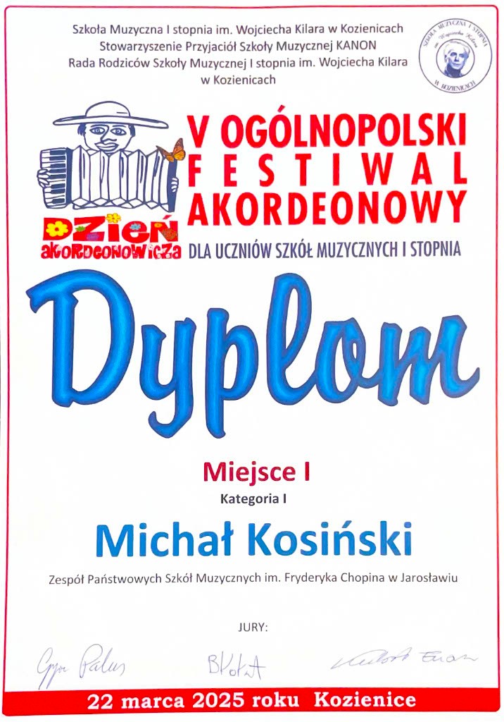 Wielki sukces odnieśli młodzi akordeoniści z Zespołu Państwowych Szkół Muzycznych im. F. Chopina w Jarosławiu podczas V Ogólnopolskiego Festiwalu Akordeonowego, który odbył się 22 marca br. w Szkole Muzycznej I stopnia im. W. Kilara w Kozienicach.
