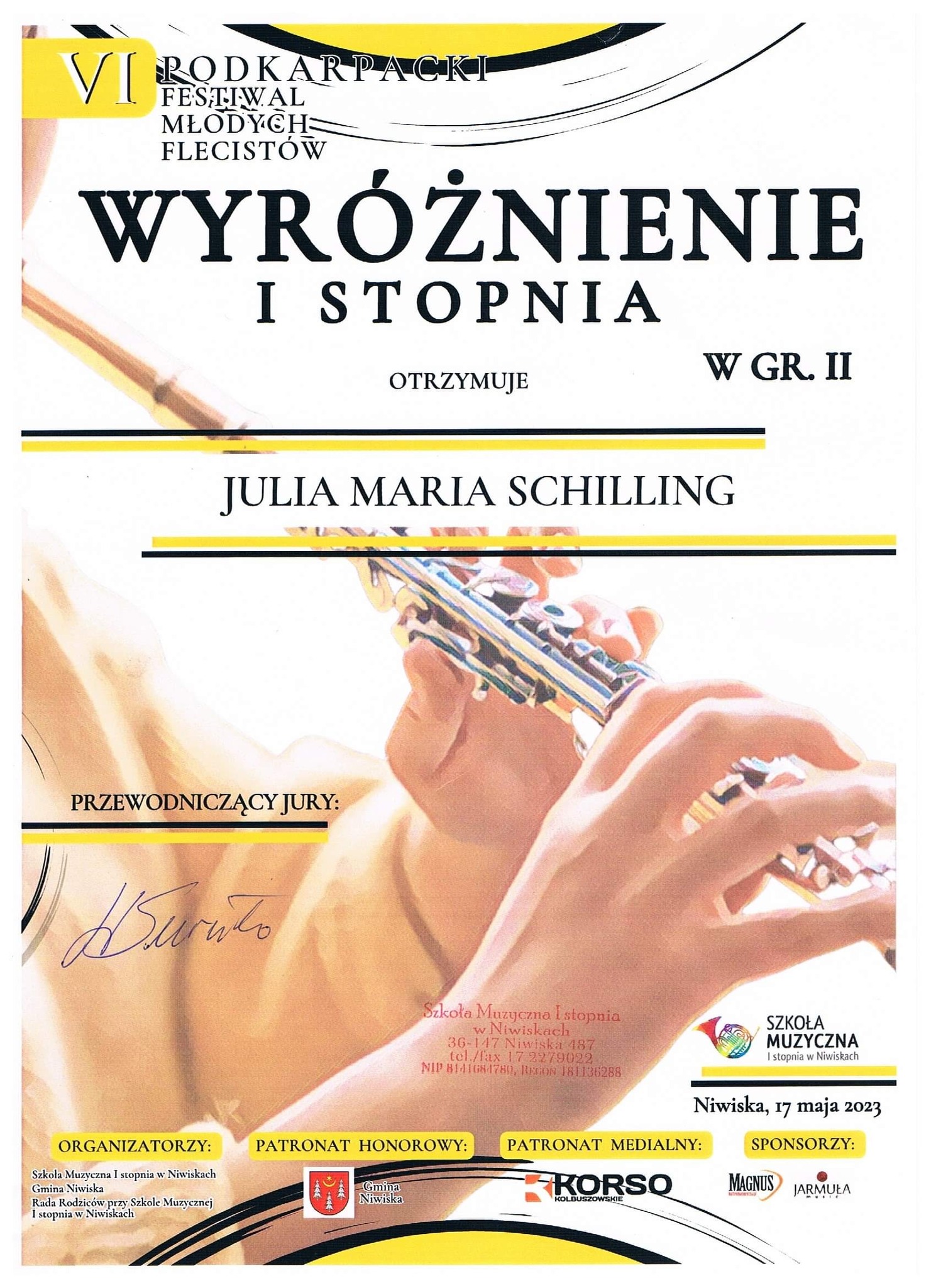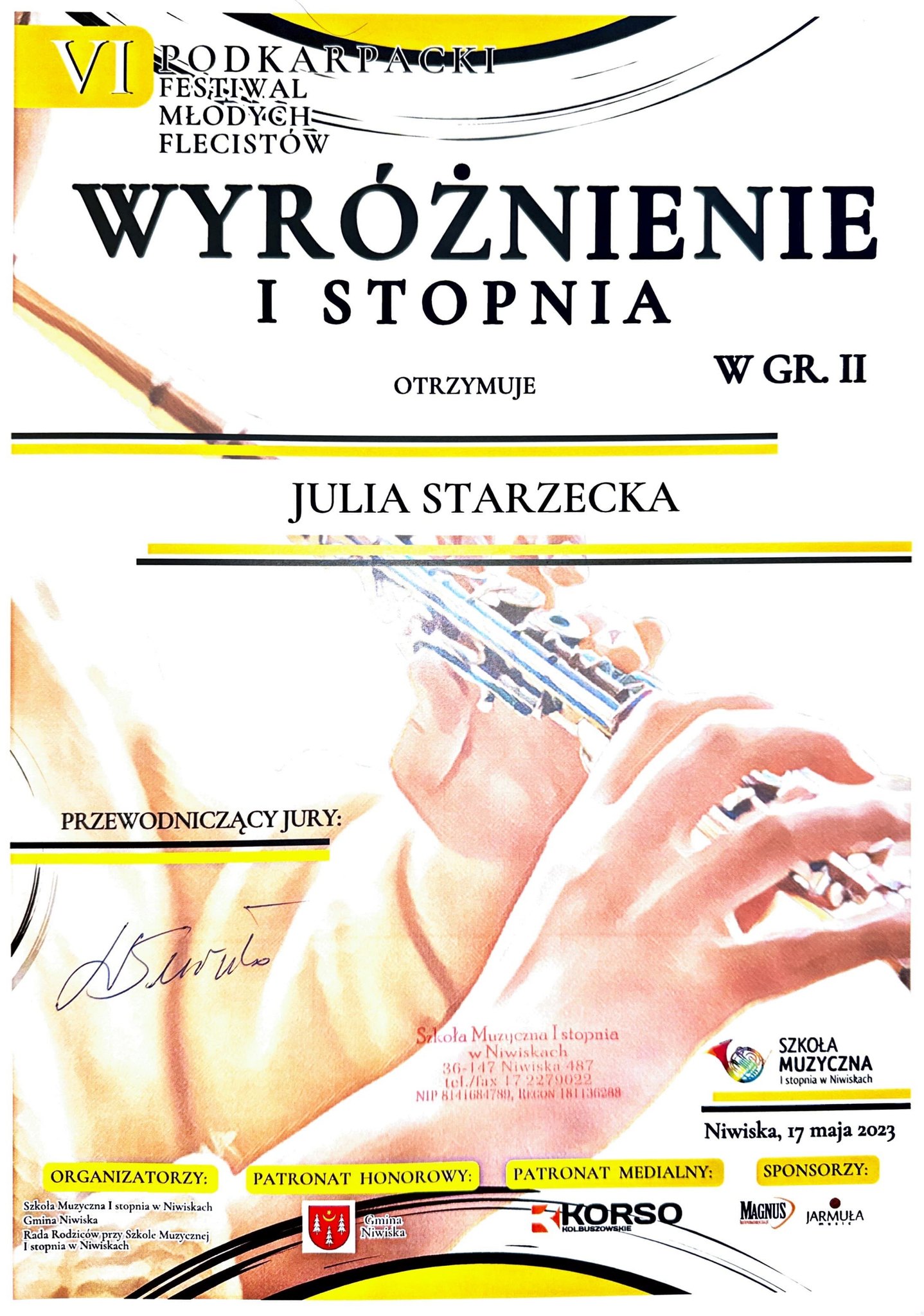 Dyplom oraz nagroda za wyróżnienie pierwszego stopnia na I Podkarpackim Festiwalu Młodych Flecistów w Niwiskach - 17 maja 2023 r.