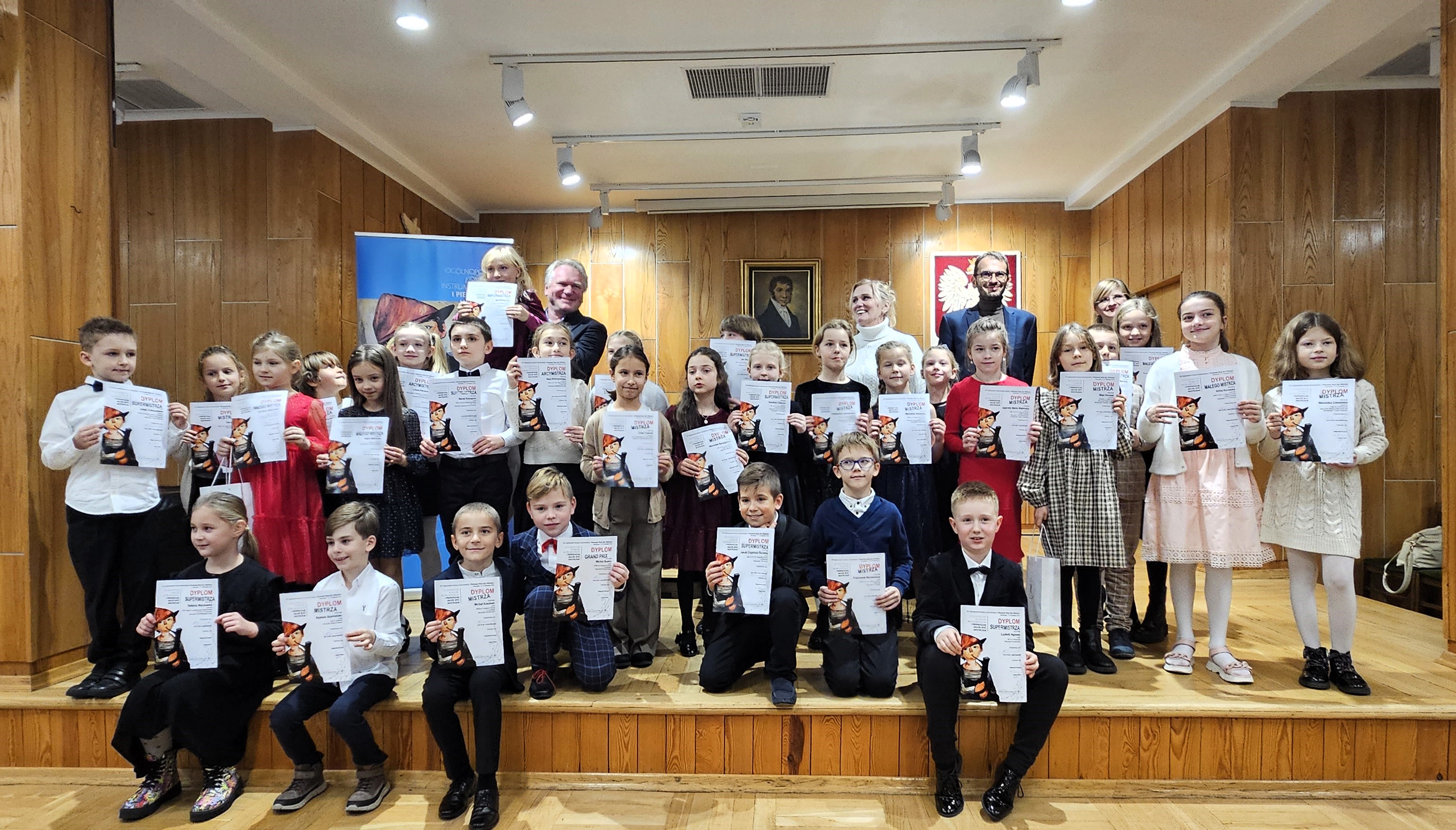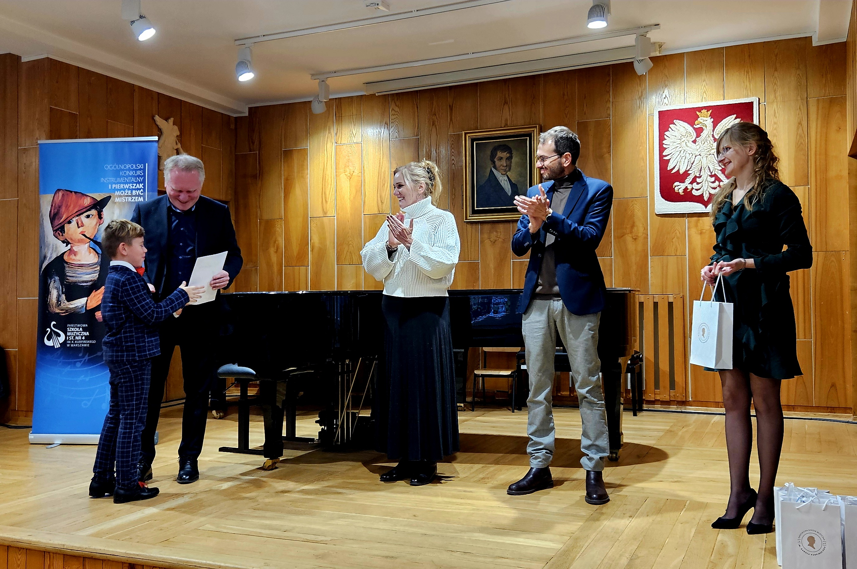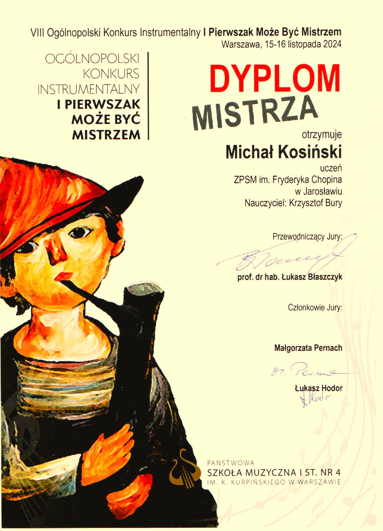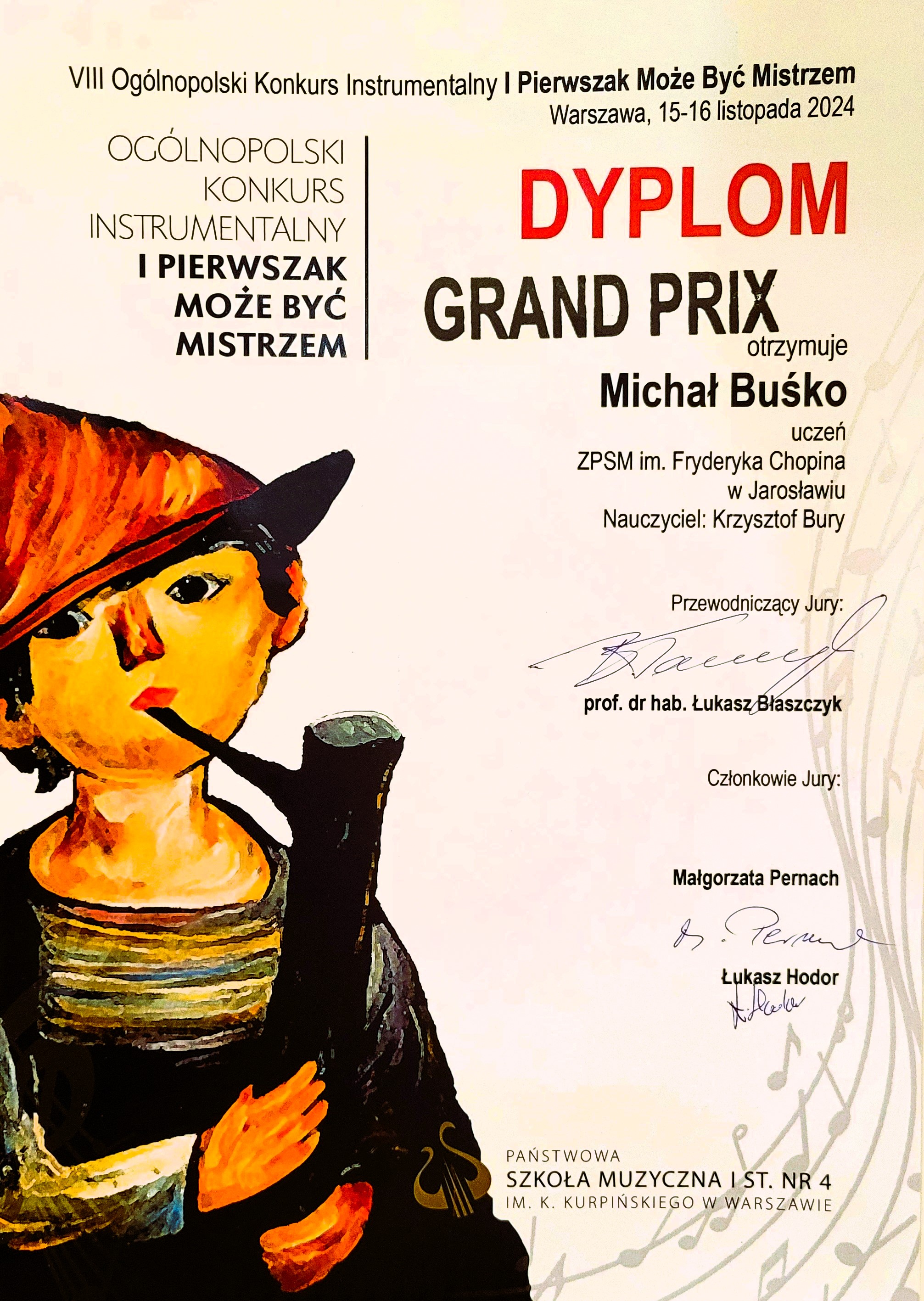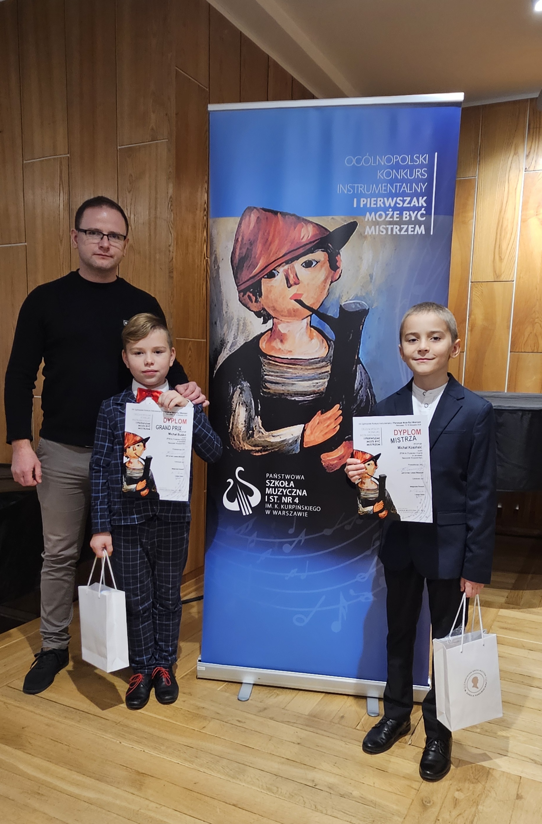 W dniach 15-16 listopada 2024 roku w Państwowej Szkole Muzycznej I stopnia nr 4 im. K. Kurpińskiego w Warszawie odbył się VIII Ogólnopolski Konkurs Instrumentalny „I Pierwszak może być mistrzem”. W przesłuchaniach wzięli udział uczniowie Szkół Muzycznych I stopnia cyklu 6-letniego i Ogólnokształcących Szkół Muzycznych wszystkich specjalności, którzy w roku szkolnym 2023/2024 ukończyli pierwszą klasę i uczyli się gry na instrumencie tylko przez rok. Wśród 93 wykonawców z całej Polski znaleźli się młodzi akordeoniści z Zespołu Państwowych Szkół Muzycznych im. F. Chopina w Jarosławiu – Michał Buśko i Michał Kosiński z klasy Pana mgra Krzysztofa Burego. Z wielką satysfakcją informujemy, że najlepszym uczestnikiem konkursu został Michał Buśko, któremu komisja konkursowa pod przewodnictwem prof. Łukasza Błaszczyka z Academy of Music in Maastricht przyznała GRAND PRIX! Bardzo dobrze zaprezentował się również Michał Kosiński, który otrzymał tytuł „Mistrza”, co jest równoznaczne z zajęciem 3 miejsca w konkursie! Nauczycielowi oraz uczniom gratulujemy sukcesów!!!
