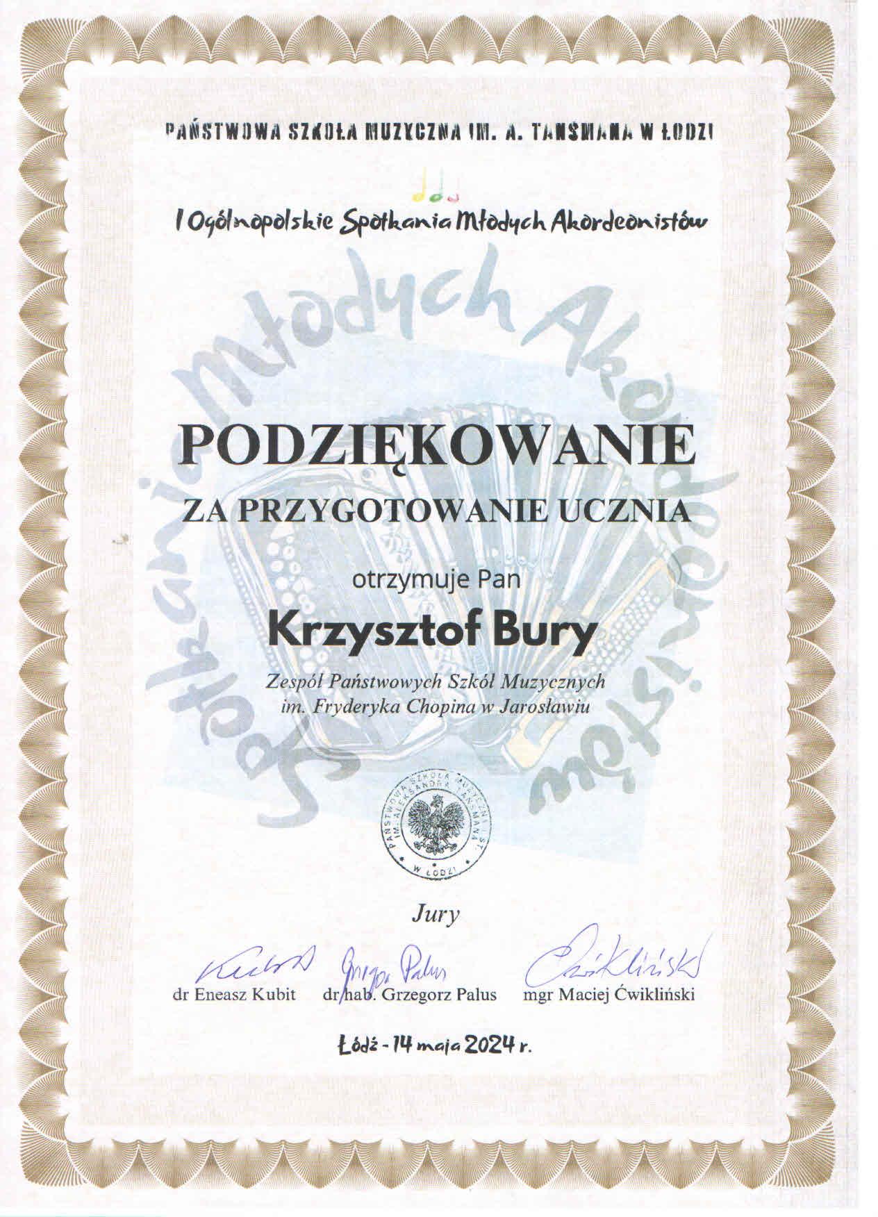 Podziękowanie za przygotowanie Laureatów – mgr Krzysztof Bury