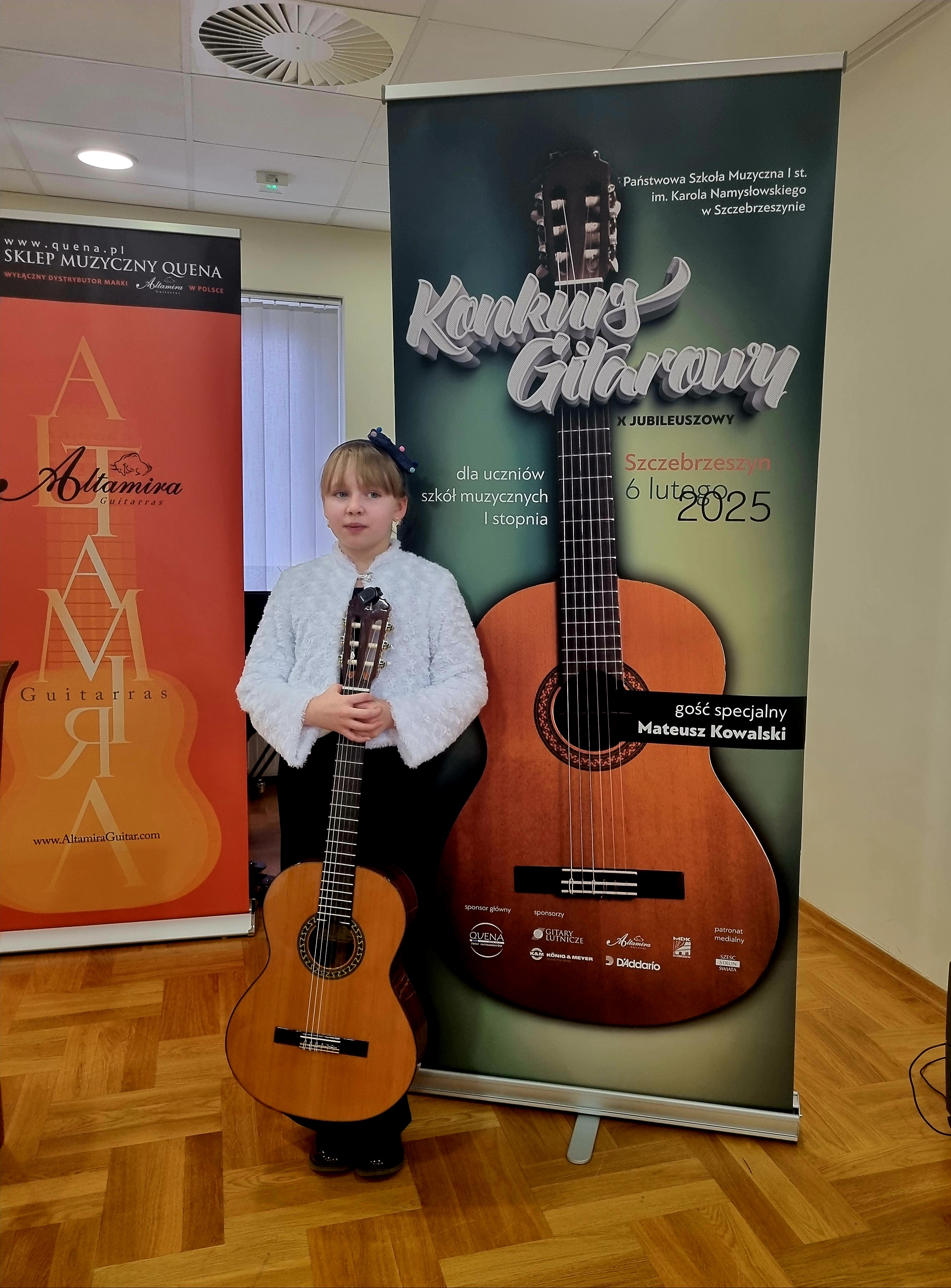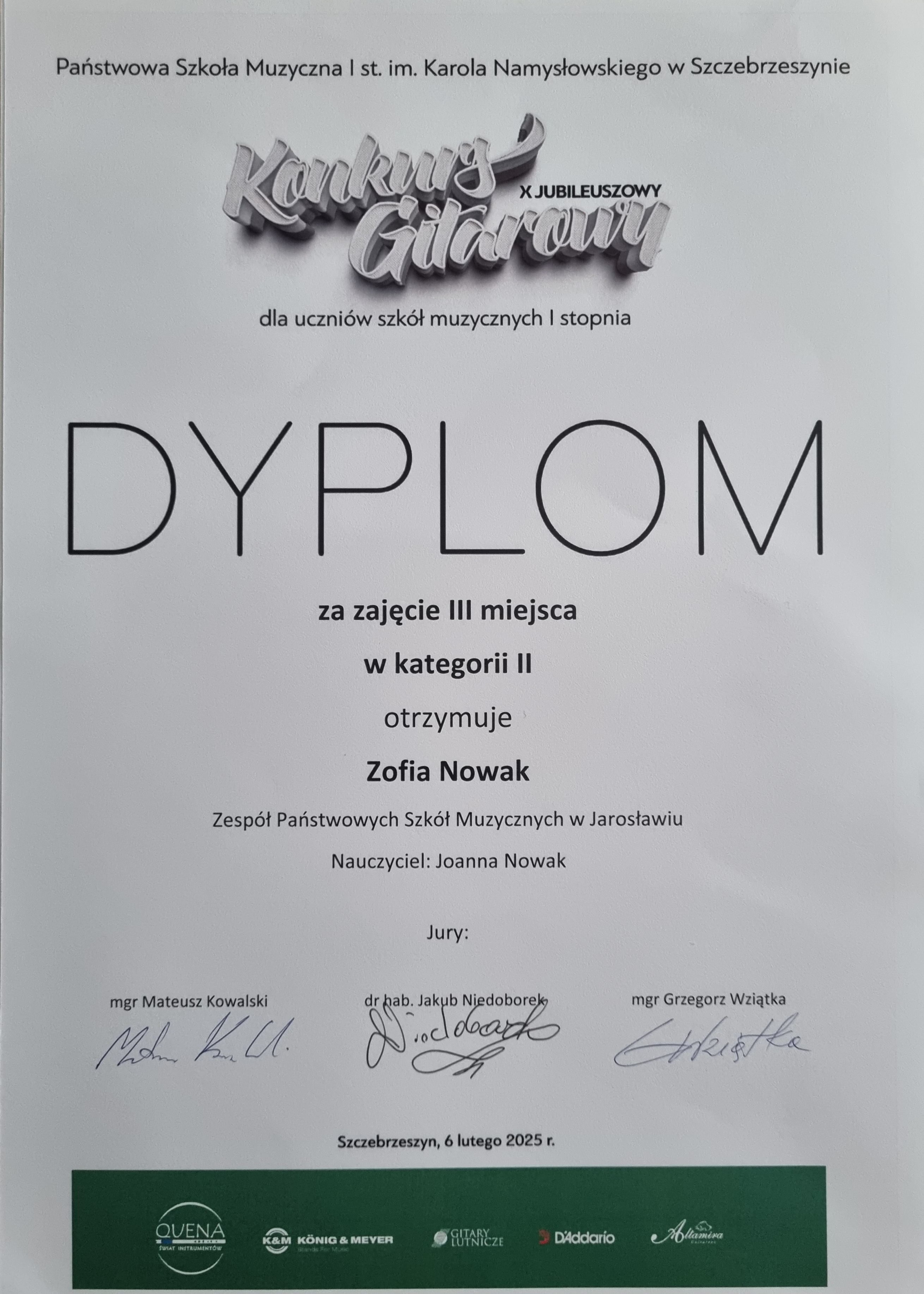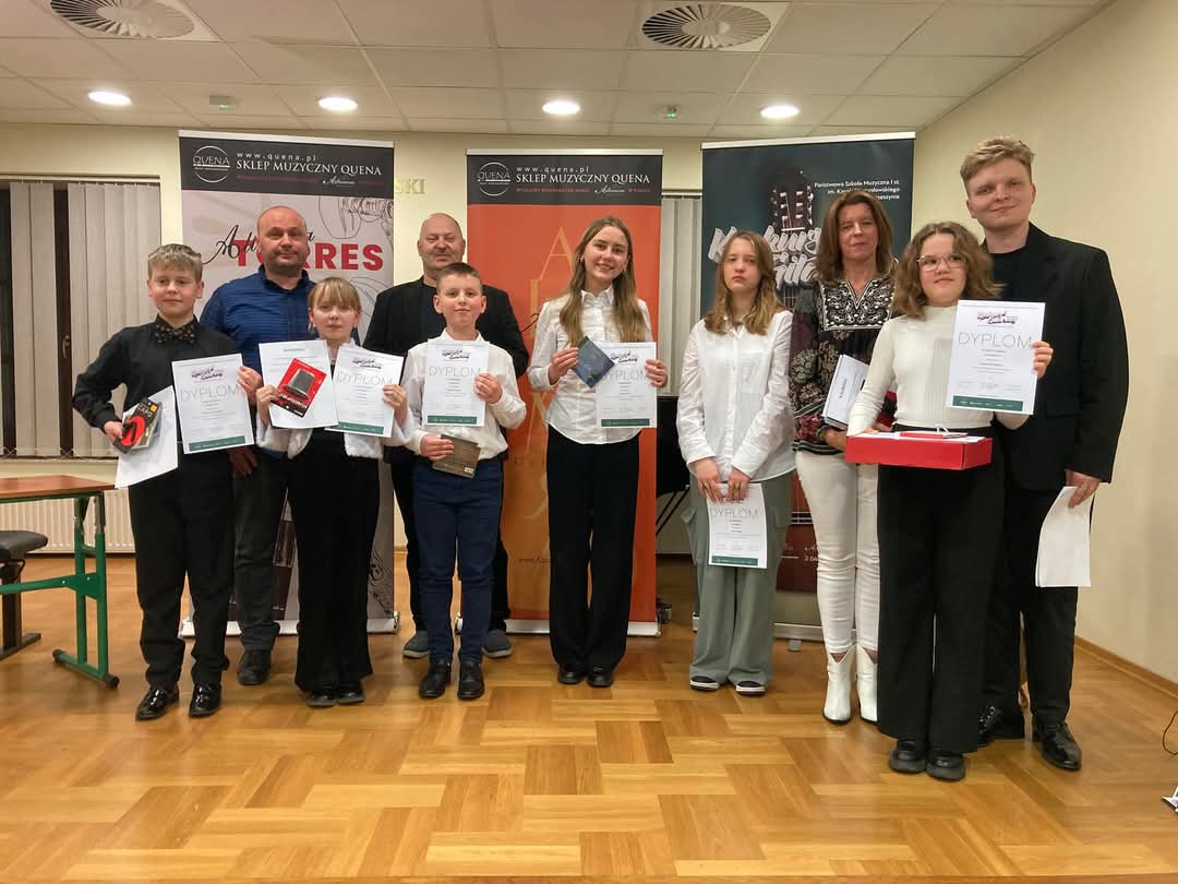 Dnia 6 lutego 2025 roku w Państwowej Szkole Muzycznej I st. im. Karola Namysłowskiego w Szczebrzeszynie odbył się X Konkurs Gitarowy, przeznaczony dla uczniów szkół muzycznych I stopnia. Uczennica naszej szkoły - Zofia Nowak, z klasy gitary p. Joanny Nowak, zdobyła III miejsce w kategorii II. Uczestników oceniało Jury w składzie: przewodniczący- mgr Mateusz Kowalski (wykładowca Uniwersytetu Muzycznego im. F. Chopina w Warszawie), dr hab. Jakub Niedoborek oraz mgr Grzegorz Wziątka.
