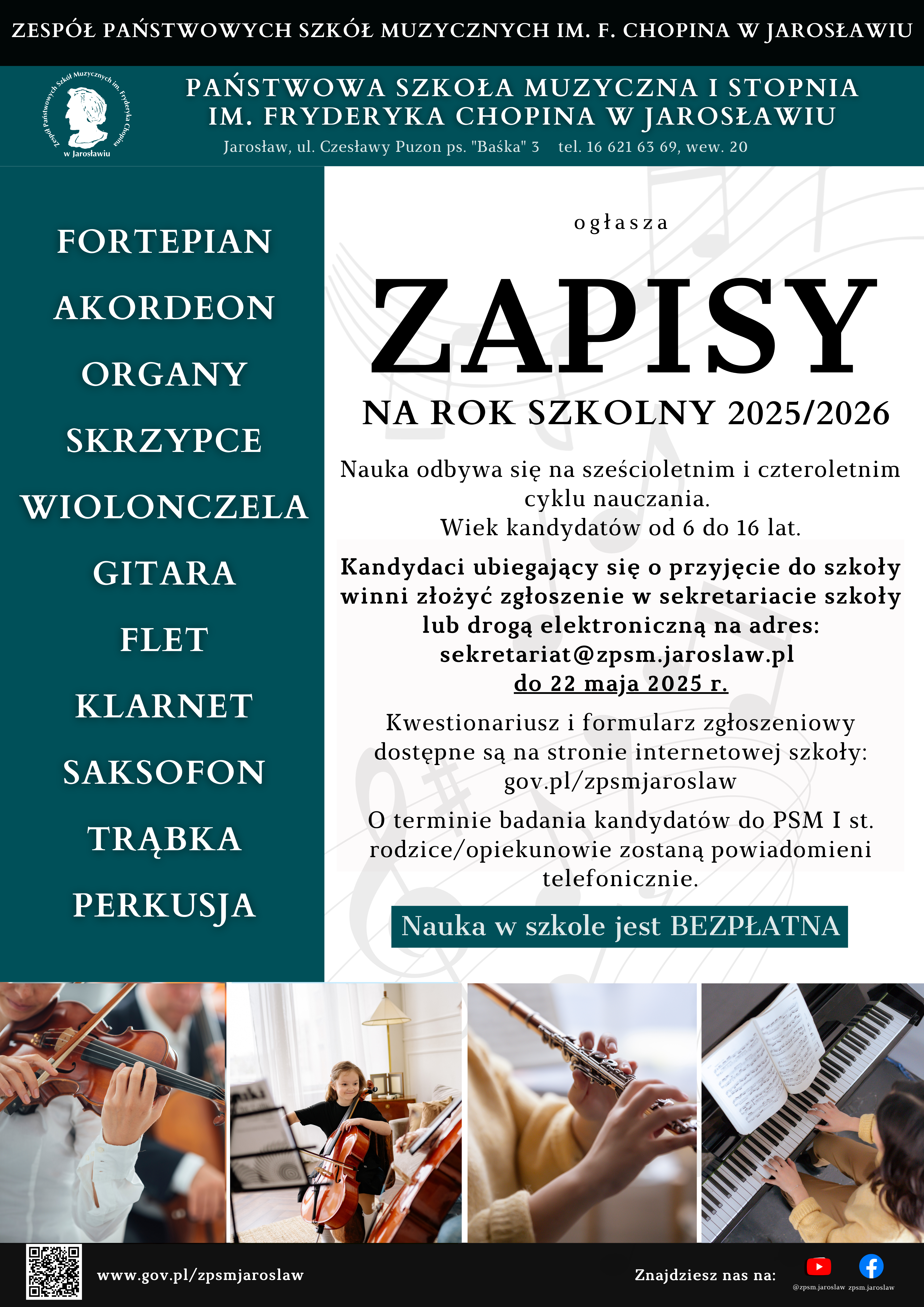 Podania do PSM I stopnia im. F. Chopina w Jarosławiu należy składać do 22 maja 2025 r. !