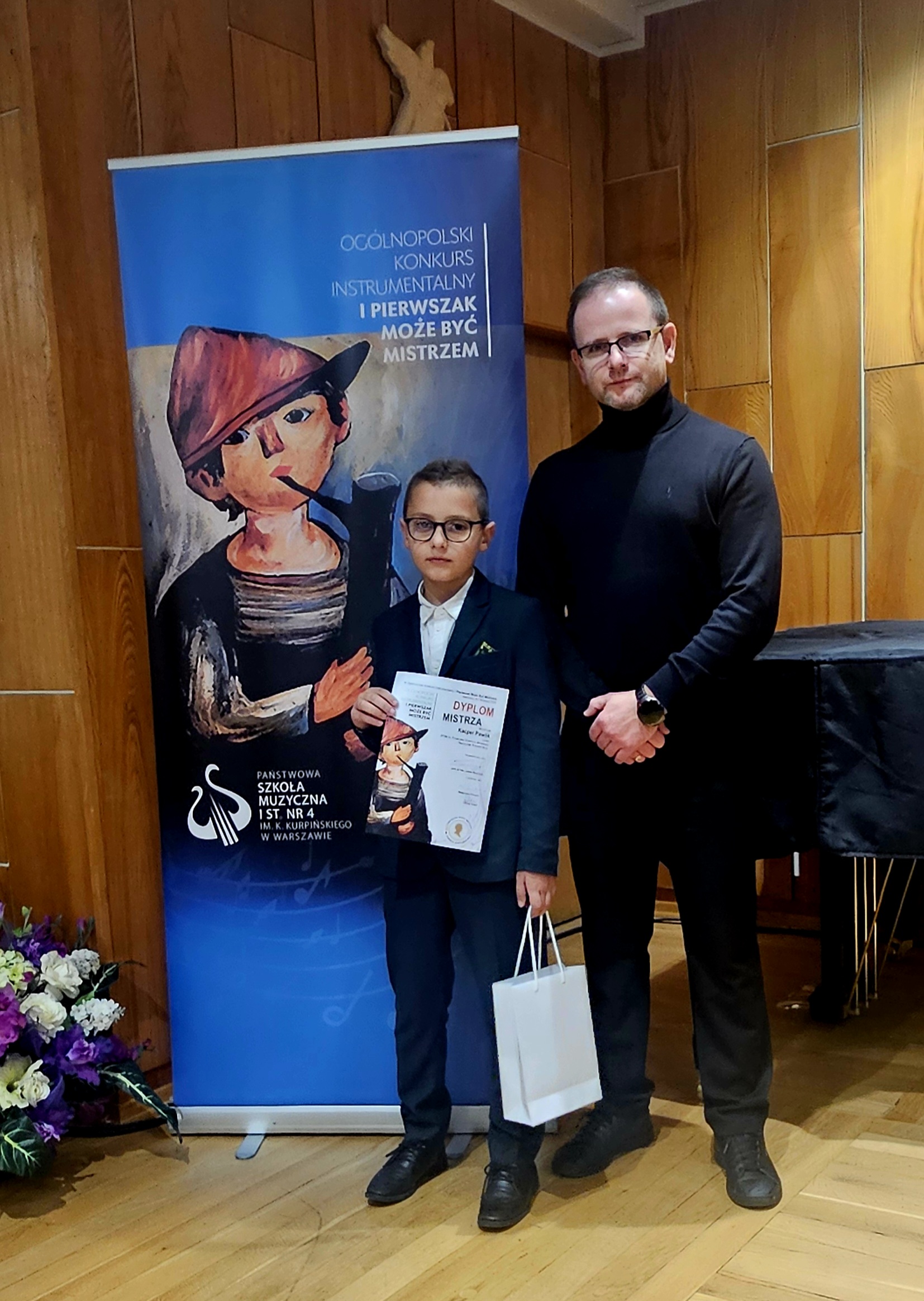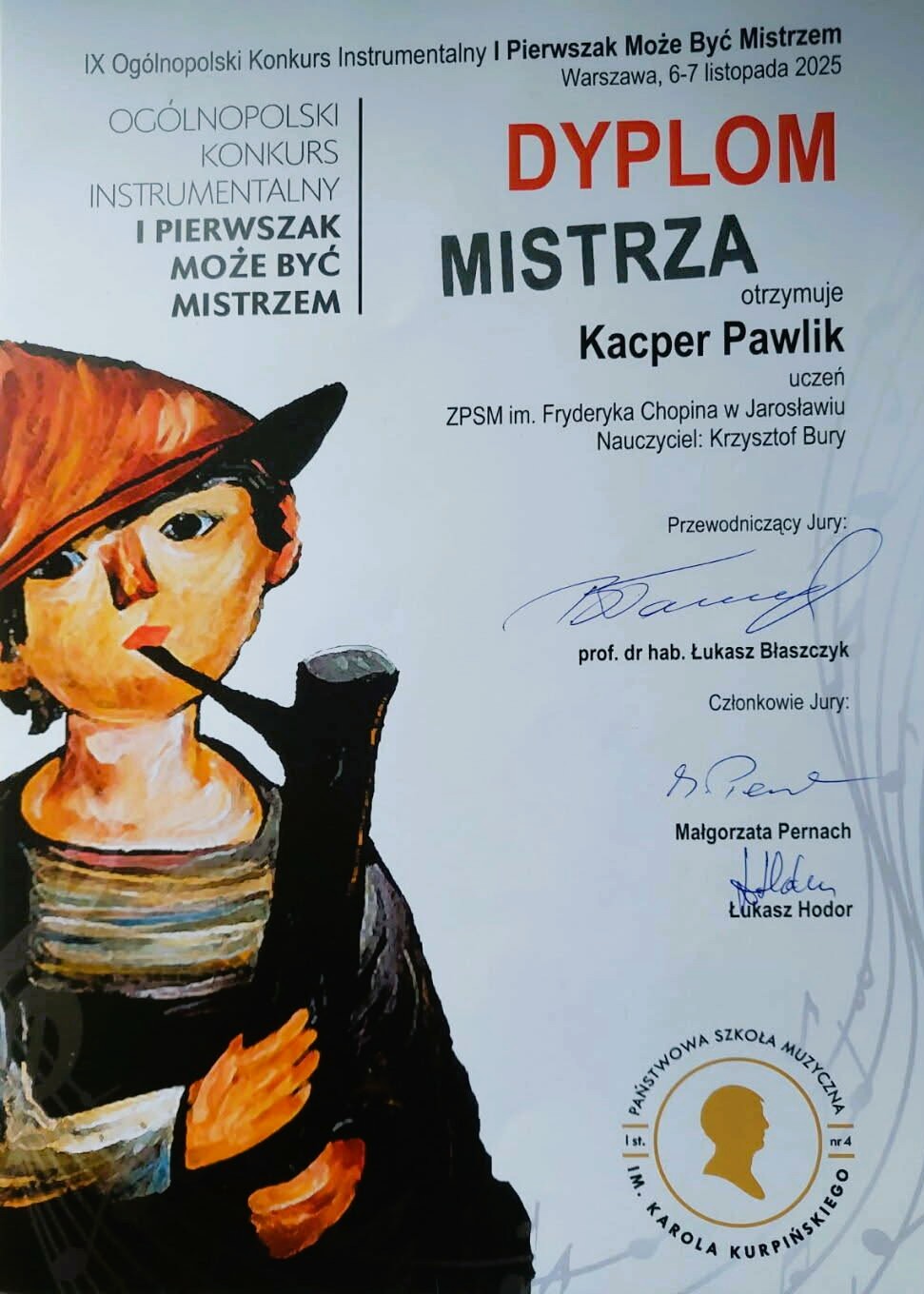 W dniach 6-7 listopada 2025 roku w Państwowej Szkole Muzycznej I stopnia nr 4 im. K. Kurpińskiego w Warszawie odbył się IX Ogólnopolski Konkurs Instrumentalny "I Pierwszak może być mistrzem". W przesłuchaniach wzięło udział 104 uczniów Szkół Muzycznych I stopnia cyklu 6-letniego i Ogólnokształcących Szkół Muzycznych I st. wszystkich specjalności z całej Polski, którzy w roku szkolnym 2024/2025 ukończyli pierwszą klasę i uczyli się gry na instrumencie tylko przez rok. Wśród nich znalazł się Kacper Pawlik – uczeń Zespołu Państwowych Szkół Muzycznych im. Fryderyka Chopina z klasy akordeonu Pana Krzysztofa Burego. Komisja konkursowa, której przewodniczył prof. dr hab. Łukasz Błaszczyk (Akademia Muzyczna im. Grażyny i Kiejstuta Bacewiczów w Łodzi) doceniła prezentację naszego ucznia przyznając mu tytuł „Mistrza”, co jest równoznaczne z zajęciem 3 miejsca w konkursie.