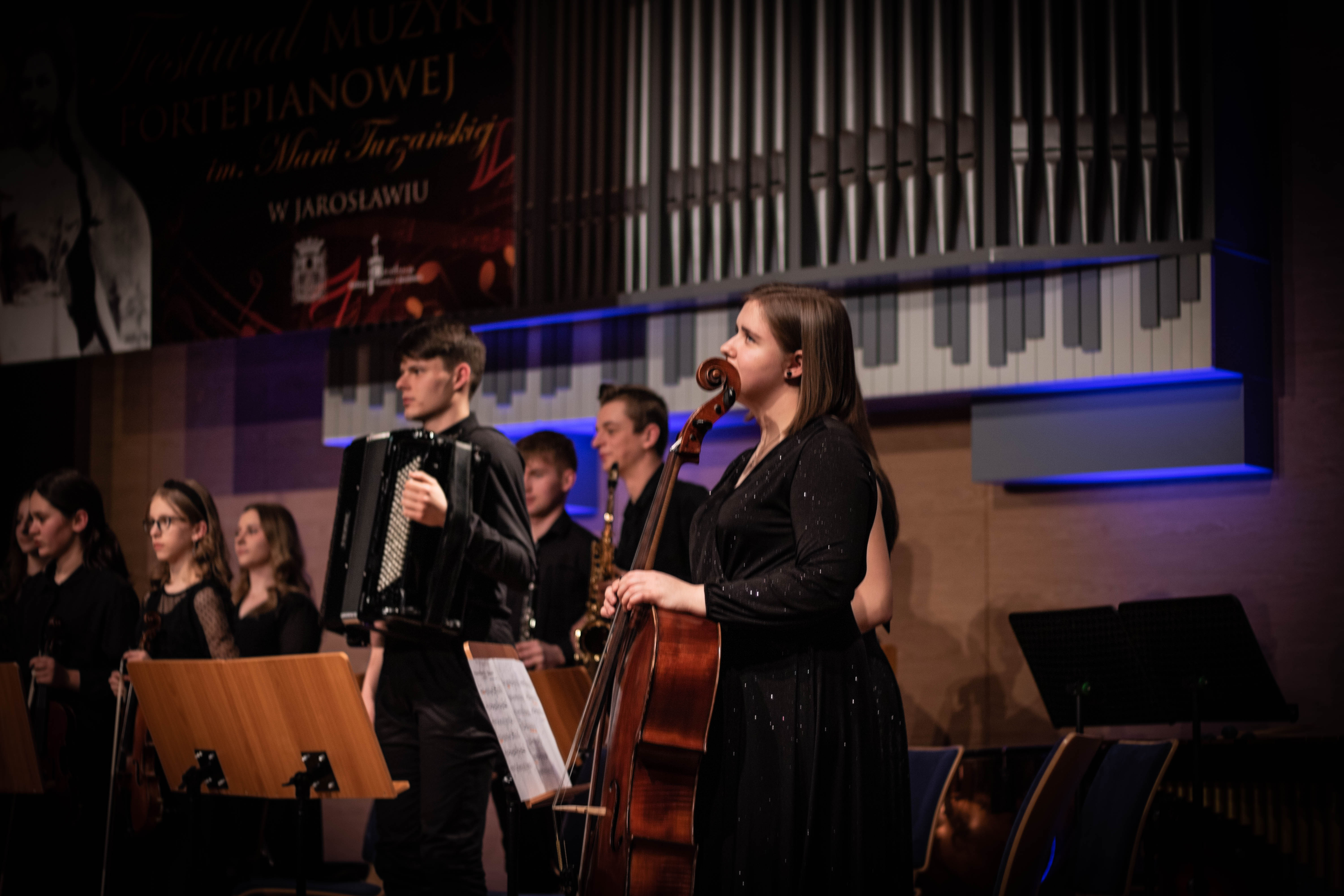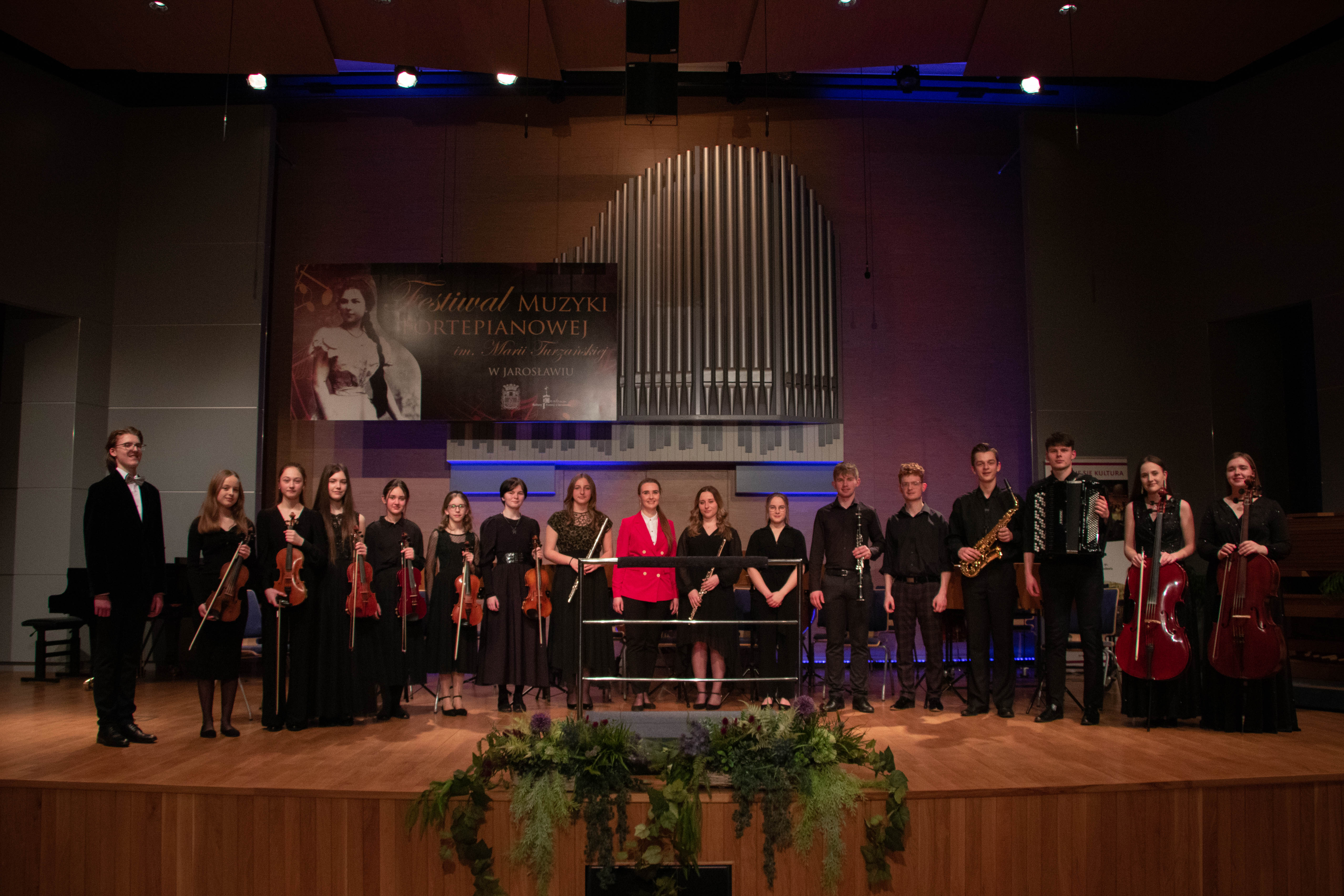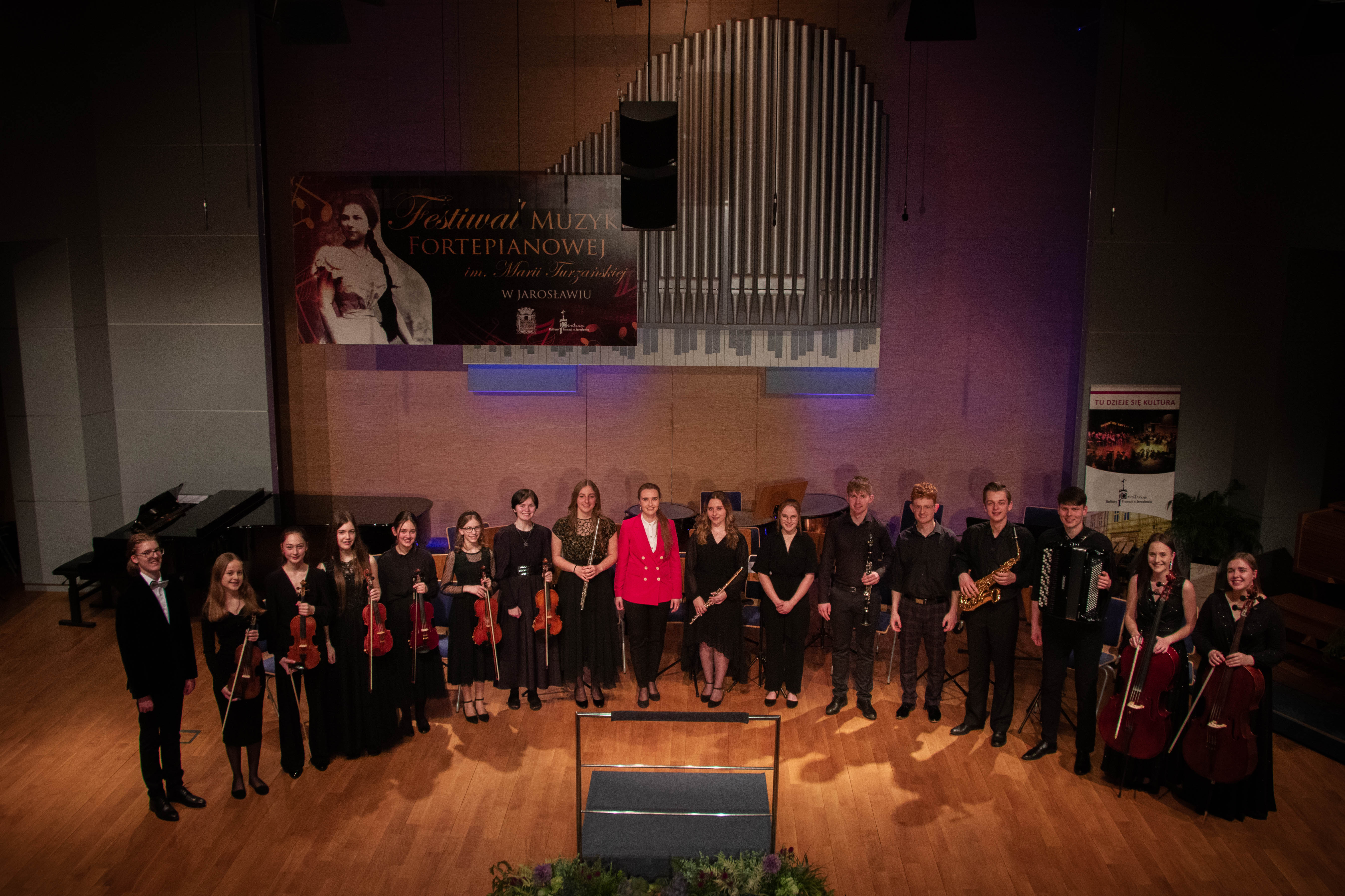 25 lutego Orkiestra Zespołu Państwowych Szkół Muzycznych im. Fryderyka Chopina w Jarosławiu pod dyrekcją Martyny Lasoty zainaugurowała tegoroczny Festiwal Muzyki Fortepianowej im. Marii Turzańskiej 2023. Podczas tego wieczoru, zgromadzona tłumnie publiczność wysłuchała transkrypcji orkiestrowych najpopularniejszych utworów muzyki klasycznej takich jak „Badinerie” z Suity nr 2 h-moll Jana Sebastiana Bacha, „Adagio” Tomaso Albinoniego, „Te Deum” Marca-Antoine’a Charpentiera, a także utworów polskich kompozytorów: Fryderyka Chopina, Ignacego Jana Paderewskiego, Karola Szymanowskiego oraz Dominika Lasoty. Orkiestrze towarzyszyła w roli solisty – flecistka Jagoda Pietrusiak-Kasprzyk. Ciekawe interpretacje, a także kunszt artystyczny wszystkich wykonawców zostały docenione przez zgromadzoną publiczność za sprawą owacji na stojąco i gromkich braw. W odpowiedzi na entuzjastyczne przyjęcie młodych wykonawców, orkiestra wraz z solistką odpowiedziała dwukrotnym bisem. Wszystkim wykonawcom serdecznie gratulujemy i zachęcamy do obejrzenia relacji zdjęciowej z tego wydarzenia (fot. Agnieszka Kamińska).