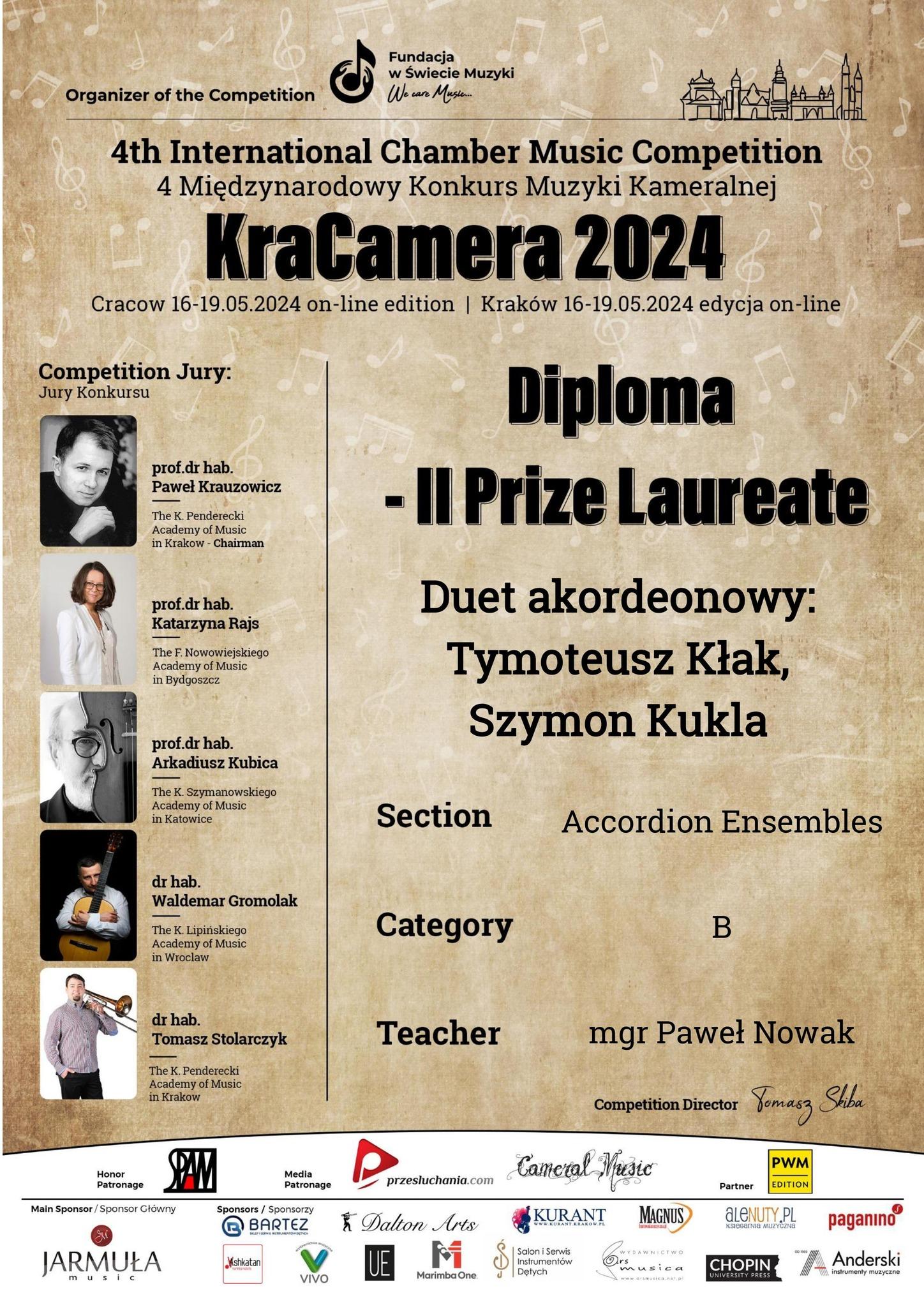 Sukces duetu akordeonowego w składzie Tymoteusz Kłak i Szymon Kukla w IV Międzynarodowym Konkursie Muzyki Kameralnej KraCamera 2024 - edycja on-line - Kraków 16-19 maja 2024 r.