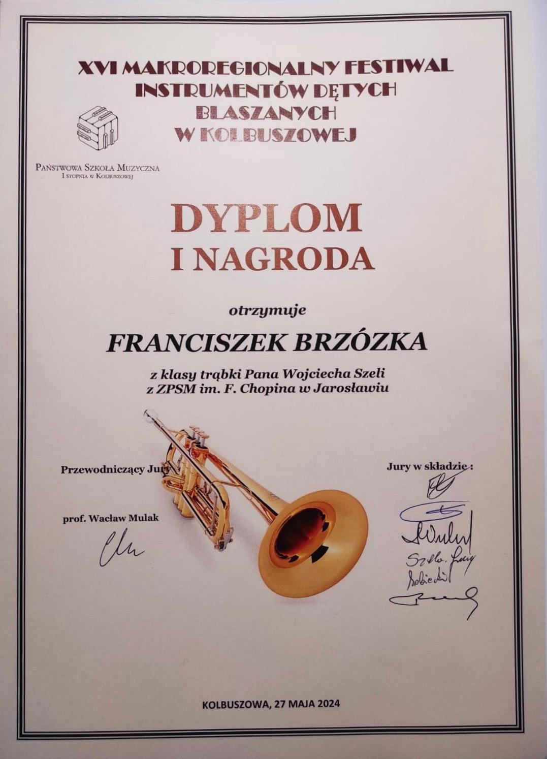 Sukces Franciszka Brzózki na XVI Makroregionalnym Festiwalu Instrumentów Dętych Blaszanych w Kolbuszowej ! - 27 maja 2024 r.