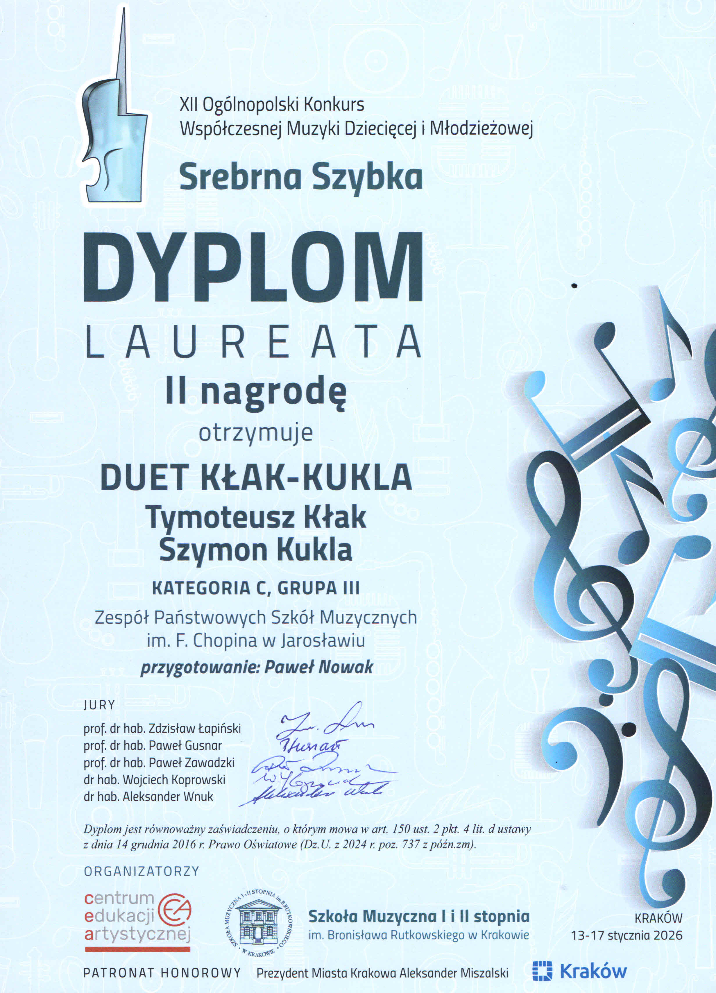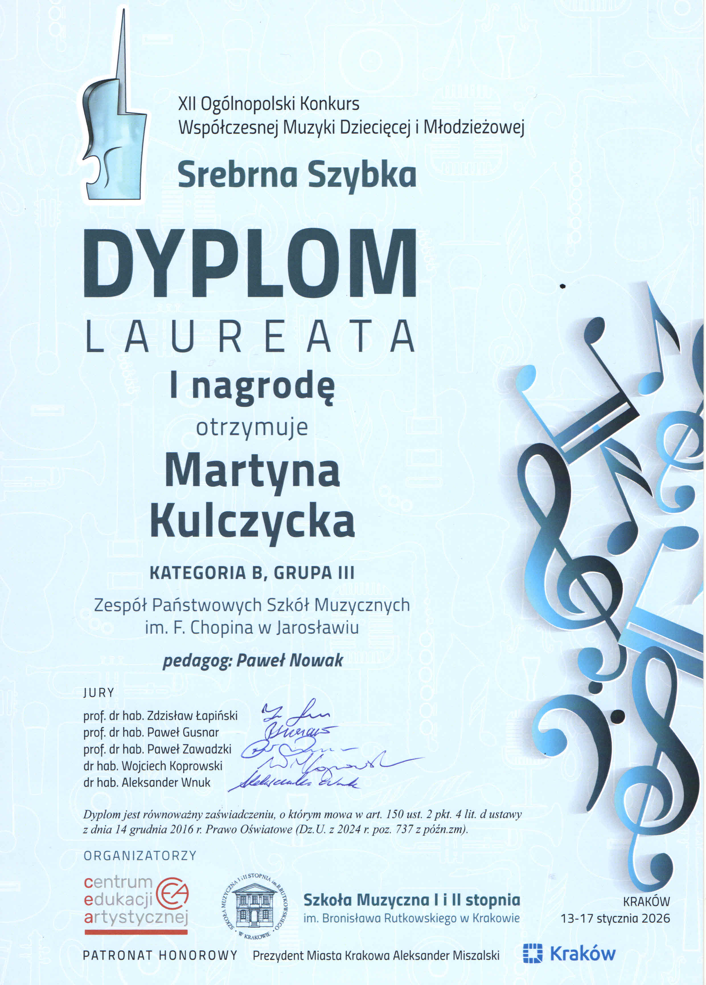 Sukces Martyny Kulczyckiej oraz duetu akordeonowego (Szymon Kukla i Tymoteusz Kłak) w XII Ogólnopolskim Konkursie Współczesnej Muzyki Dziecięcej i Młodzieżowej „Srebrna Szybka”, Kraków 13-17 stycznia 2026 r.