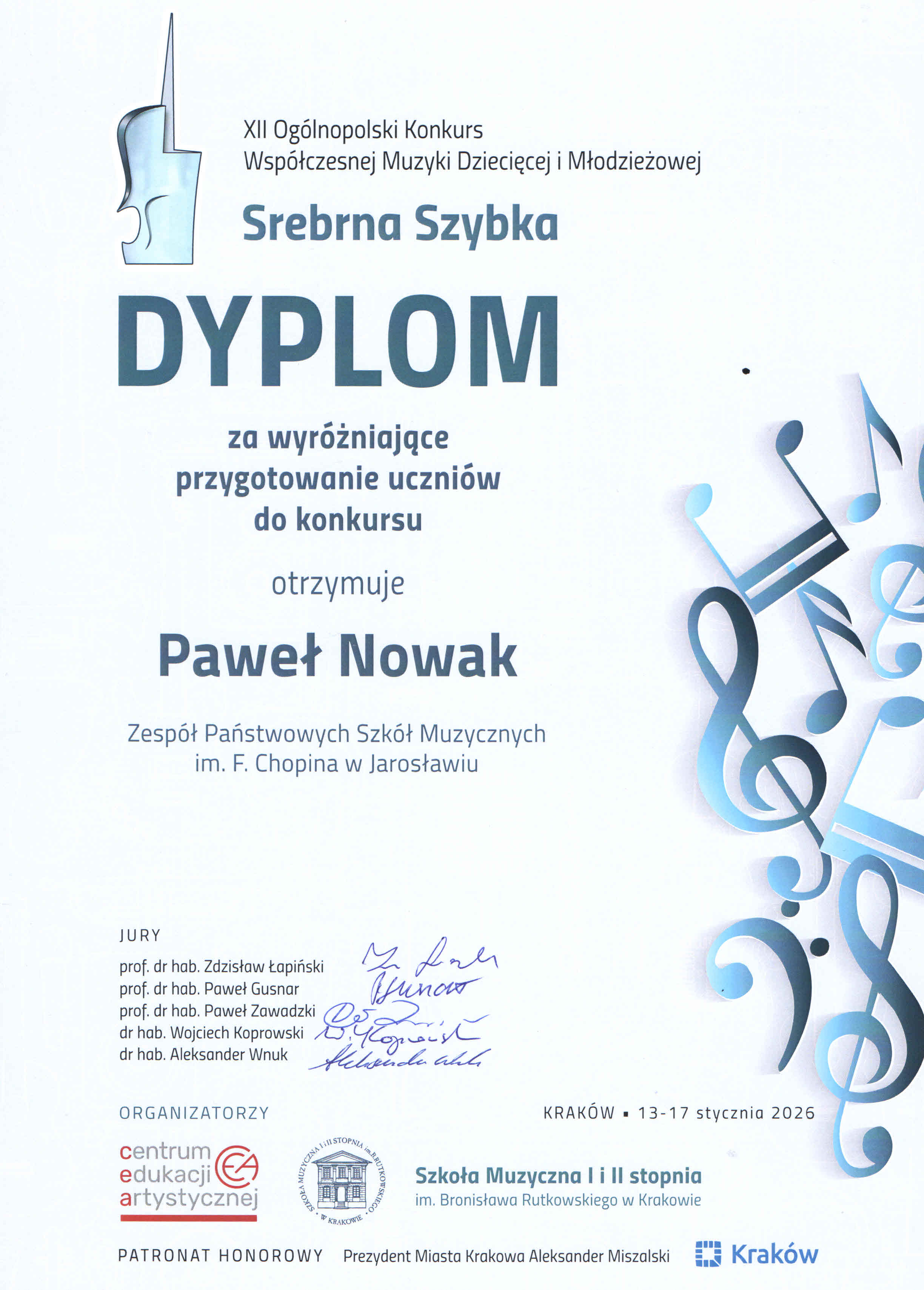 Dyplom za wyróżniające przygotowanie uczniów otrzymał Pan Paweł Nowak.