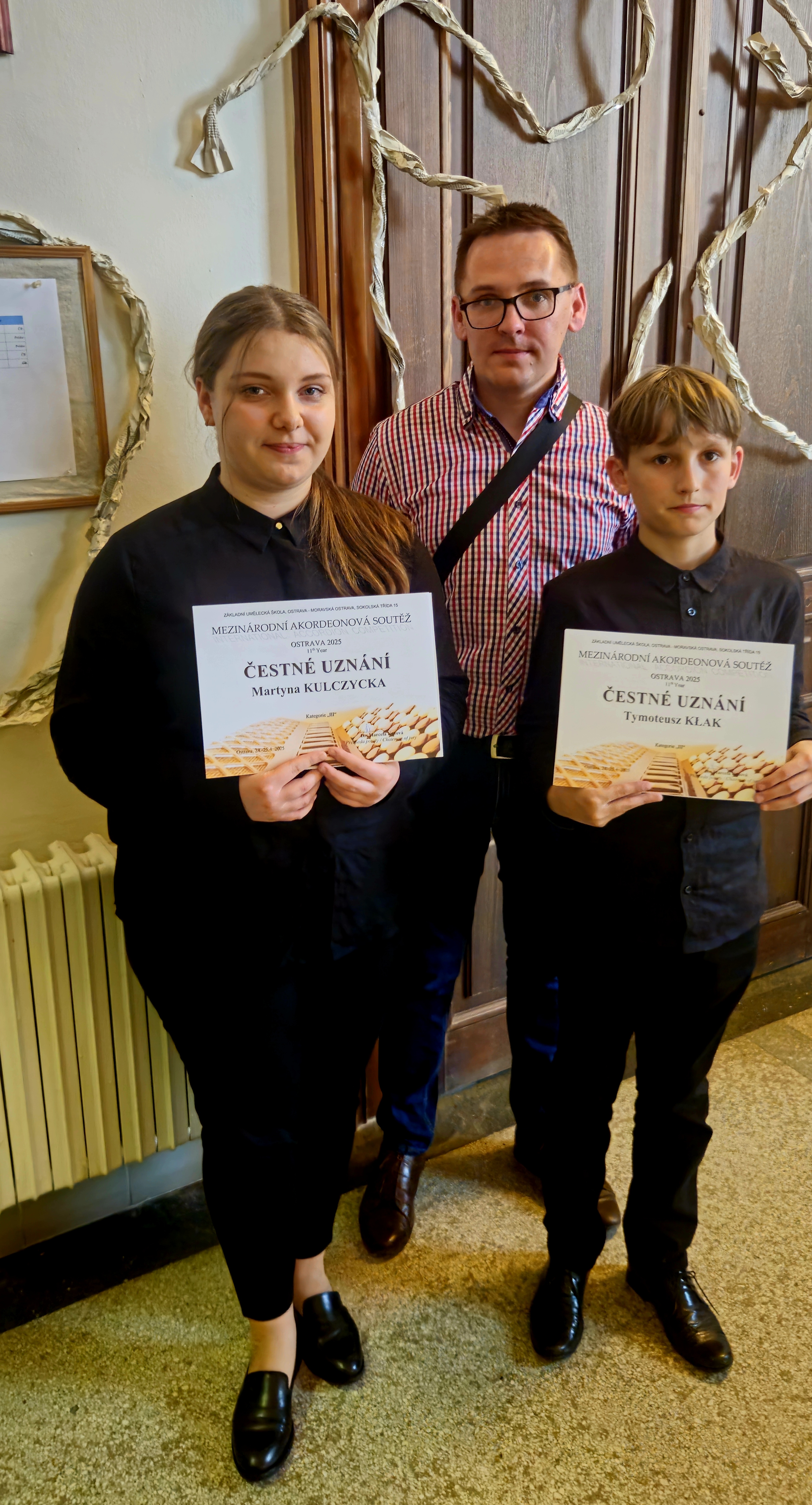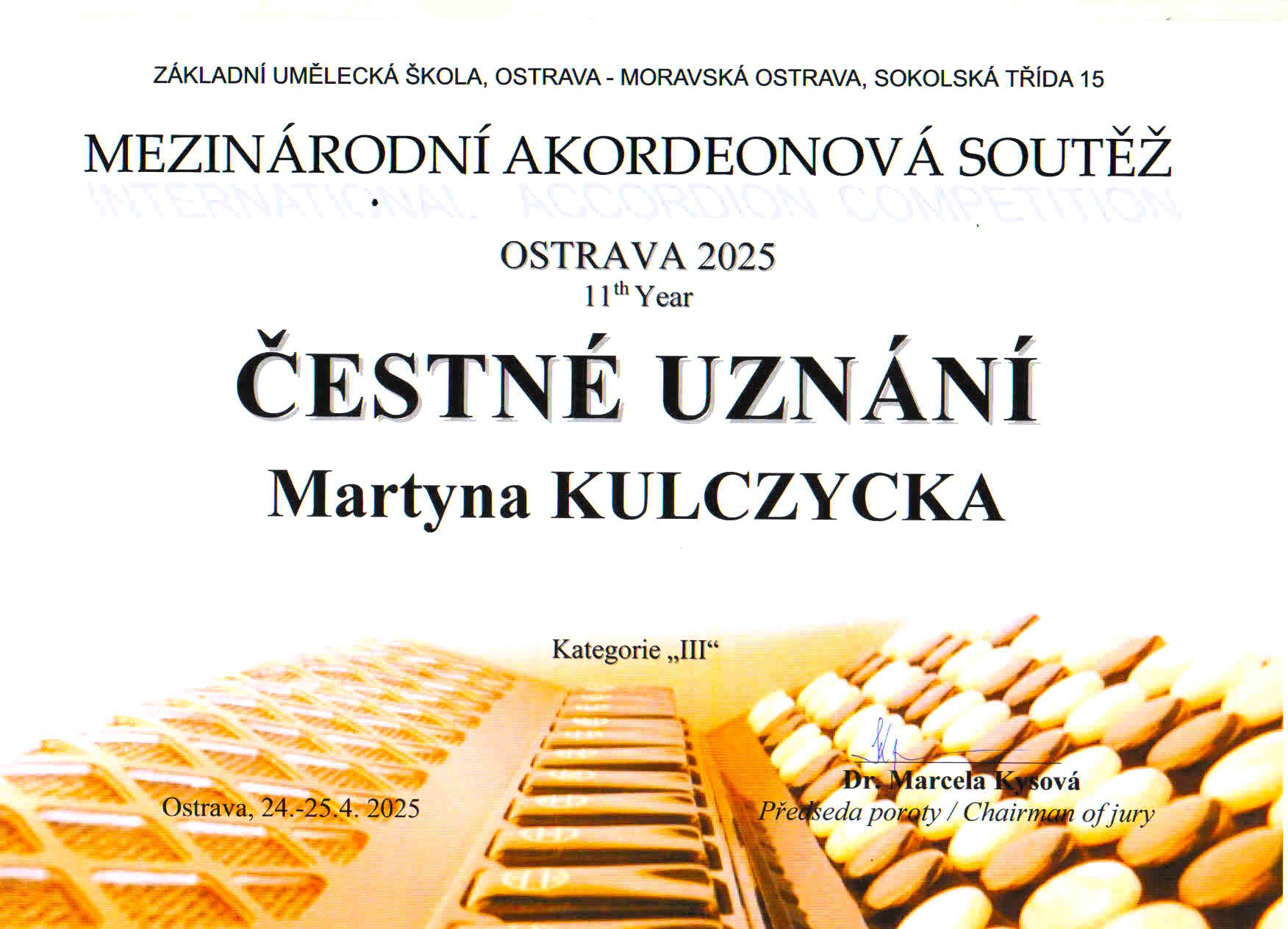 W dniach 24-25 kwietnia br. w czeskiej Ostrawie odbył się XI Międzynarodowy Konkurs Akordeonowy, do którego zgłoszonych zostało 79 młodych akordeonistów z Czech, Polski oraz Słowacji. Z satysfakcją informujemy, że komisja konkursowa złożona z przedstawicieli Czech, Polski i Słowacji doceniła prezentację Martyny Kulczyckiej z klasy Pana Pawła Nowaka przyznając jej Wyróżnienie w kat. III