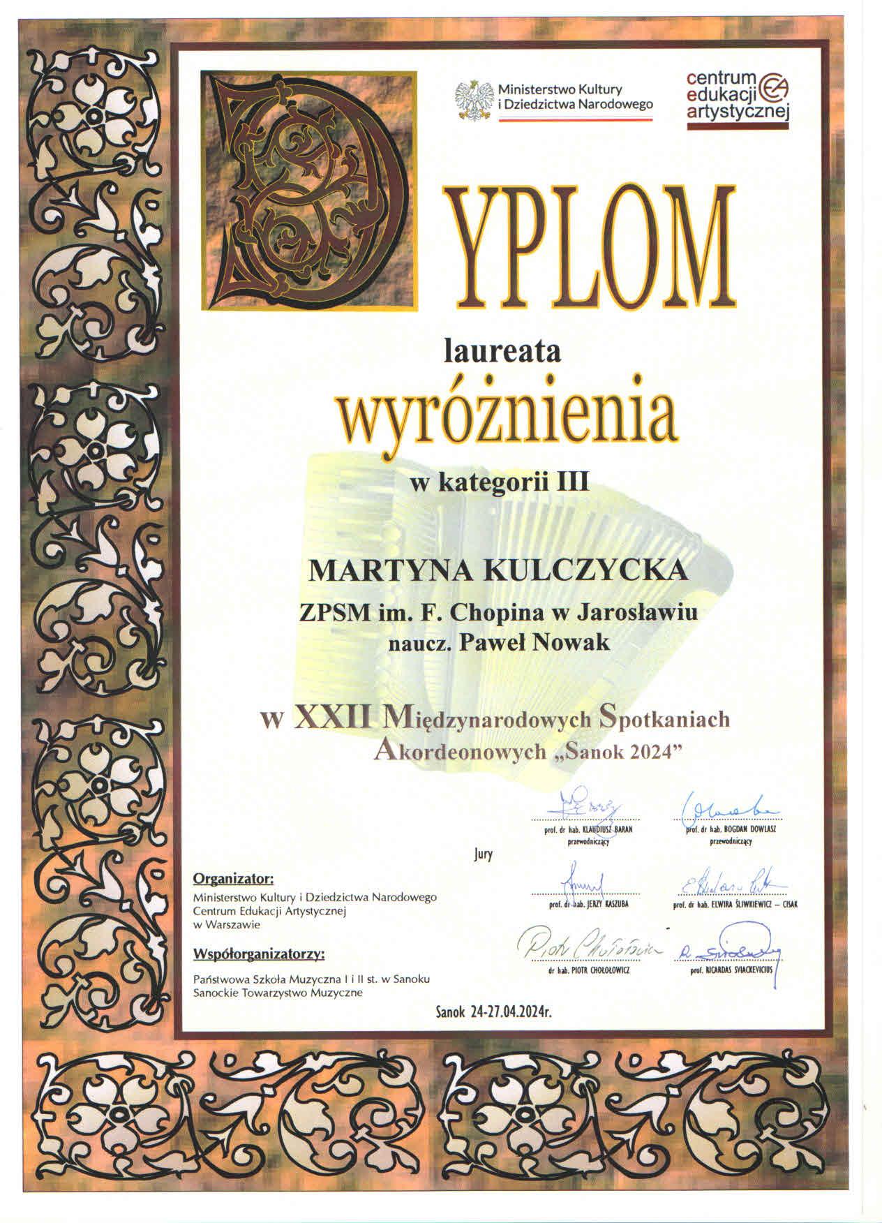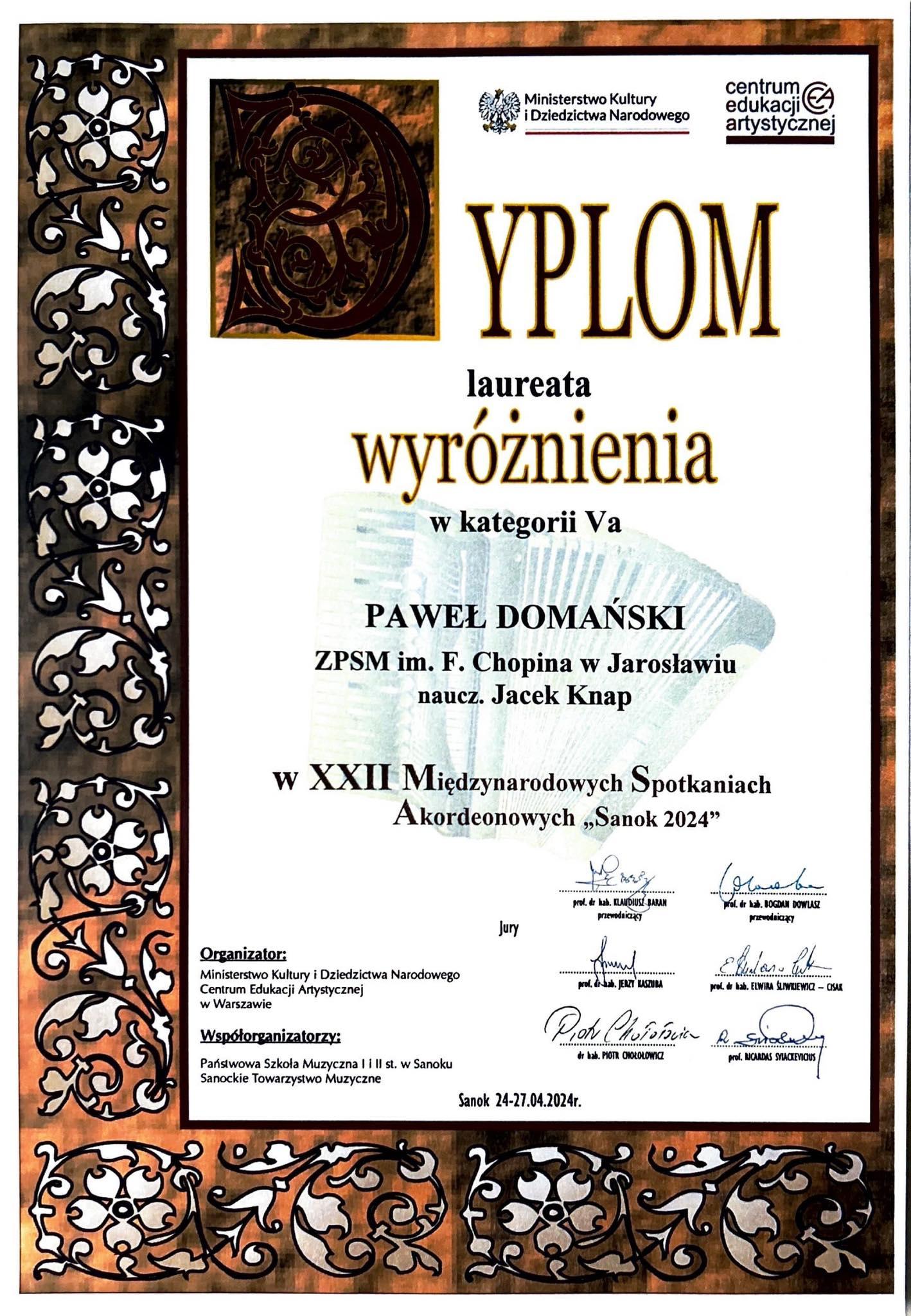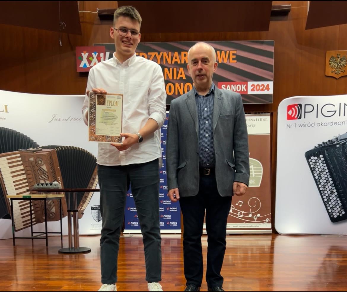 Sukcesami uczniów z PSM II st. w Jarosławiu zakończył się jeden z najbardziej znanych i cenionych konkursów akordeonowych w Polsce, mający 36-letnią tradycję – XXII Międzynarodowe Spotkania Akordeonowe „Sanok 2024”, który odbył się w dniach 24-27 kwietnia br. w Państwowej Szkole Muzycznej I i II st. im. Wandy Kossakowej w Sanoku.