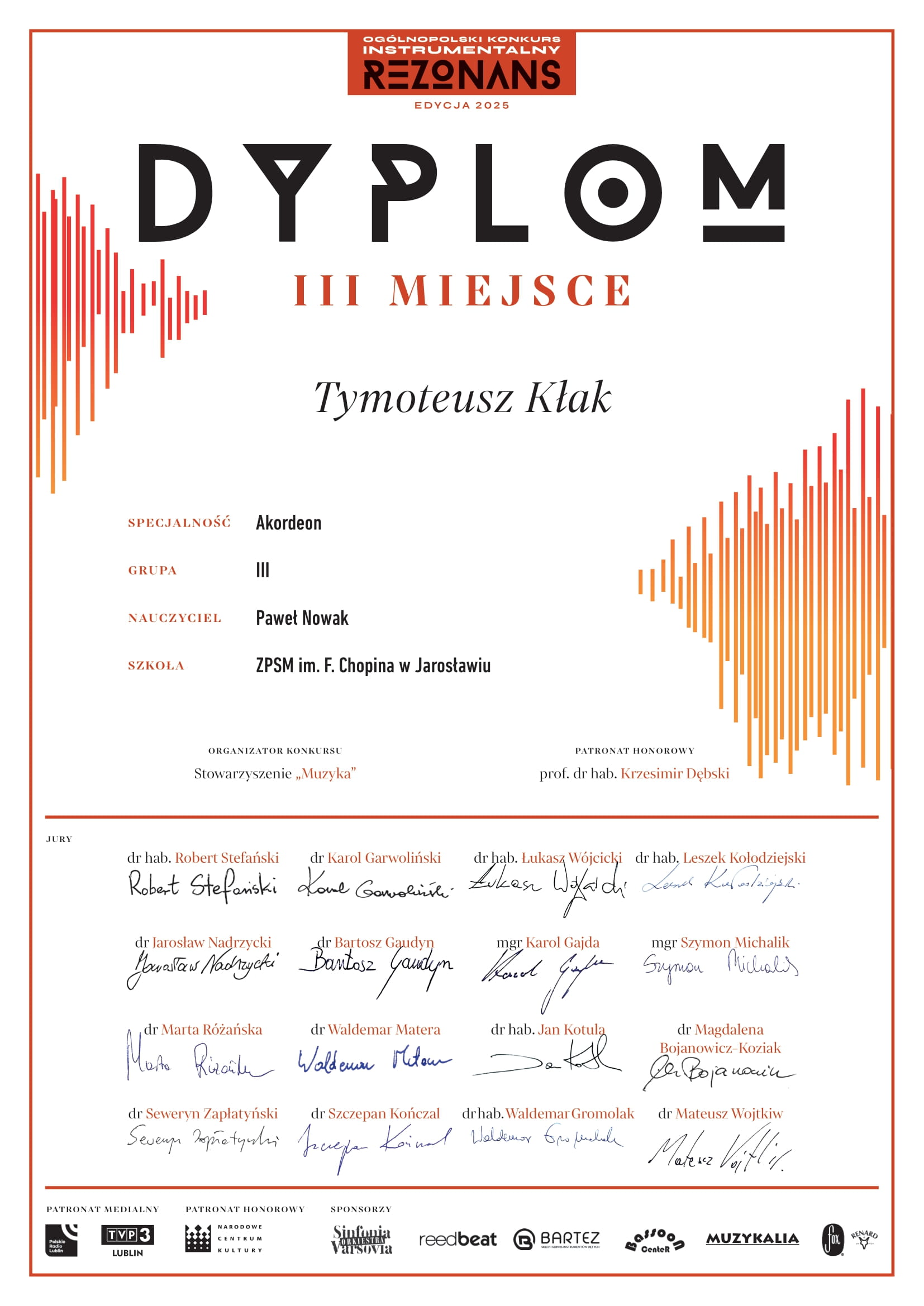 - z klasy akordeonu mgra Pawła Nowaka w kategorii III Tymoteusz Kłak otrzymał III miejsce.