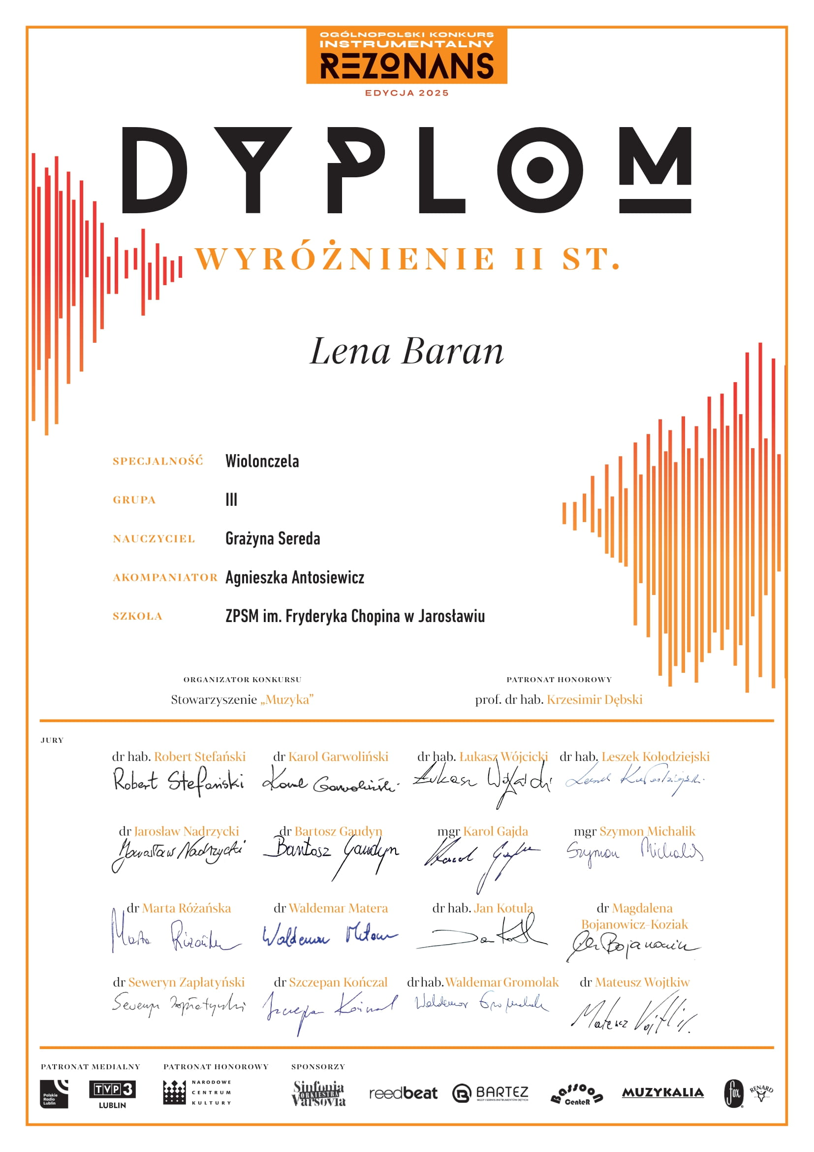 - z klasy wiolonczeli mgr Grażyny Seredy, w kategorii III Lena Baran otrzymała wyróżnienie II st.