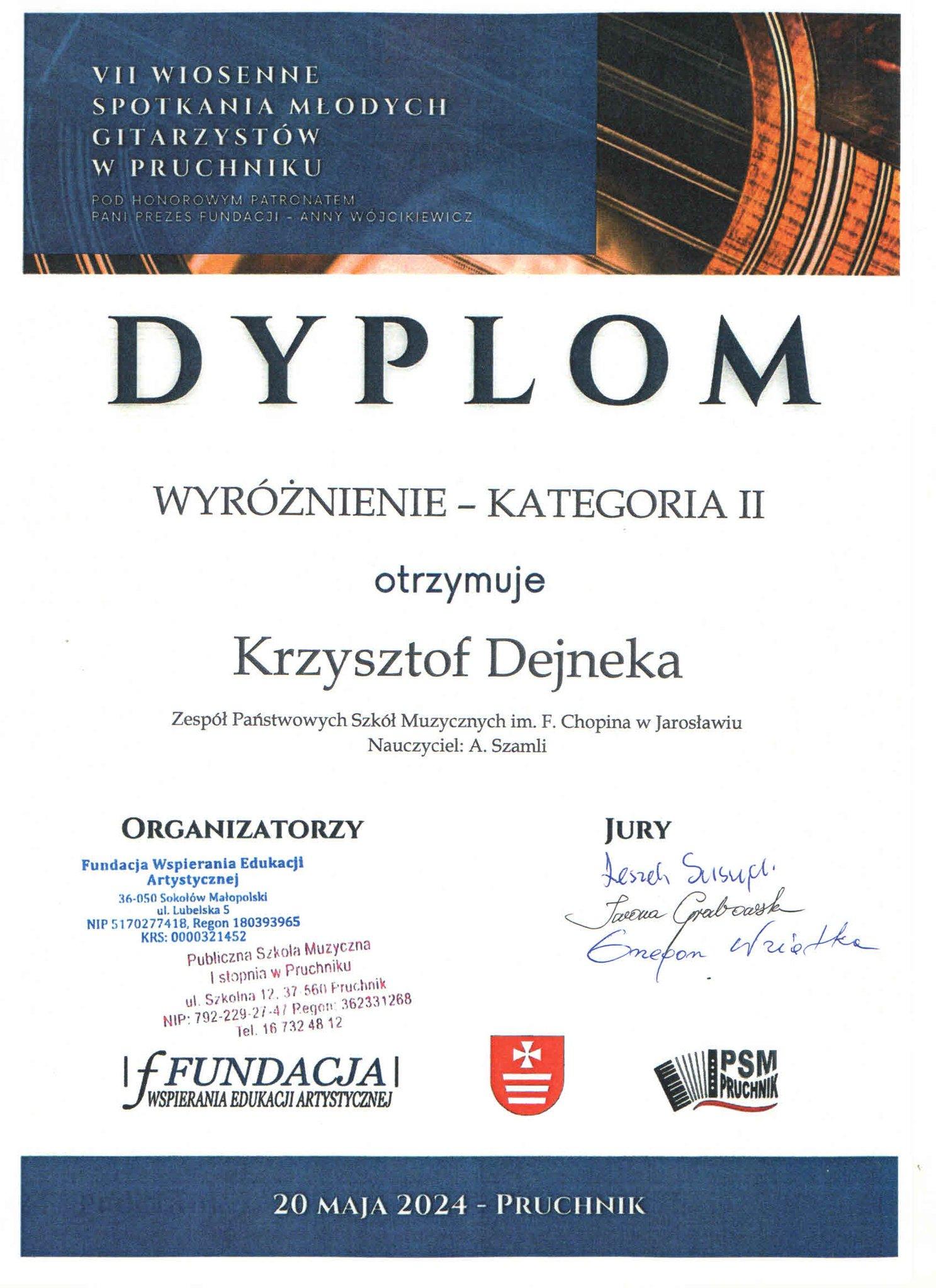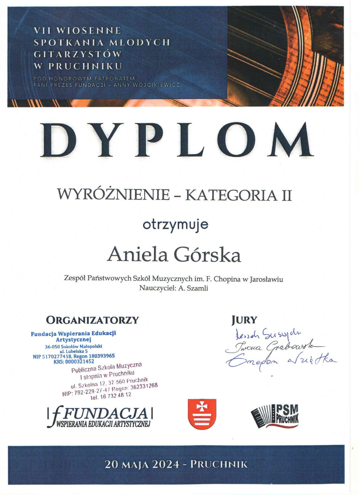 Dnia 20 maja 2024 roku odbyły się VII Wiosenne Spotkania Młodych Gitarzystów w Pruchniku. W konkursie o zasięgu makroregionalnym wzięli udział gitarzyści z naszej szkoły. Zofia Nowak z klasy gitary Pani Joanny Nowak otrzymała II Nagrodę w kategorii drugiej, Aniela Górska oraz Krzysztof Dejneka z klasy gitary Pana Anatola Szamli otrzymali wyróżnienia także w kategorii drugiej. Uczestników oceniało Jury w składzie: dr hab. Leszek Suszycki (przewodniczący), mgr Iwona Grabowska (Konsultant Centrum Edukacji Artystycznej), mgr Grzegorz Wziątka (Konsultant Centrum Edukacji Artystycznej)
