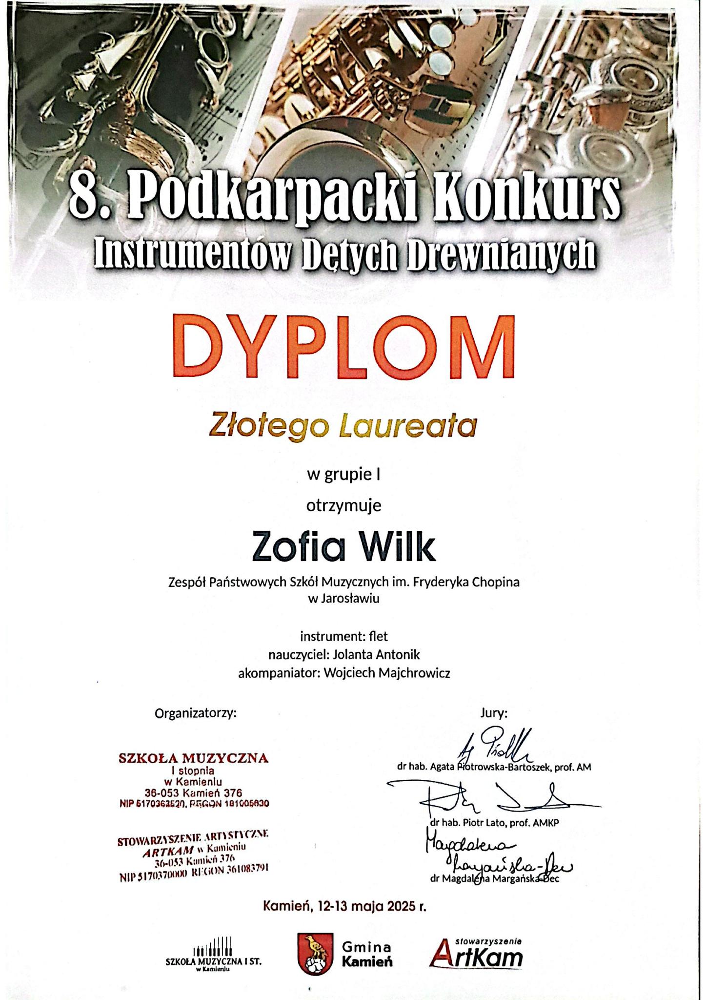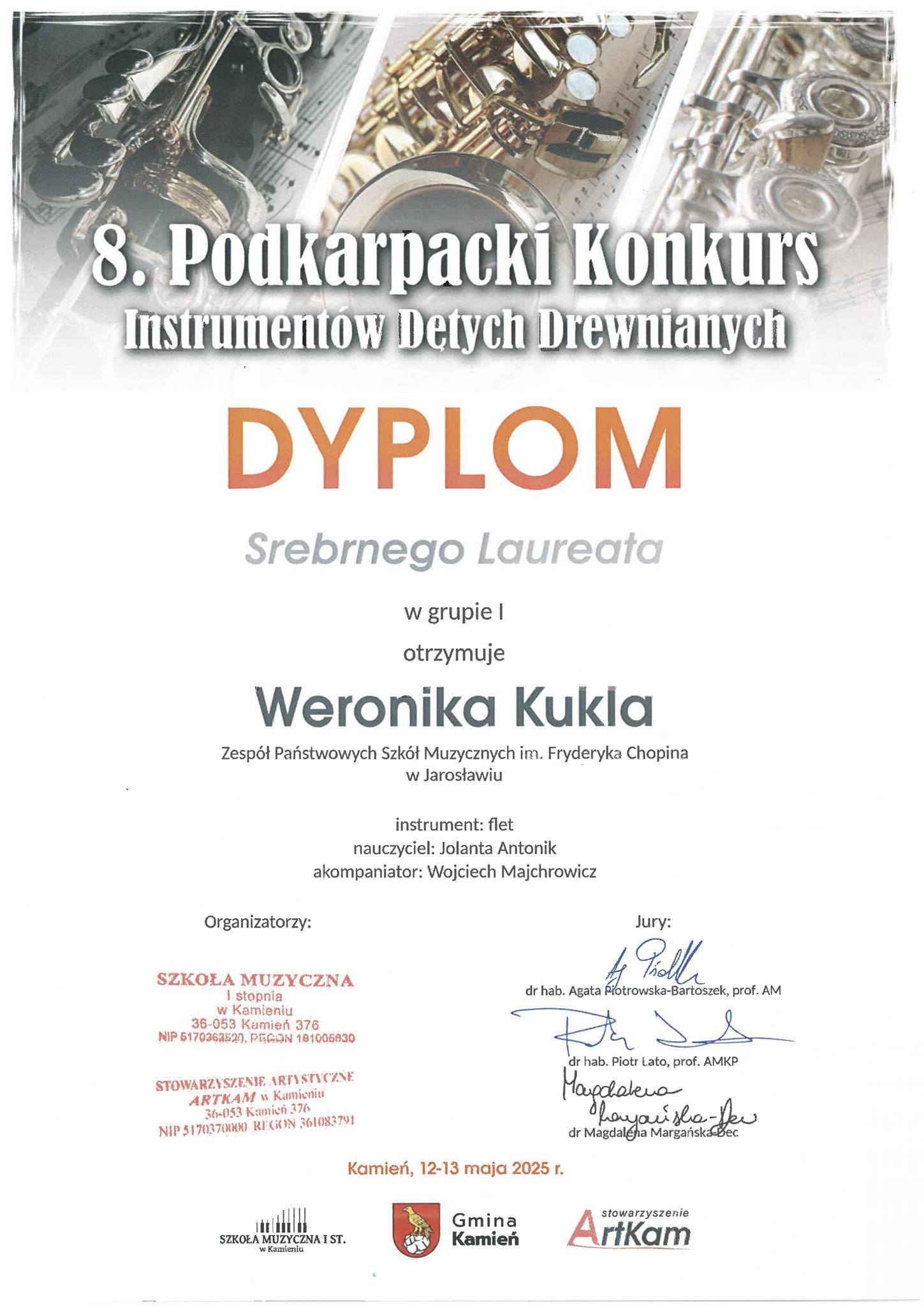 W dniach 12-13.05.2025 w Szkole Muzycznej I stopnia w Kamieniu odbywał się 8 Podkarpacki Konkurs Instrumentów Dętych Drewnianych. Uczennice klasy fletu Pani Jolanty Antonik: Zofia Wilk oraz Weronika Kukla w w/w konkursie w pierwszej grupie zdobyły dyplom: Zofia Wilk - złotego laureata zaś Weronika Kukla - srebrnego laureata. Na fortepianie towarzyszył uczennicom Pan Wojciech Majchrowicz, który został wyróżniony za akompaniament. Prezentacje konkursowe oceniało jury w składzie: dr hab. Agata Piotrowska-Bartoszek, prof. AM w Łodzi-przewodnicząca prof. dr hab. Piotr Lato AM w Krakowie dr Magdalena Margańska- Dec AM w Krakowie