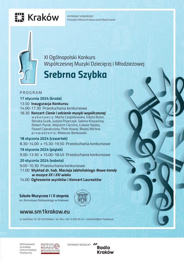 W dniach 17-20 stycznia br. w Szkole Muzycznej I i II stopnia im. Bronisława Rutkowskiego w Krakowie odbył się XI Ogólnopolski Konkurs Współczesnej Muzyki Dziecięcej i Młodzieżowej „Srebrna Szybka”, nad którym patronat ma Centrum Edukacji Artystycznej w Warszawie. Celem Festiwalu jest promowanie współczesnych trendów, technik kompozytorskich i wykonawczych wśród uczniów i pedagogów szkół muzycznych na poziomie pierwszego i drugiego stopnia nauczania. Nazwa festiwalu pochodzi od tytułu piosenki dla dzieci, autorstwa jednego z najwybitniejszych kompozytorów polskich XX wieku – Witolda Lutosławskiego. W tegorocznej edycji udział wzięło 87 solistów oraz 10 zespołów kameralnych z całej Polski, których oceniała komisja w składzie: