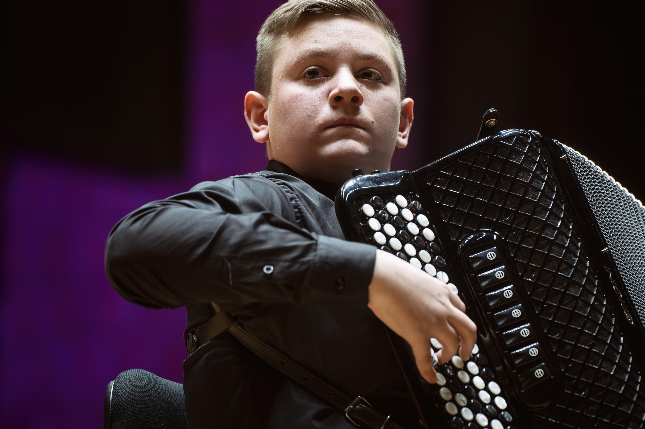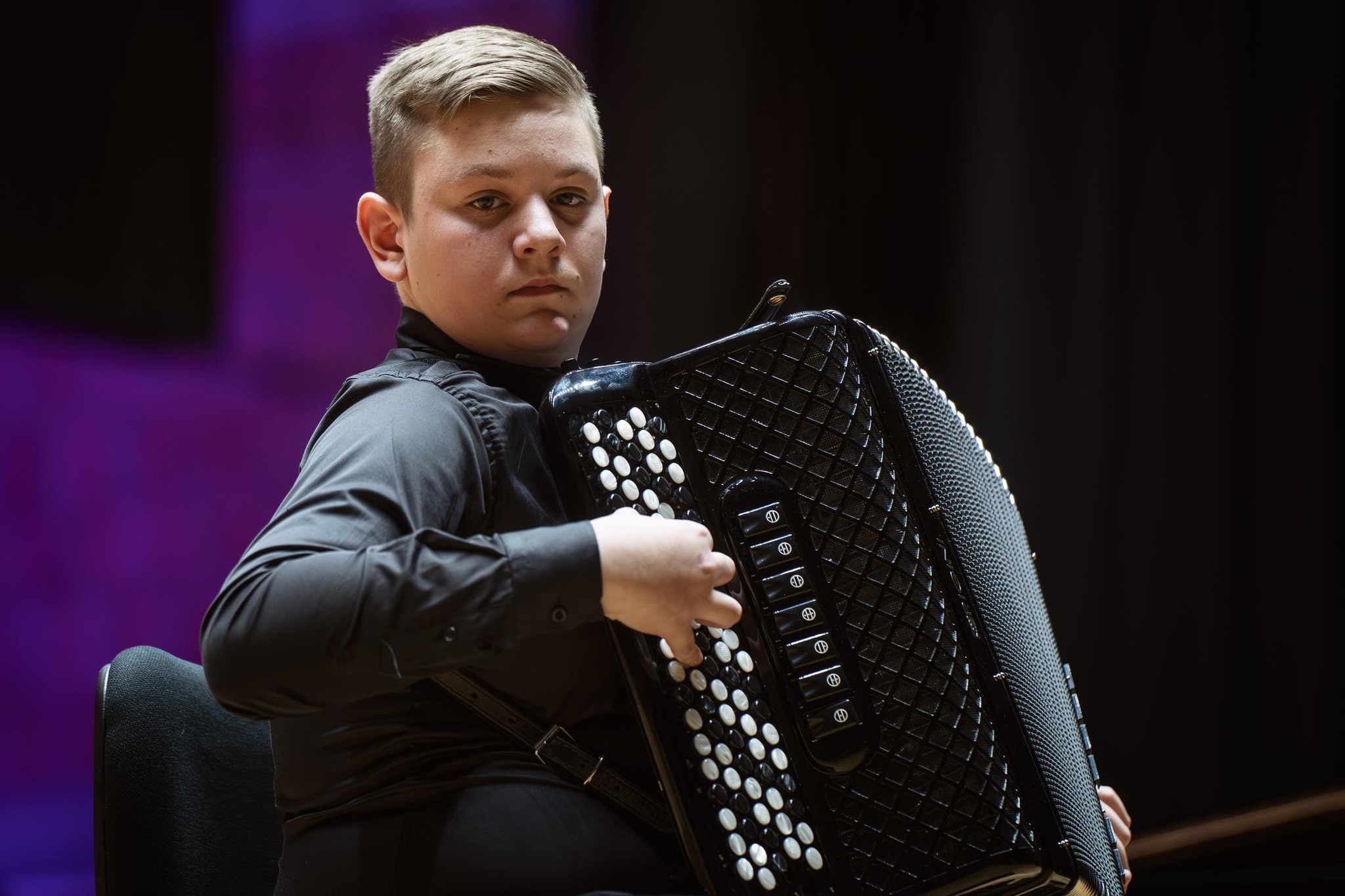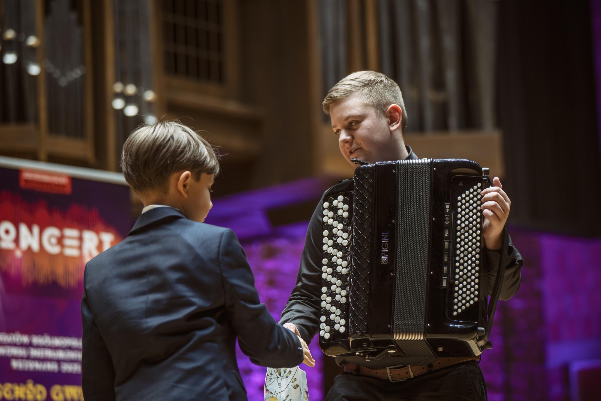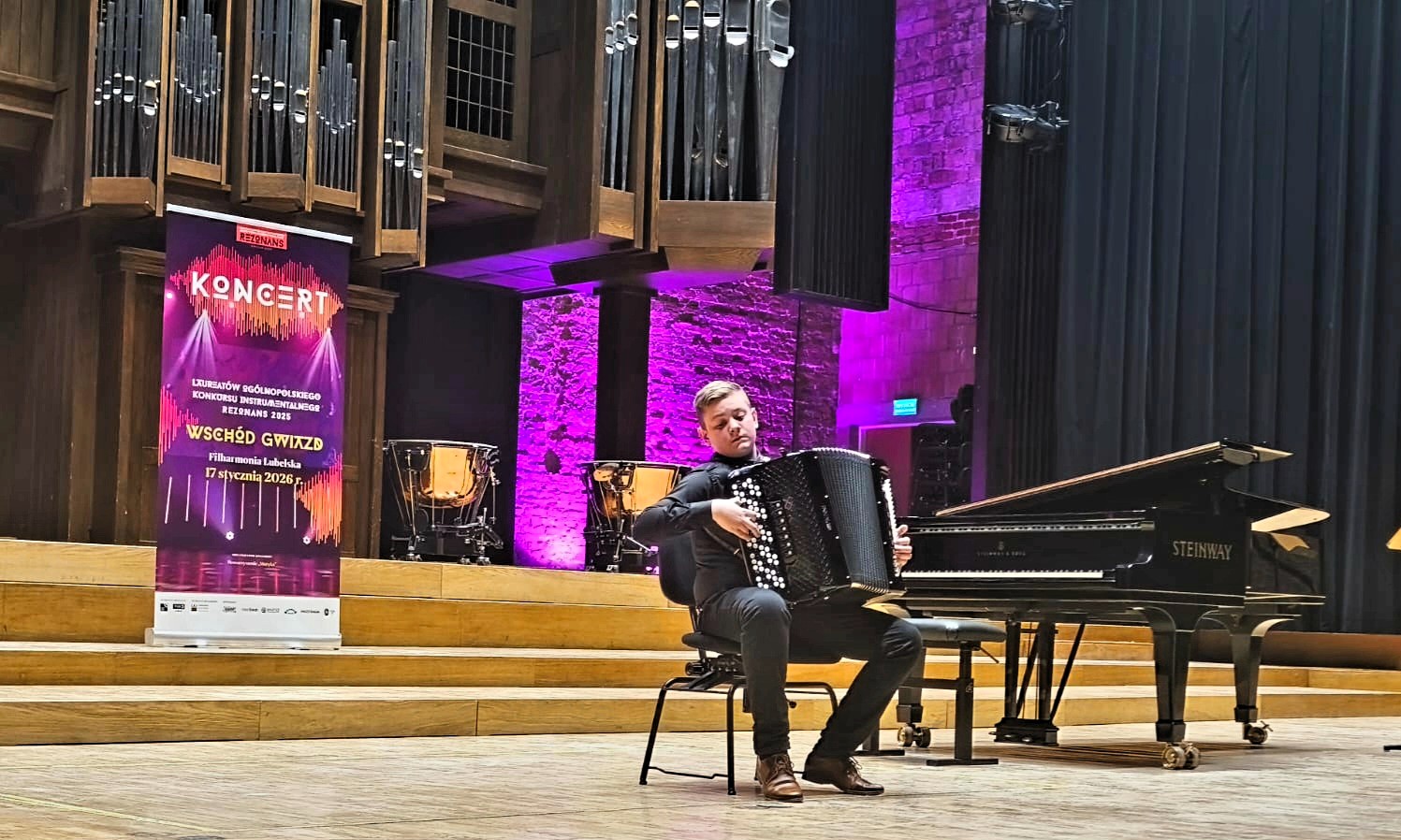 Szeroki plan na scenę Filharmonii Lubelskiej. Na środku siedzi młody muzyk grający na akordeonie. Obok niego stoi czarny fortepian marki Steinway oraz wysoki roll-up koncertowy. W tle monumentalne organy i kotły symfoniczne, podświetlone na fioletowo.