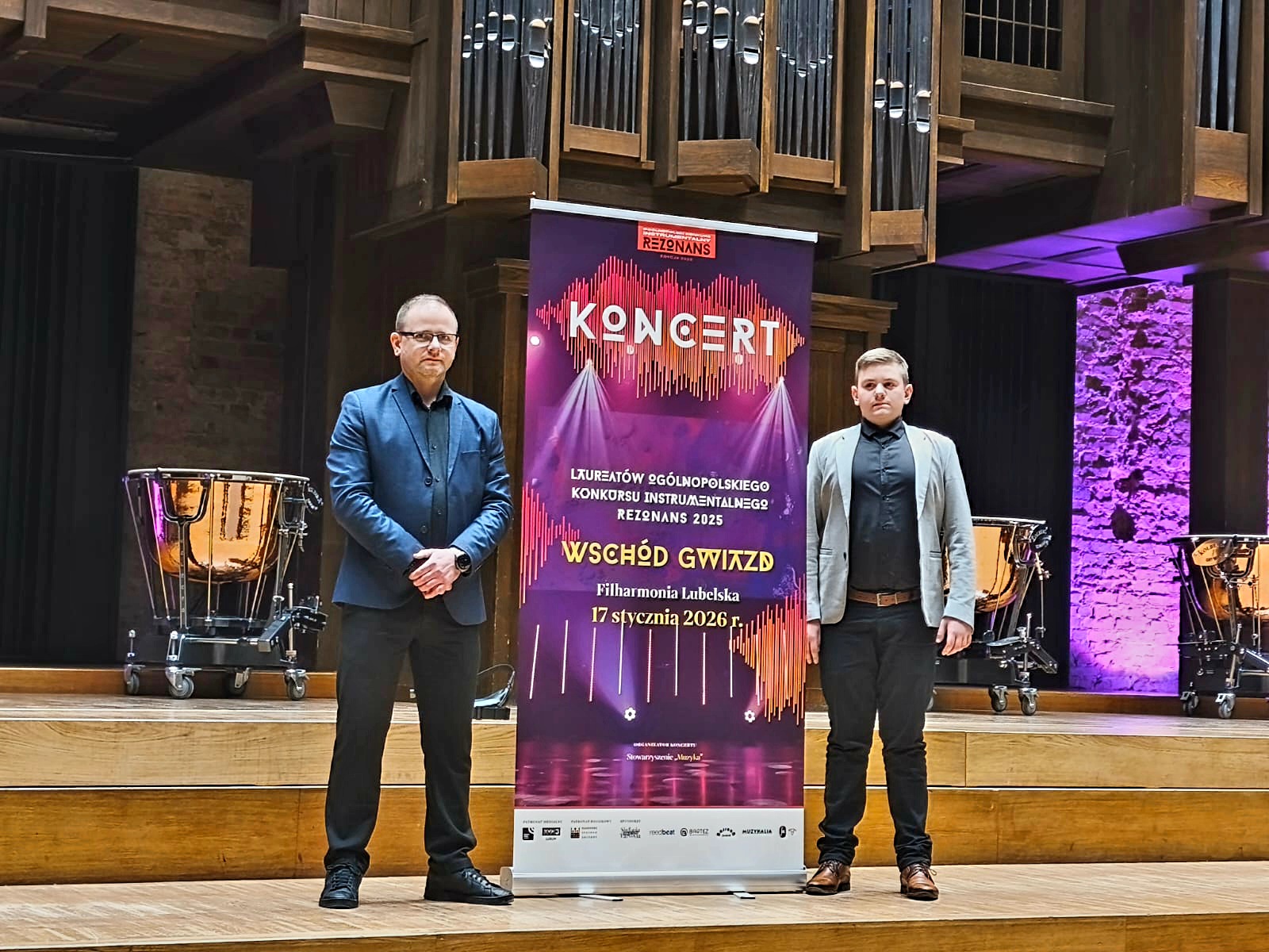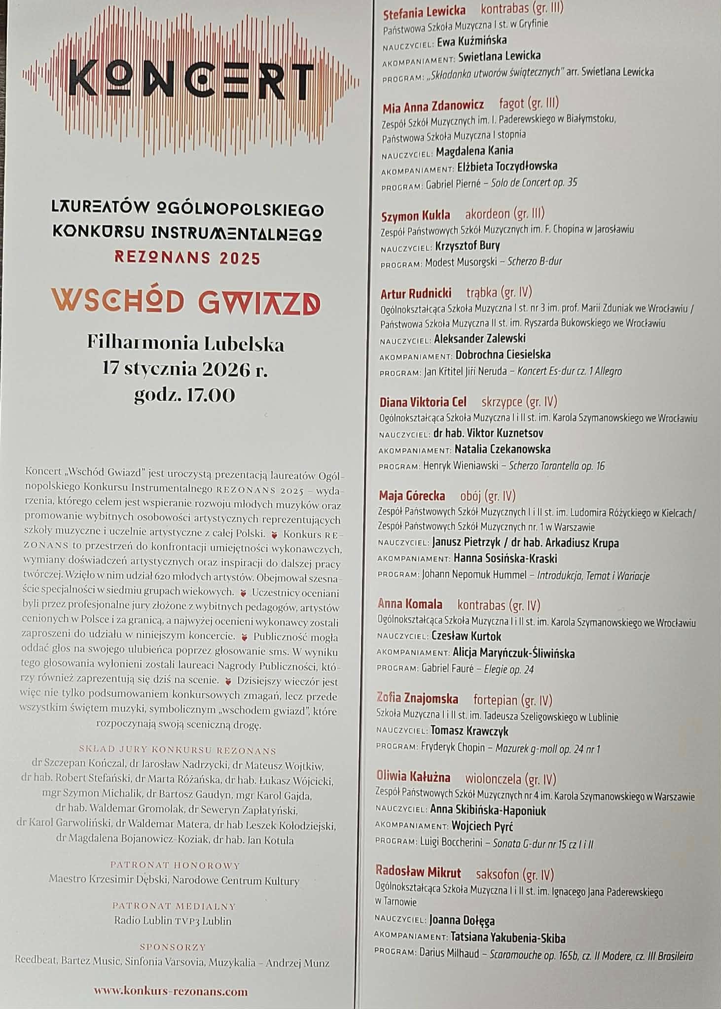 17 stycznia br. w Sali Koncertowej Filharmonii Lubelskiej odbył się koncert "Wschód Gwiazd", na który zaproszeni zostali laureaci pierwszych miejsc oraz Grand Prix Ogólnopolskiego Konkursu Instrumentalnego REZONANS. Na scenie zaprezentowali się uczniowie z całej Polski – młodzi artyści, którzy zachwycili Jury konkursu oraz publiczność w całym kraju. Patronat honorowy objął Maestro Krzesimir Dębski – kompozytor i dyrygent, oraz Narodowe Centrum Kultury w Warszawie, a koncert relacjonowany był m. in. w Polskim Radiu Lublin oraz TVP 3 Lublin. Z wielką dumą informujemy, że wśród 24 zaproszonych wykonawców z całej Polski znalazł się Szymon Kukla – uczeń Zespołu Państwowych Szkół Muzycznych im. Fryderyka Chopina w Jarosławiu w klasie Pana mgra Krzysztofa Burego. Szymon, który wygrał swoją kategorię wiekową zdobywając I miejsce podczas koncertu laureatów wykonał utwór Modesta Musorgskiego – Scherzo B – dur, a jego występ nagrodzony został gromkimi brawami zgromadzonej publiczności.