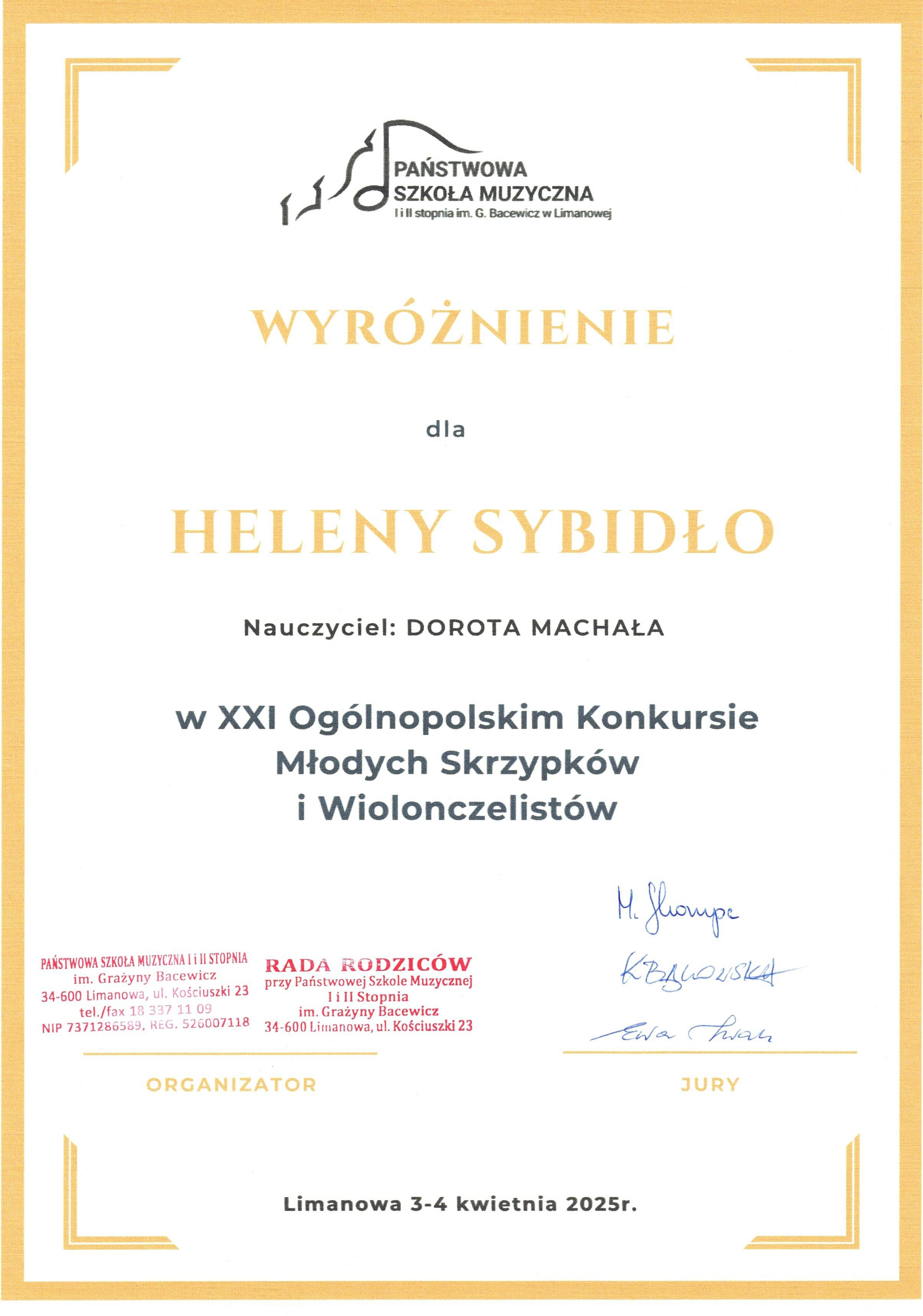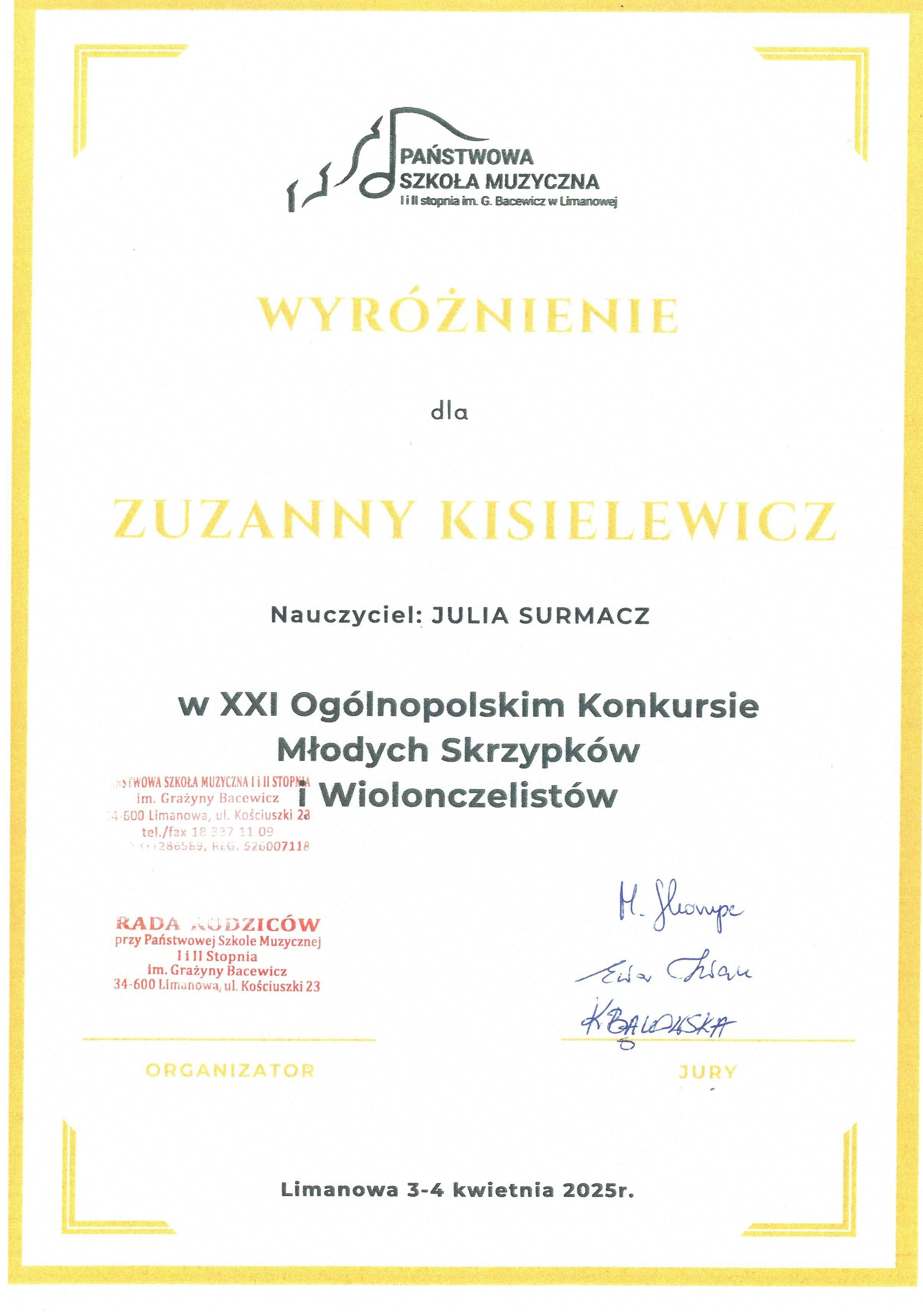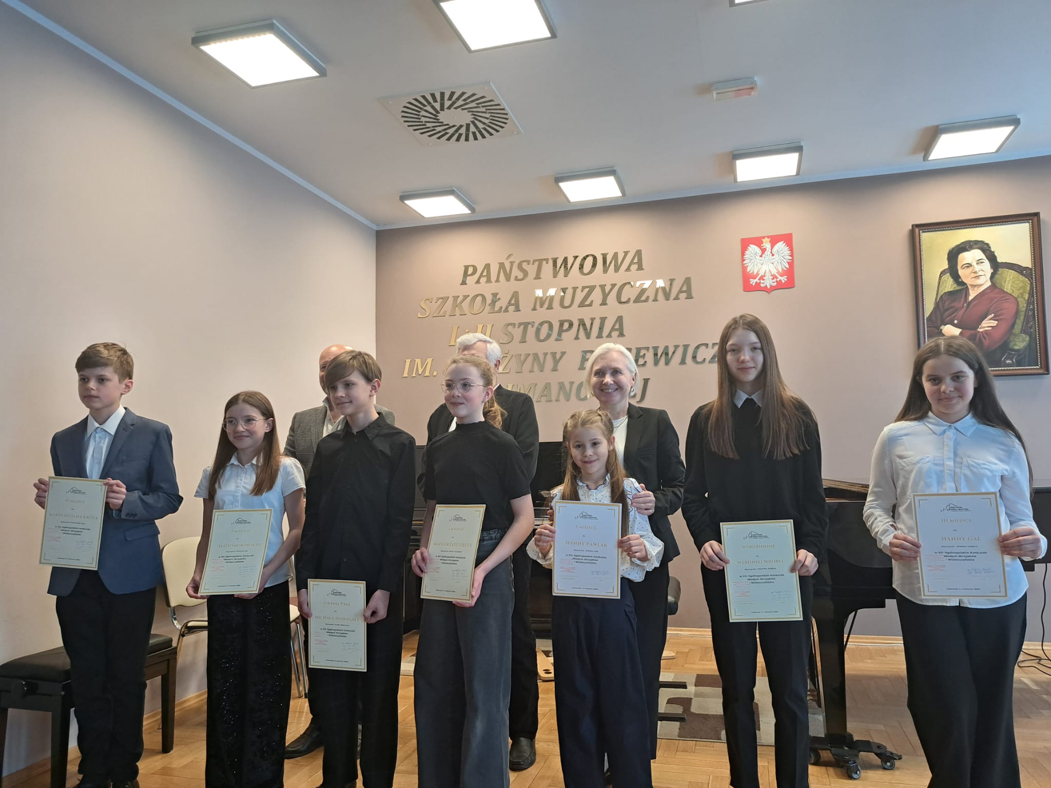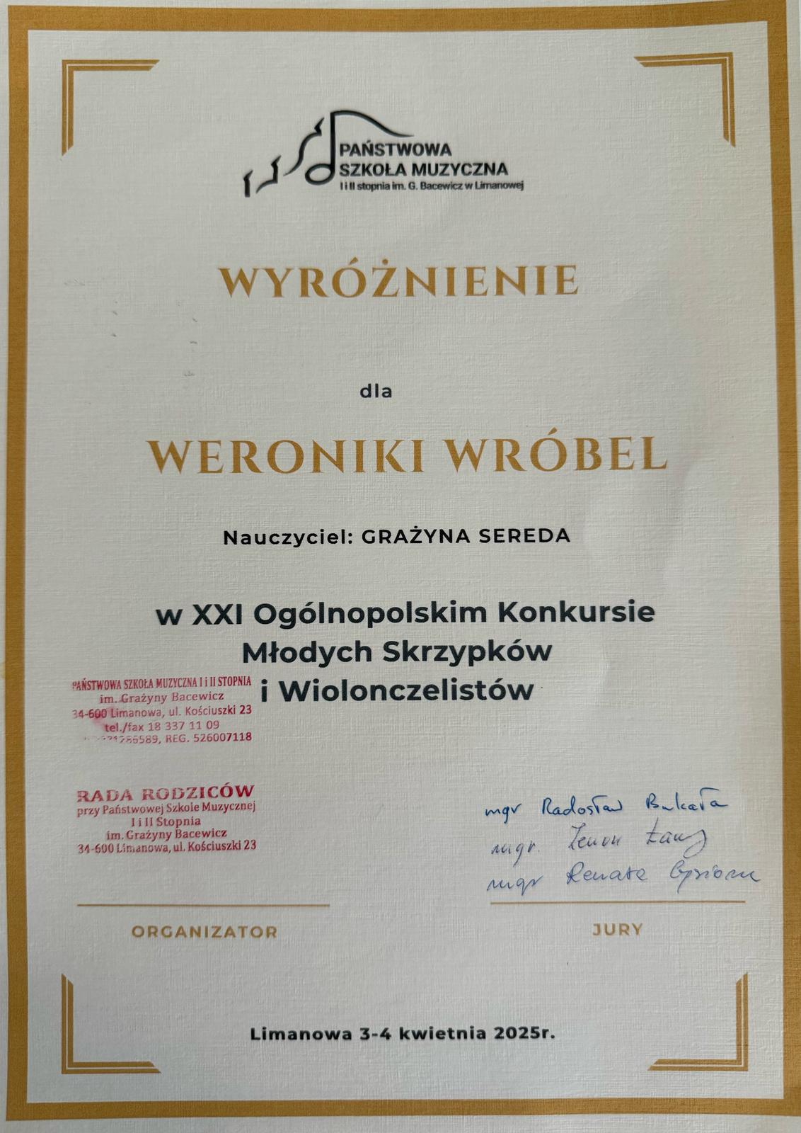 Helena Sybidło z klasy skrzypiec Pani Doroty Machały otrzymała WYRÓŻNIENIE w grupie I, Zuzanna Kisielewicz i Hiacynta Nowak z klasy skrzypiec Pani Julii Surmacz otrzymały WYRÓŻNIENIE w grupie II i grupie III, natomiast Weronika Wróbel z klasy wiolonczeli Pani Grażyny Seredy otrzymała WYRÓŻNIENIE w grupie III.