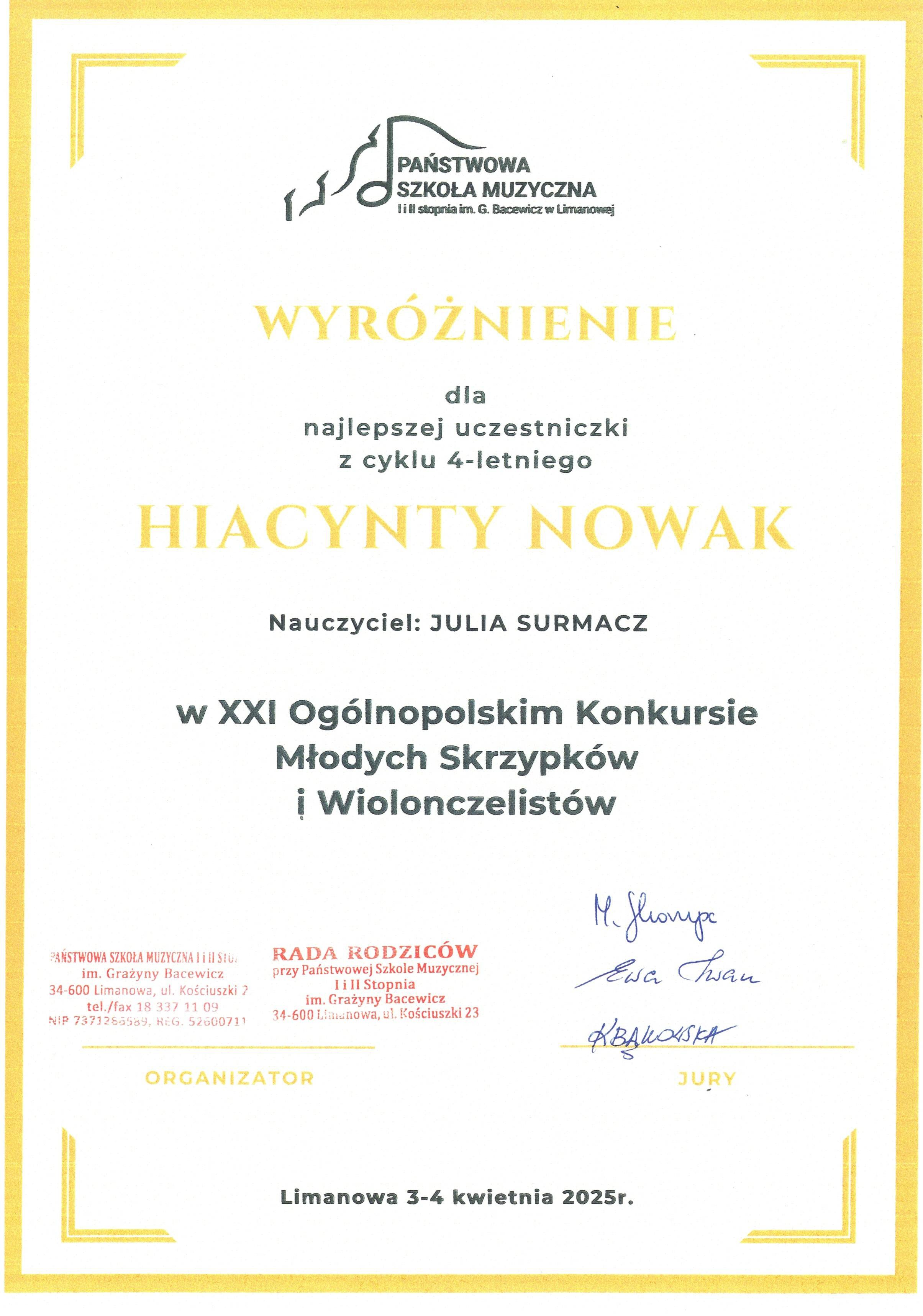 W dniach 3 i 4 kwietnia 2025 roku uczennice naszej szkoły wzięły udział w XXI Ogólnopolskim Konkursie Młodych Skrzypków i Wiolonczelistów, który odbył się w Państwowej Szkole Muzycznej I i II stopnia im. Grażyny Bacewicz w Limanowej. Niezmiernie miło jest nam poinformować o ich sukcesach!