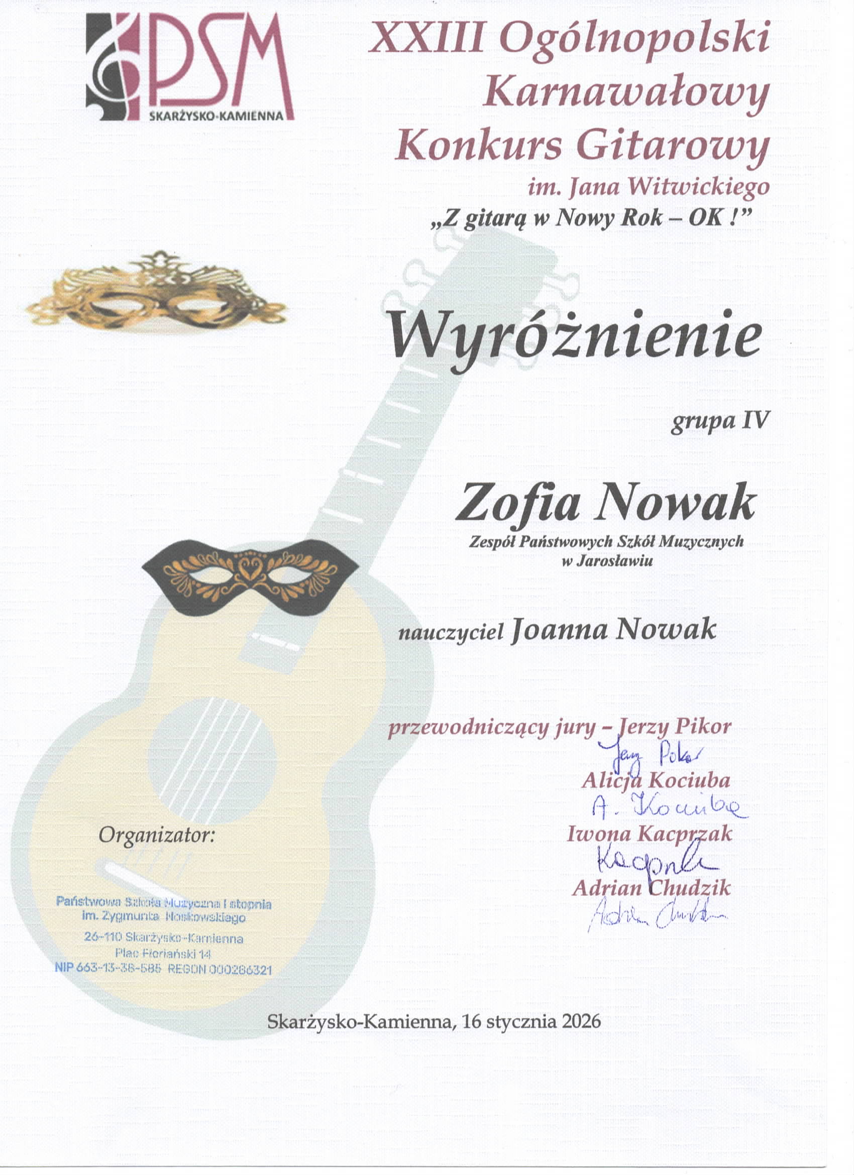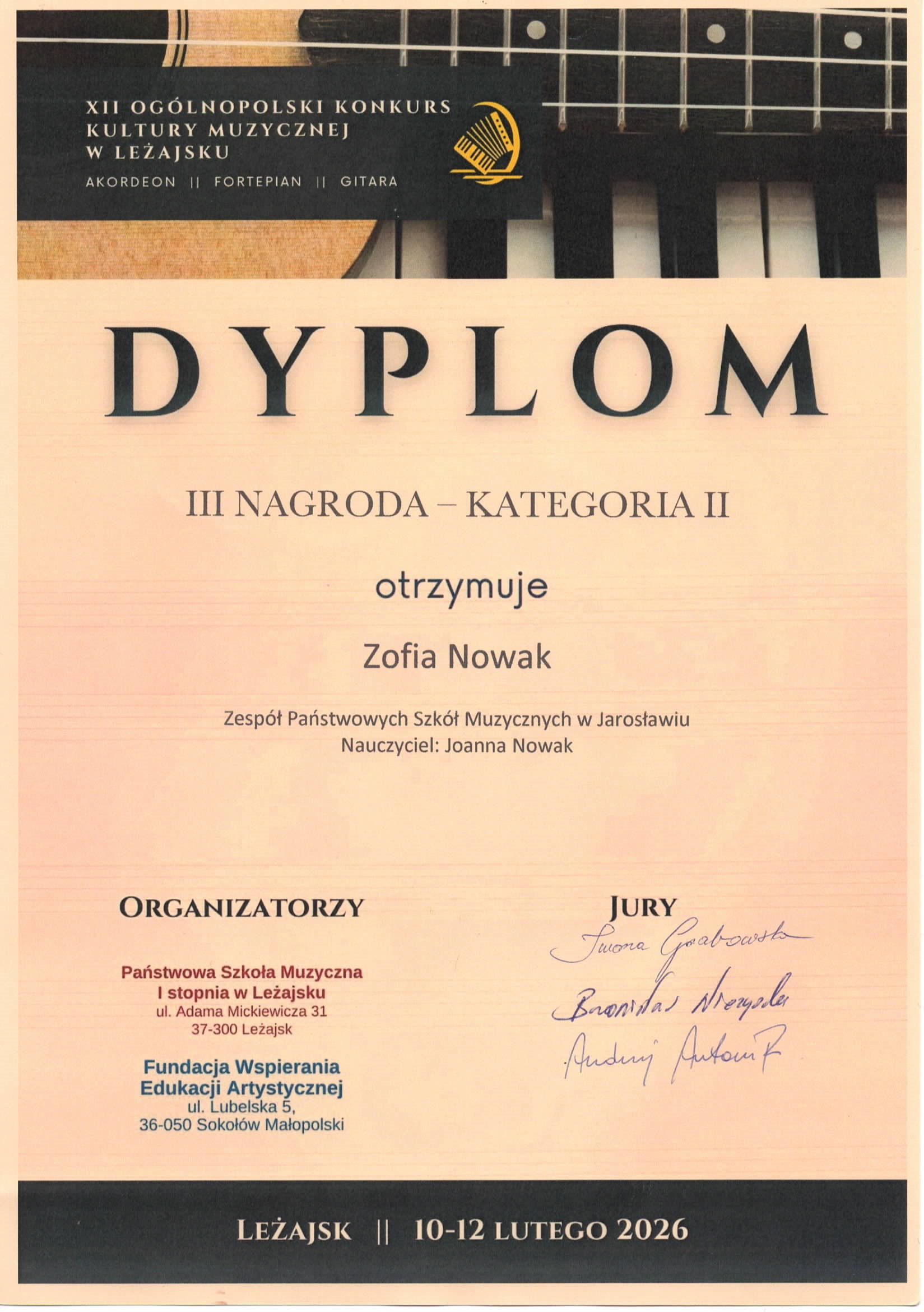 Dnia 10 lutego 2026 r. odbył się XII Ogólnopolski Konkurs Kultury Muzycznej w Leżajsku. Nasze gitarzystki z klasy p. Joanny Nowak zostały laureatkami tego wydarzenia. Gabriela Dominik (kl. 1/6) oraz Otylia Kowalczuk (kl. 1/4) zdobyły wyróżnienia, natomiast Zofia Nowak (kl. 5/6) wywalczyła III nagrodę. Zofia odniosła sukces również wcześniej – 16 stycznia 2026 r. otrzymała wyróżnienie na XIII Ogólnopolskim Konkursie Gitarowym w Skarżysku-Kamiennej.