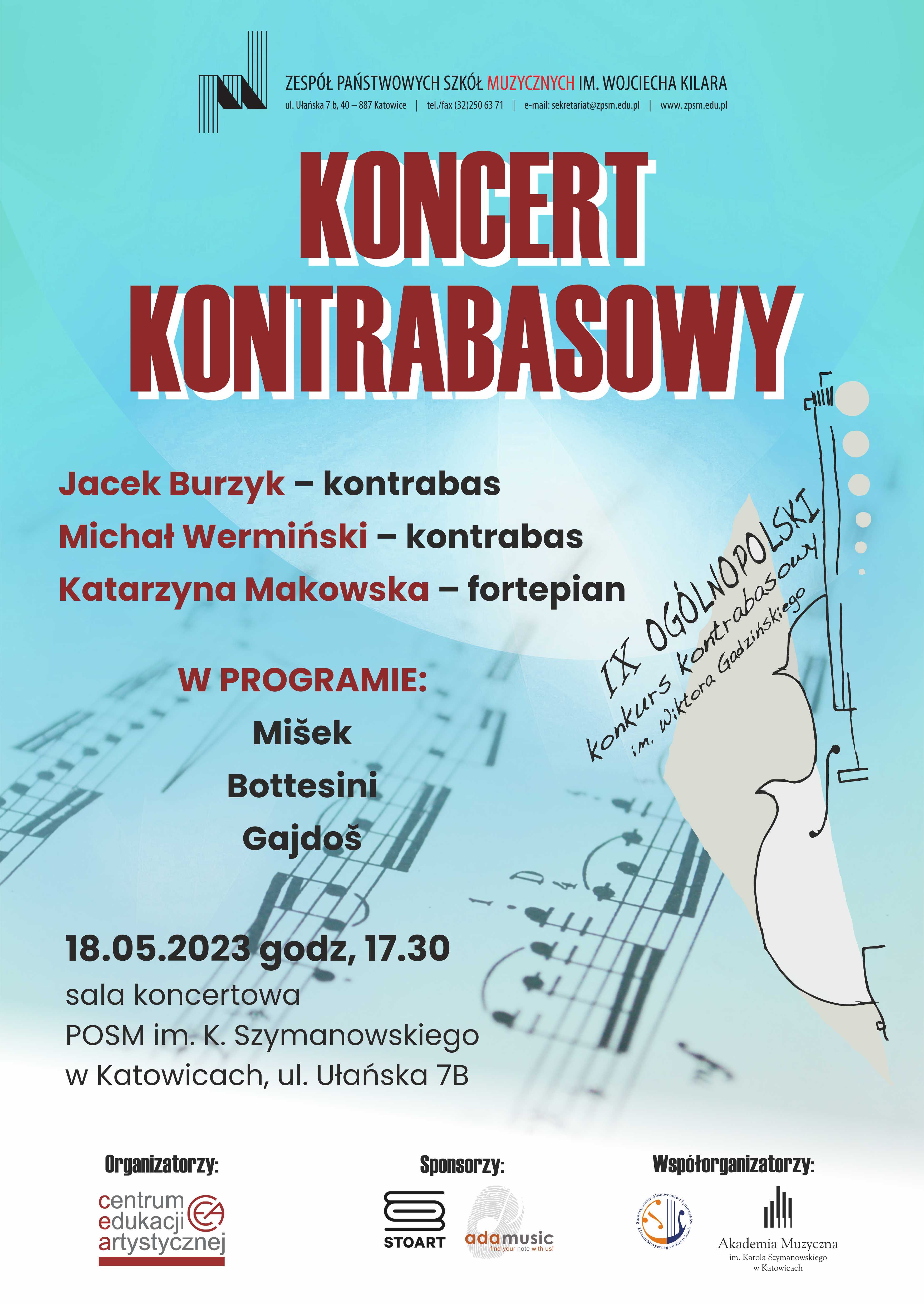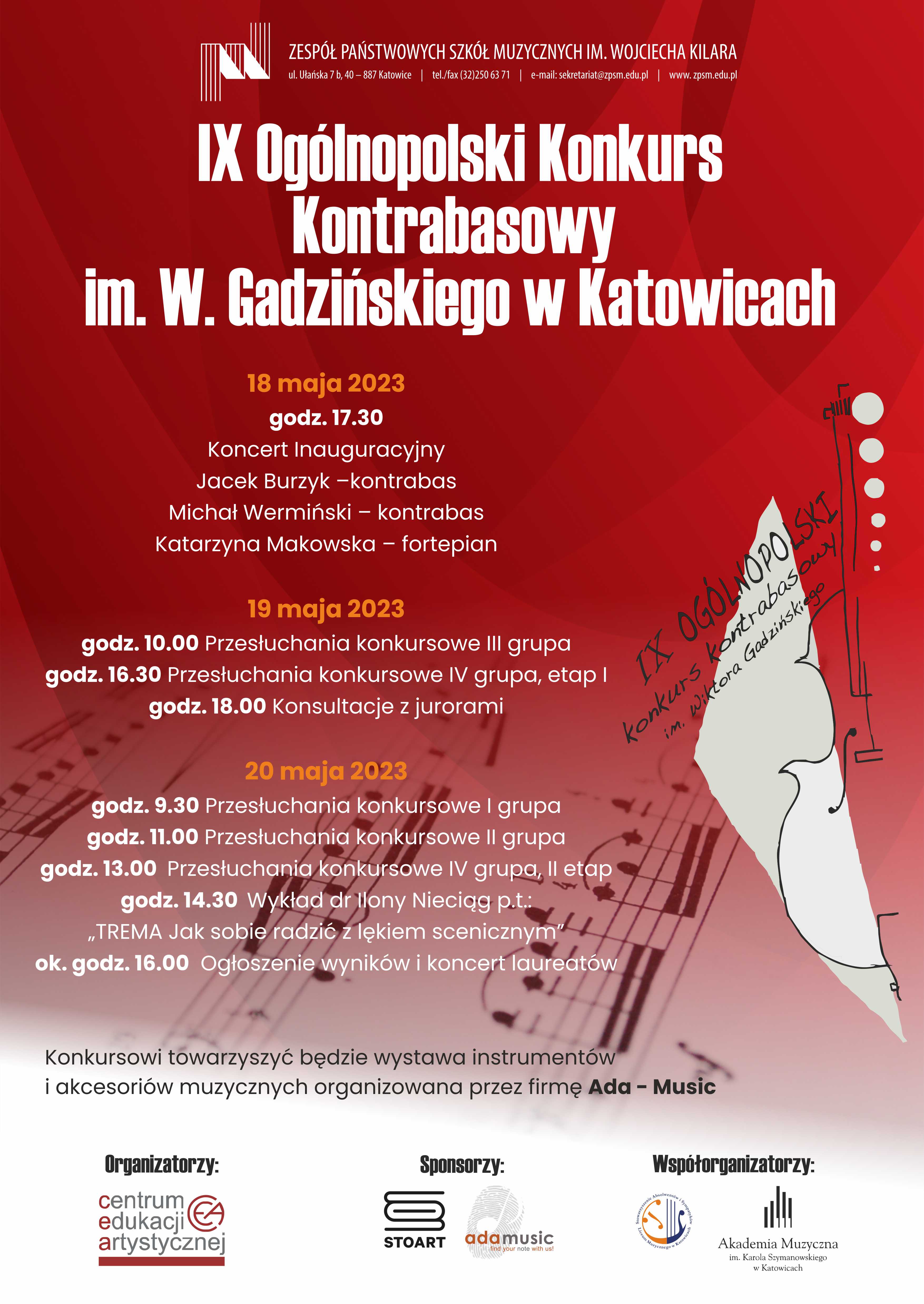 dyrektorzy szkół muzycznych, nauczyciele klas kontrabasu, uczniowie-kontrabasiści, serdecznie zapraszamy do udziału w IX Ogólnopolskim Konkursie Kontrabasowym im. Wiktora Gadzińskiego, który odbędzie się w dniach 18-20 maja 2023 roku w ZPSM im. W. Kilara w Katowicach.