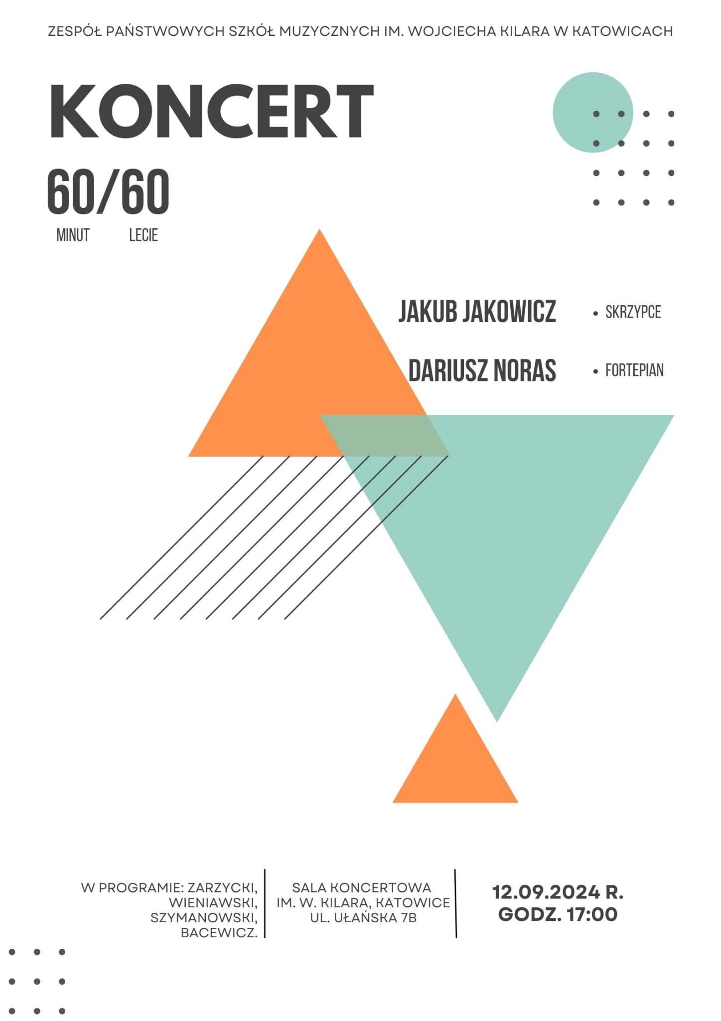 Zapraszamy w czwartek, 12.09.2024 r. o godz. 17.00 na koncert znakomitych muzyków: Jakuba Jakowicza (skrzypce) i Dariusza Norasa (fortepian). W programie utwory m. in.: H. Wieniawskiego, K. Szymanowskiego, G. Bacewicz.