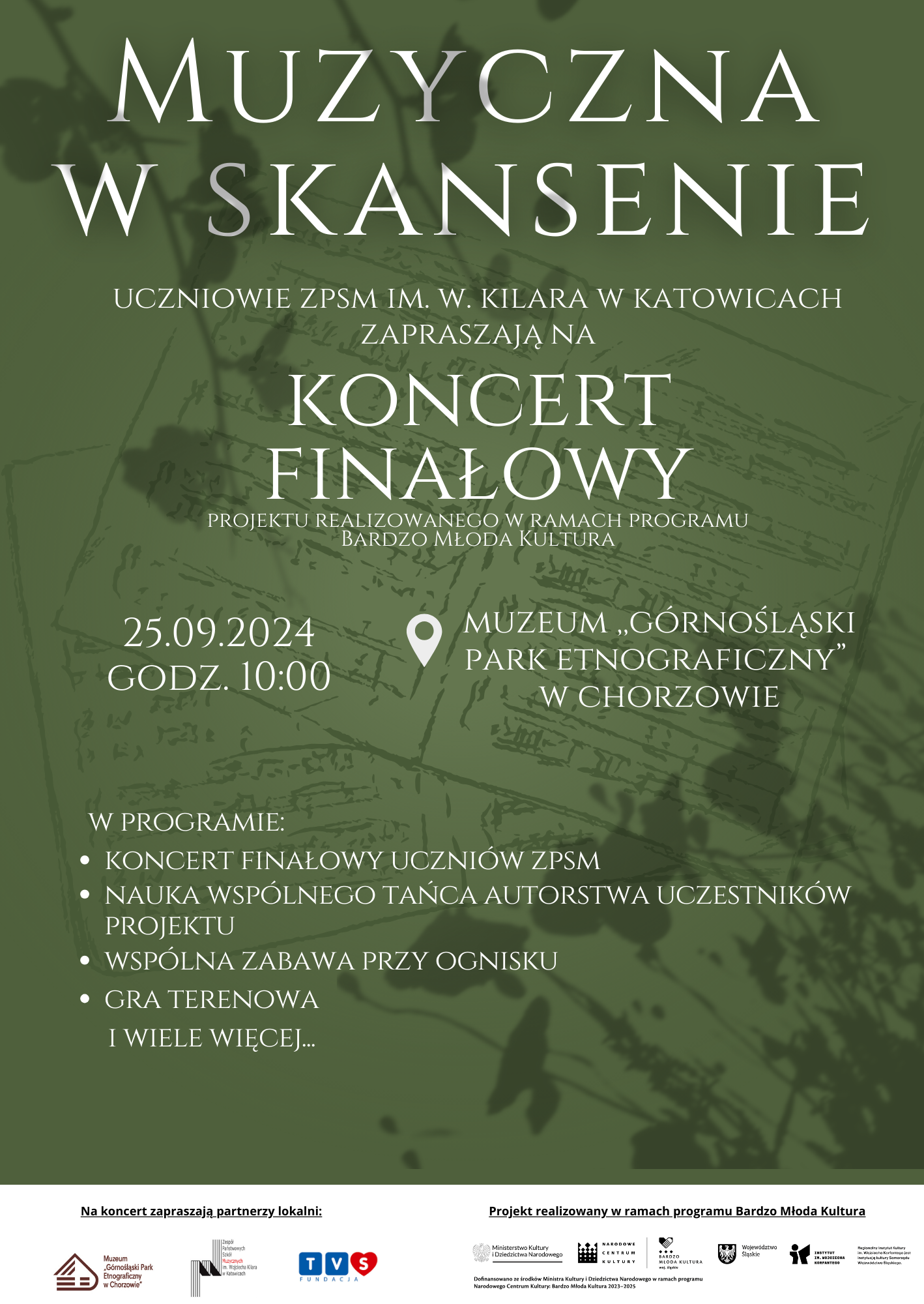 Koncert stanowi finał realizowanego przez naszą szkołę projektu Bardzo Młoda Kultura, w którym współpracujemy jako partnerstwo lokalne z Muzeum "Górnośląski Park Etnograficzny" w Chorzowie oraz Fundacją Telewizji TVS. Projekt realizowany jest w ramach programu Narodowego Centrum Kultury Bardzo Młoda Kultura 2023-2025.
