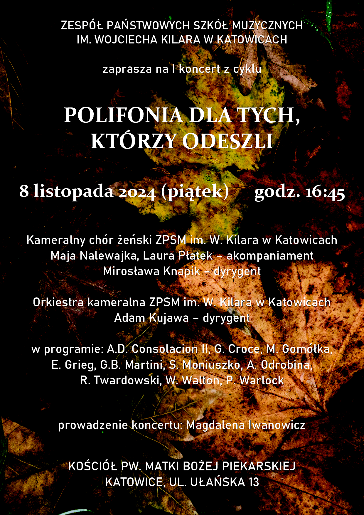 Zapraszamy na I koncert z cyklu POLIFONIA DLA TYCH, KTÓRZY ODESZLI 8 listopada 2024 (piątek) godz. 16:45