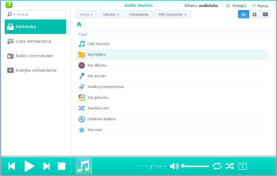 Założone jest jedno wspólne konto użytkownika o nazwie audioteka (hasła nie podajemy).