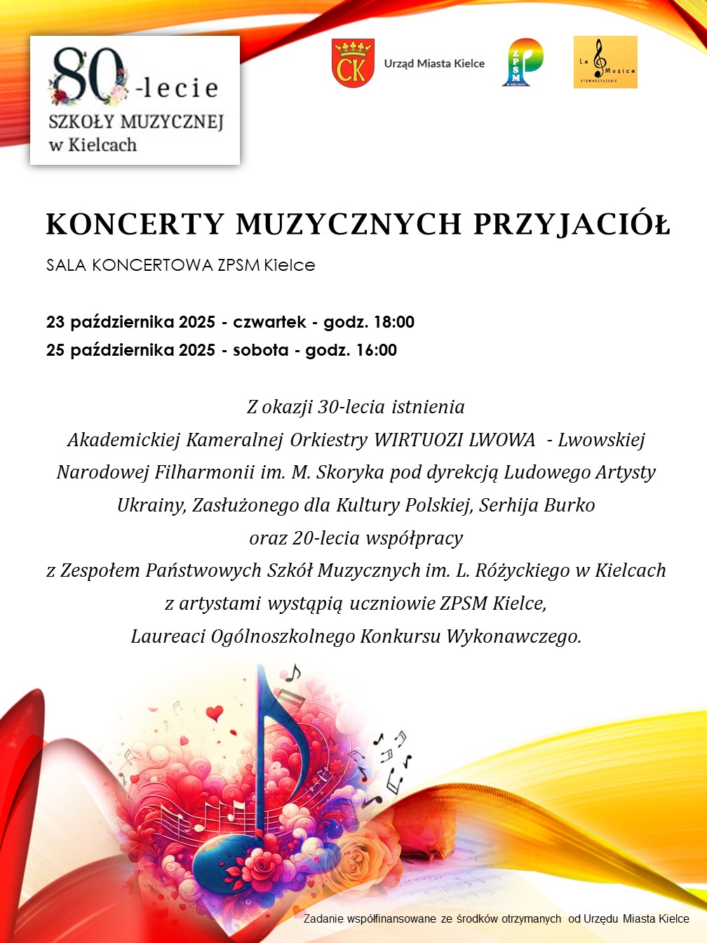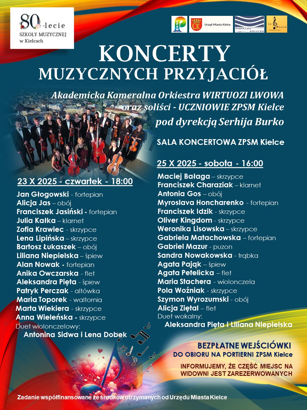 25.10.2025 - sobota - godz. 16:00Z okazji 20-lecia współpracy z Zespołem Państwowych Szkół Muzycznych im. L. Różyckiego w Kielcach oraz 30-lecia istnienia Akademickiej Kameralnej Orkiestry WIRTUOZI LWOWA - Lwowskiej Narodowej Filharmonii im. M. Skoryka pod dyrekcją Ludowego Artysty Ukrainy, Zasłużonego dla Kultury Polskiej, Serhija Burko, z artystami wystąpią uczniowie ZPSM Kielce, Laureaci Ogólnoszkolnego Konkursu Wykonawczego.