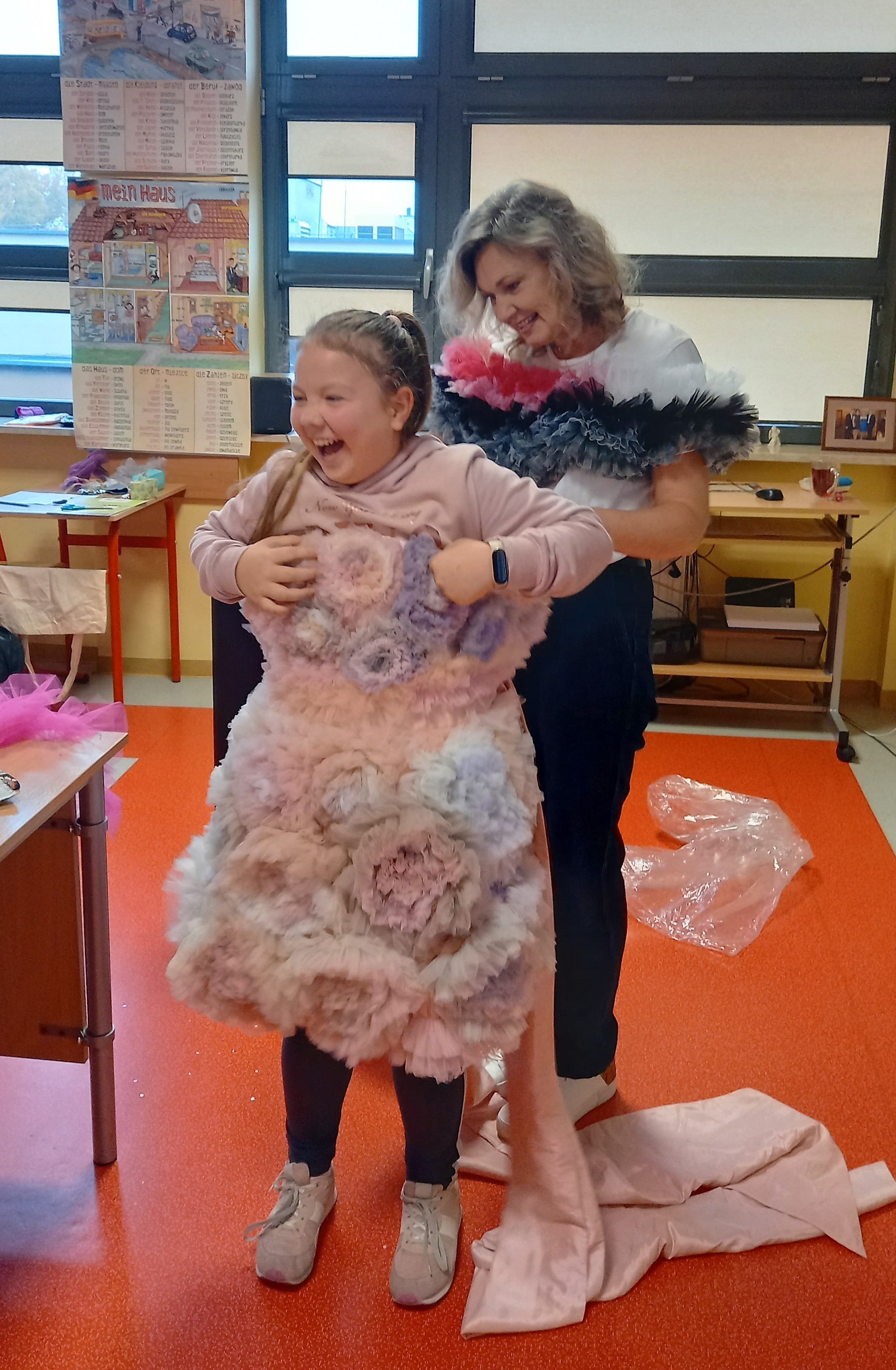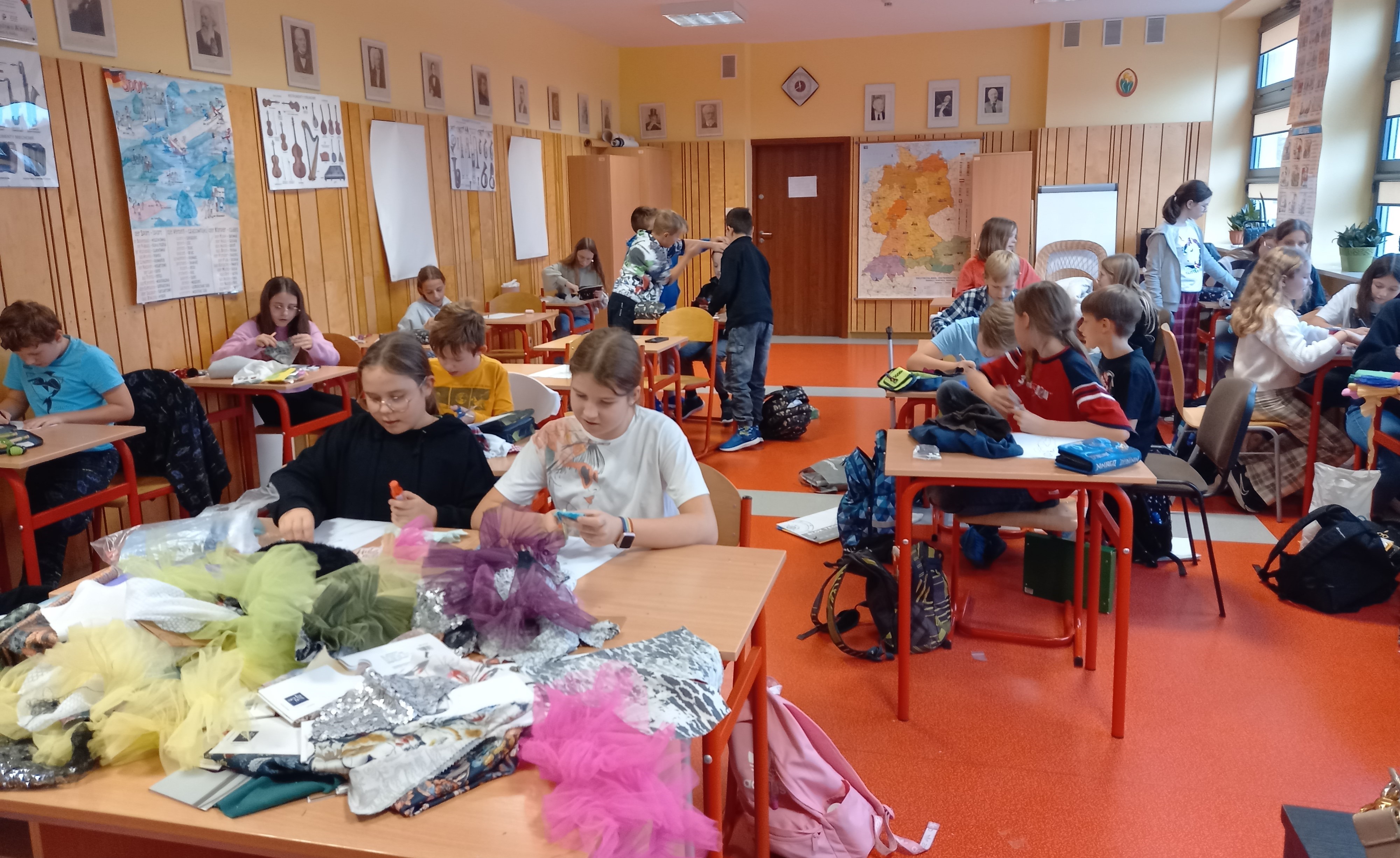 a następnie poprowadził warsztaty. Pod czujnym okiem p. Justyny Petelickiej uczniowie na kartkach wyklejali projekty ubrań według własnych pomysłów, wykorzystując różne materiały: włókna, bibułę, tasiemki itp.
