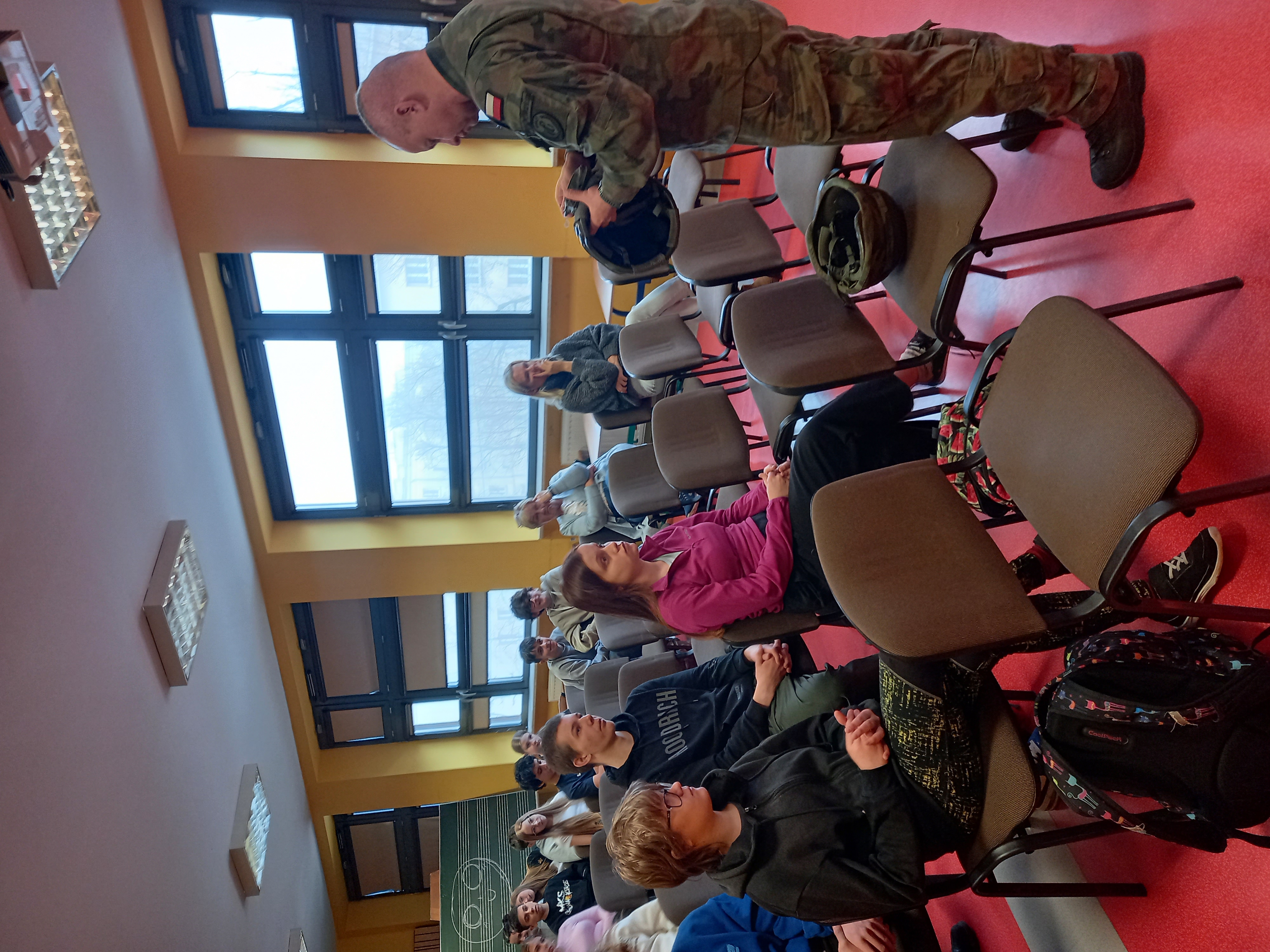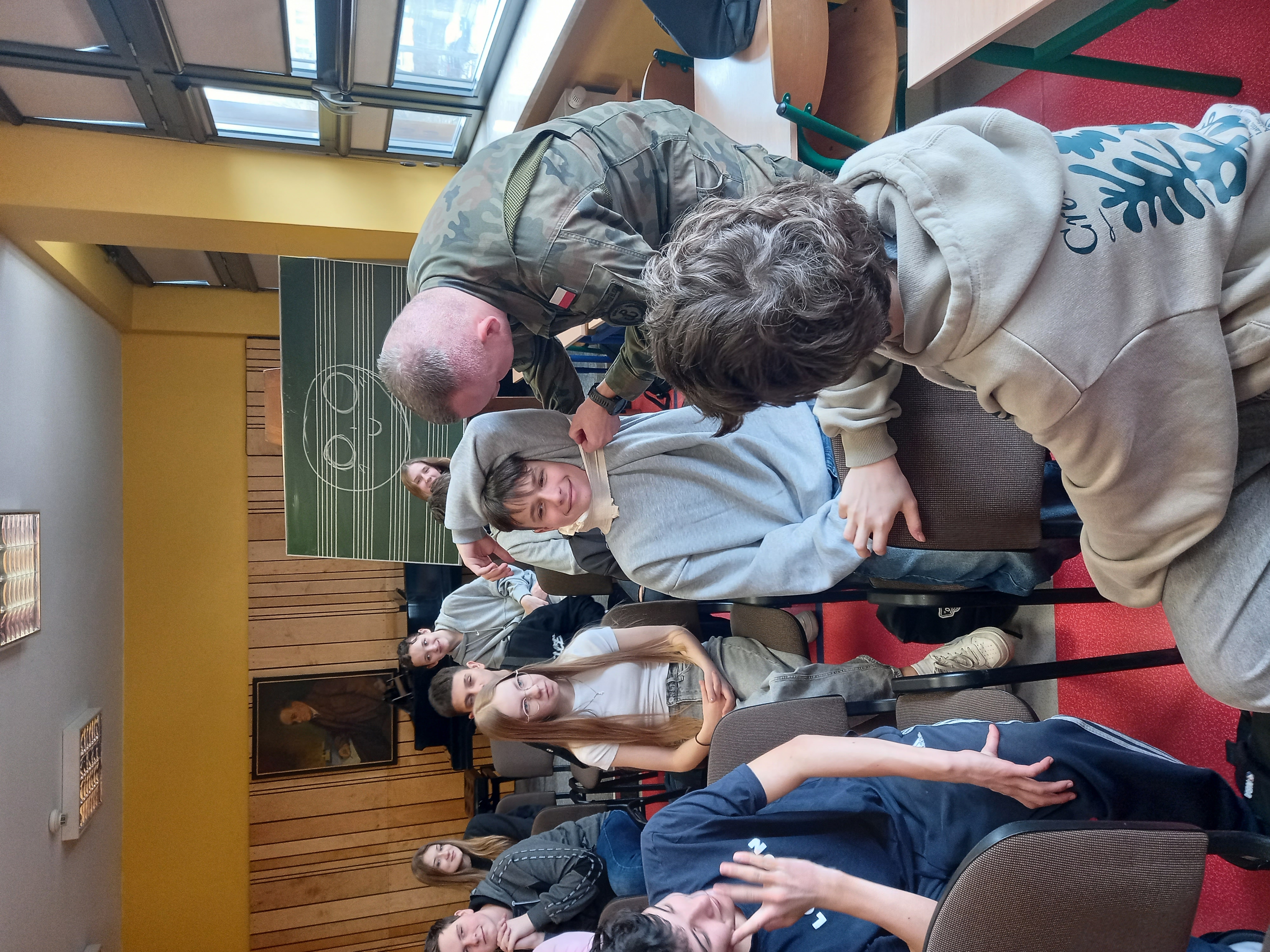 W dniu 25.02. 2025 r. uczniowie klas ósmych oraz pierwszej liceum mieli wyjątkową okazję uczestniczyć w trzygodzinnych zajęciach prowadzonych przez kaprala Mateusza Kwiatkowskiego z 10 Świętokrzyskiej Brygady Wojsk Terytorialnych. Podczas spotkania uczniowie poznali rolę wojsk terytorialnych, zapoznali się z oporządzeniem żołnierza, a także zdobyli praktyczne umiejętności z zakresu pierwszej pomocy i postaw strzeleckich. Było to niezwykle pouczające i inspirujące doświadczenie, które z pewnością pozostanie w pamięci uczestników na długo.