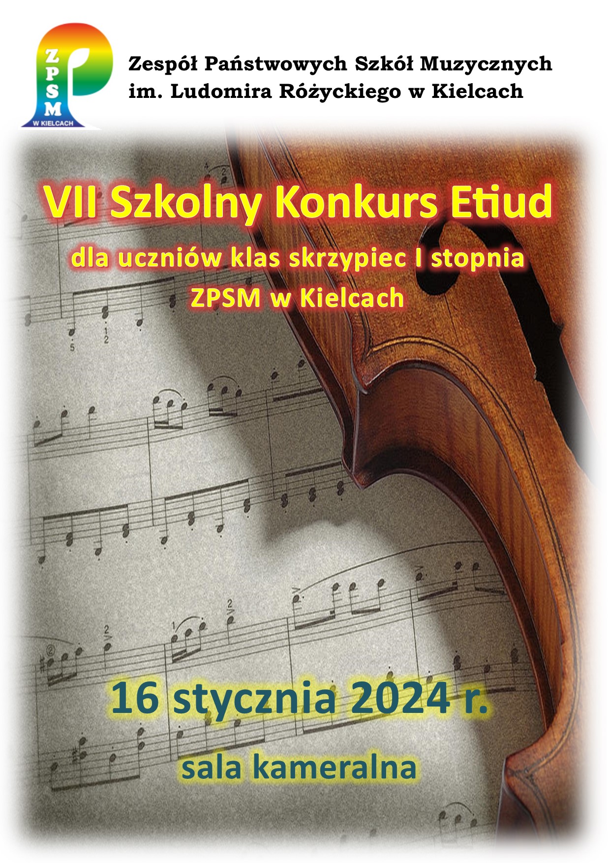 Serdecznie zapraszamy uczniów klas skrzypiec III, IV, V, VI szkól muzycznychI stopnia w ZPSM im. L. Różyckiego w Kielcach do udzaiału w VII Szkolnym Konkursie Etiud - 16.01.2024
