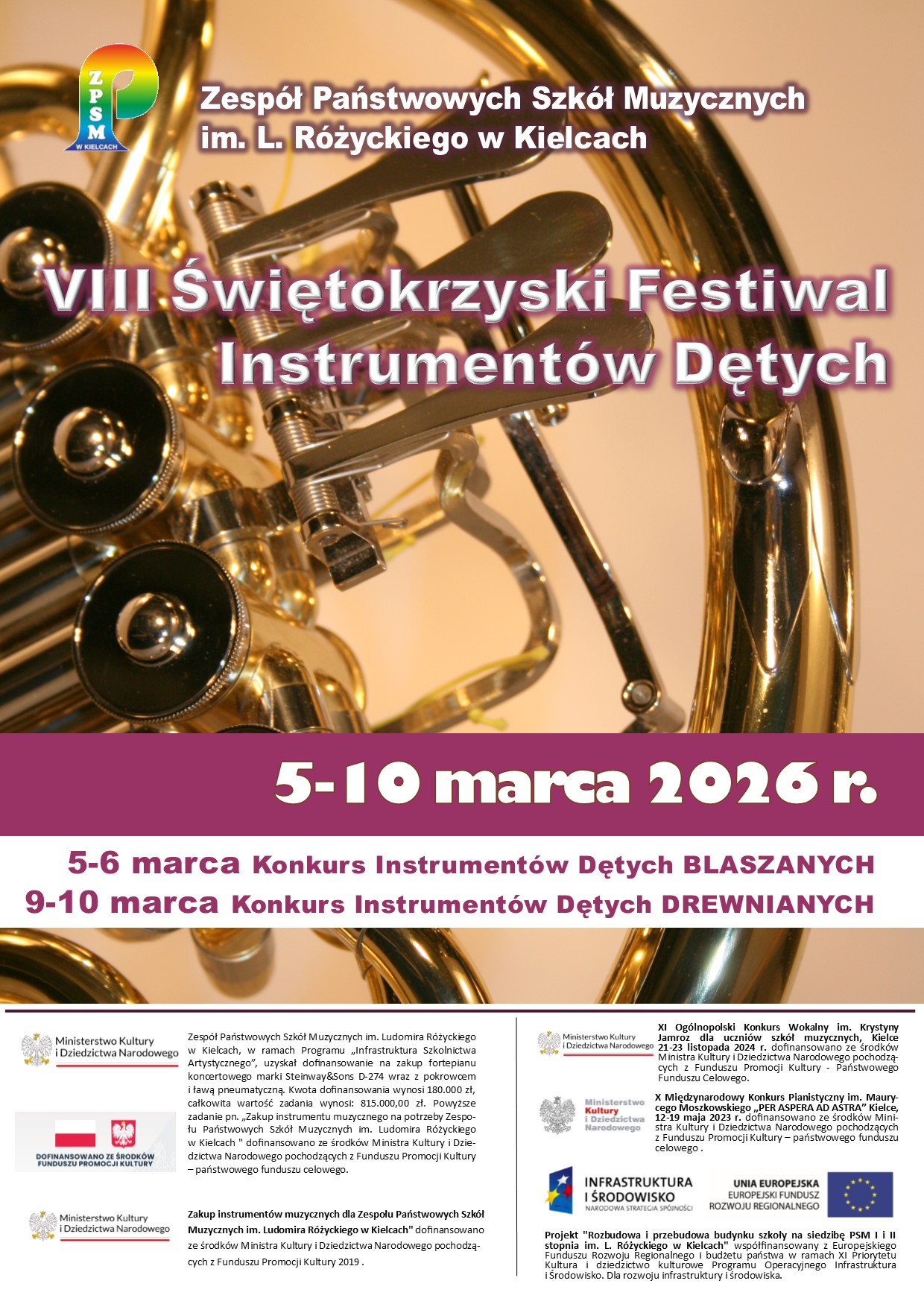 Serdecznie zapraszamy do uczestnictwa w ósmej edycji Świętokrzyskiego Festiwalu Instrumentów Dętych, jaki będzie miał miejsce w Zespole Państwowych Szkół Muzycznych im. L. Różyckiego w Kielcach.