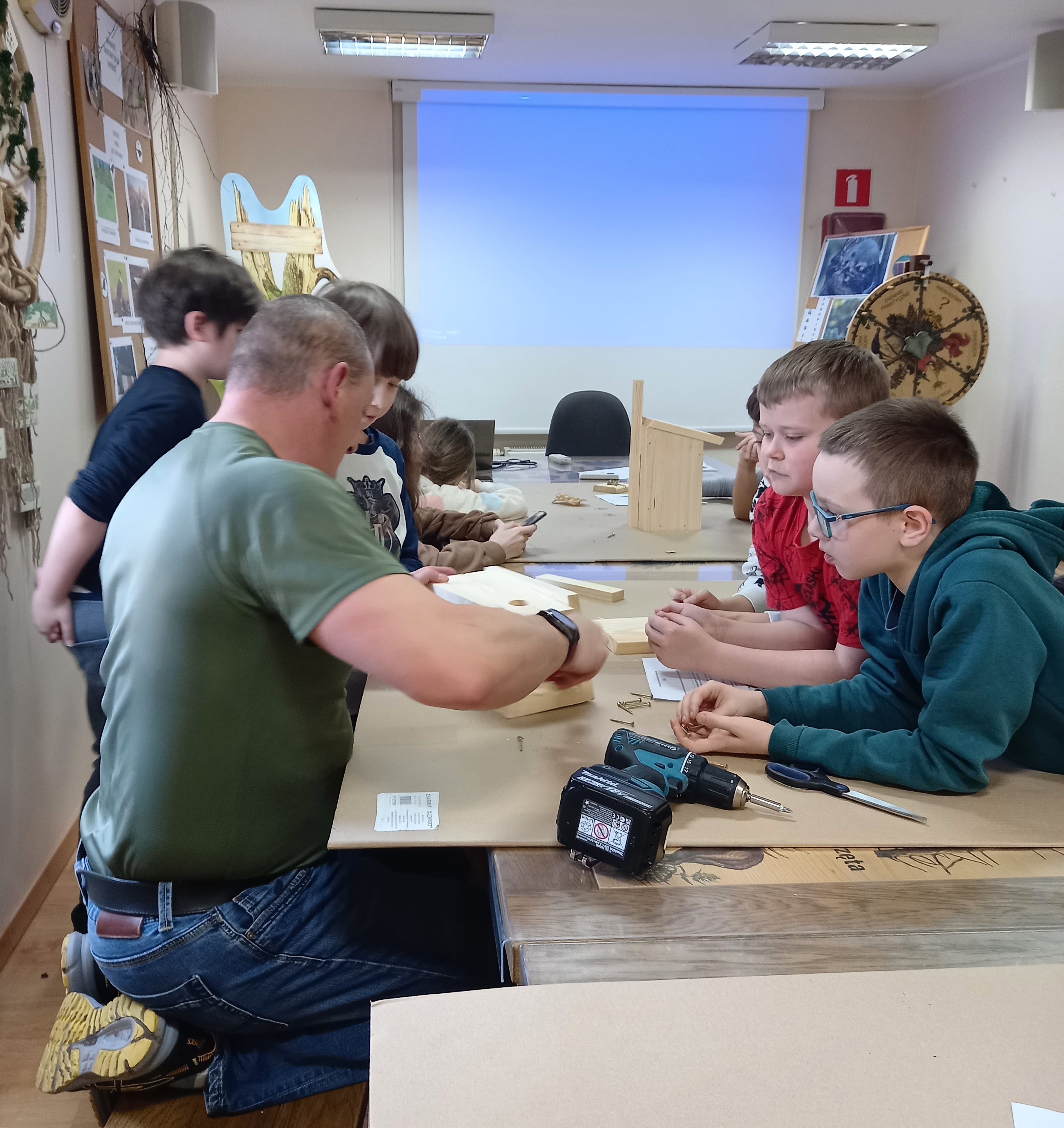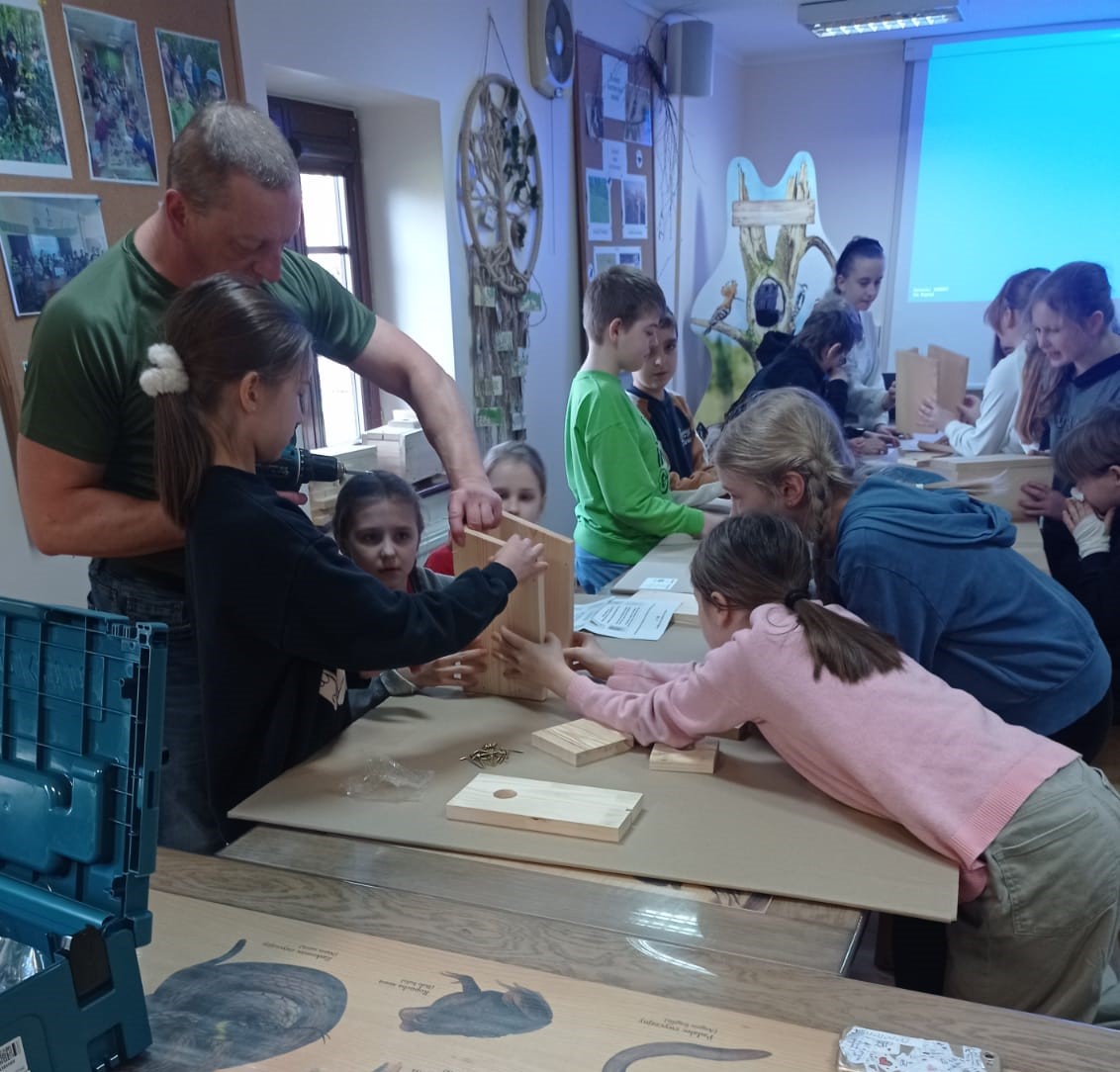 Punktem kulminacyjnym warsztatów było montowanie budek lęgowych dla ptaków. Pod czujnym okiem pana Cezarego Bąka – instruktora technicznego Nadleśnictwa Kielce uczniowie klas czwartych montowali zgodnie z otrzymaną instrukcją budki lęgowe. W sumie nasi czwartoklasiści zmontowali 6 budek lęgowych, które zabrali ze sobą do powieszenia na drzewach.