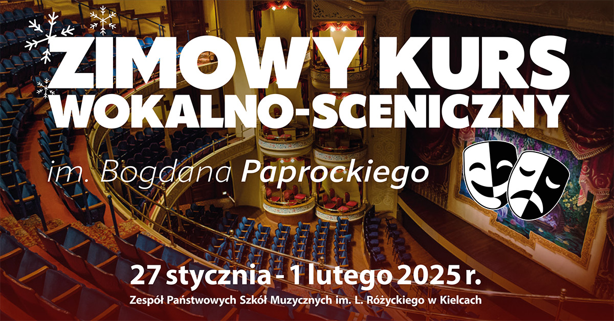 Stowarzyszenie im. Bogdana Paprockiego zaprasza Zimowy Kurs Wokalno-Sceniczny, który jest nowatorskim projektem kompleksowych wokalnych kursów przygotowawczych. Ich celem jest wzbogacenie edukacji uczniów i absolwentów kierunków wokalnych polskich szkół muzycznych II-go stopnia o wiedzę z zakresu śpiewu solowego, ruchu scenicznego i interpretacji aktorskiej. Wykładowcami będą uznani pedagodzy śpiewu, zajęć tanecznych i aktorskich, artyści i pedagodzy z wieloletnim doświadczeniem scenicznym, artystycznym i pedagogicznym.